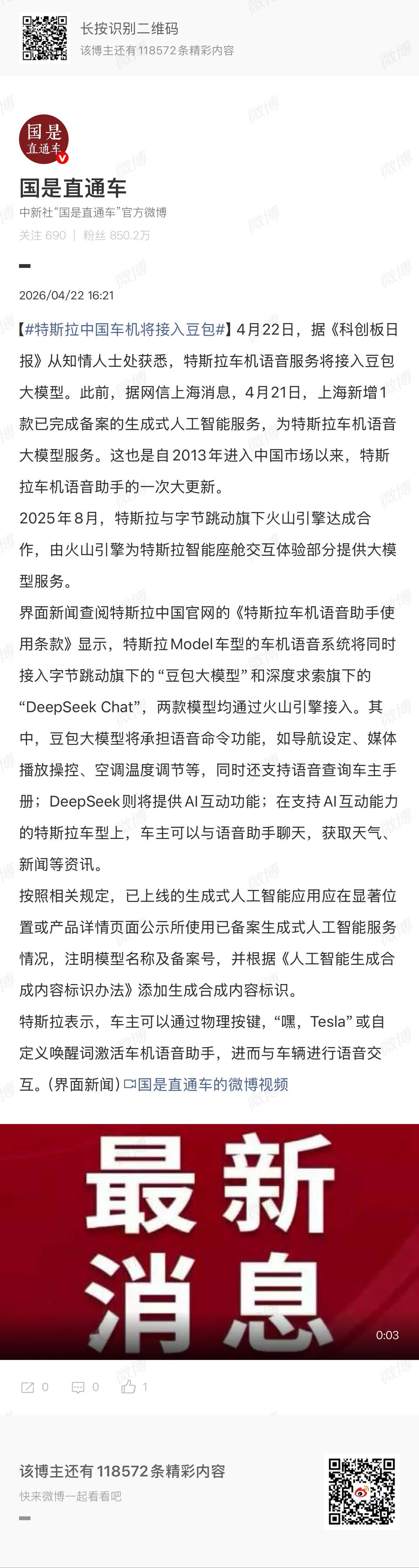 “特斯拉Model车型的车机语音系统将同时接入字节跳动旗下的“豆包大模型”和深度求索旗下的“DeepSeek Chat”,两款模型均通过火山引擎接入。其中,豆包大模型将承担语音命令功能,如导航设定、媒体播放操控、空调温度调节等,同时还支持语音查询车主手册;DeepSeek则将提供AI互动功能;在支持AI互动能力的特斯拉车型上,车主可以与语音助手聊天,获取天气、新闻等资讯。”