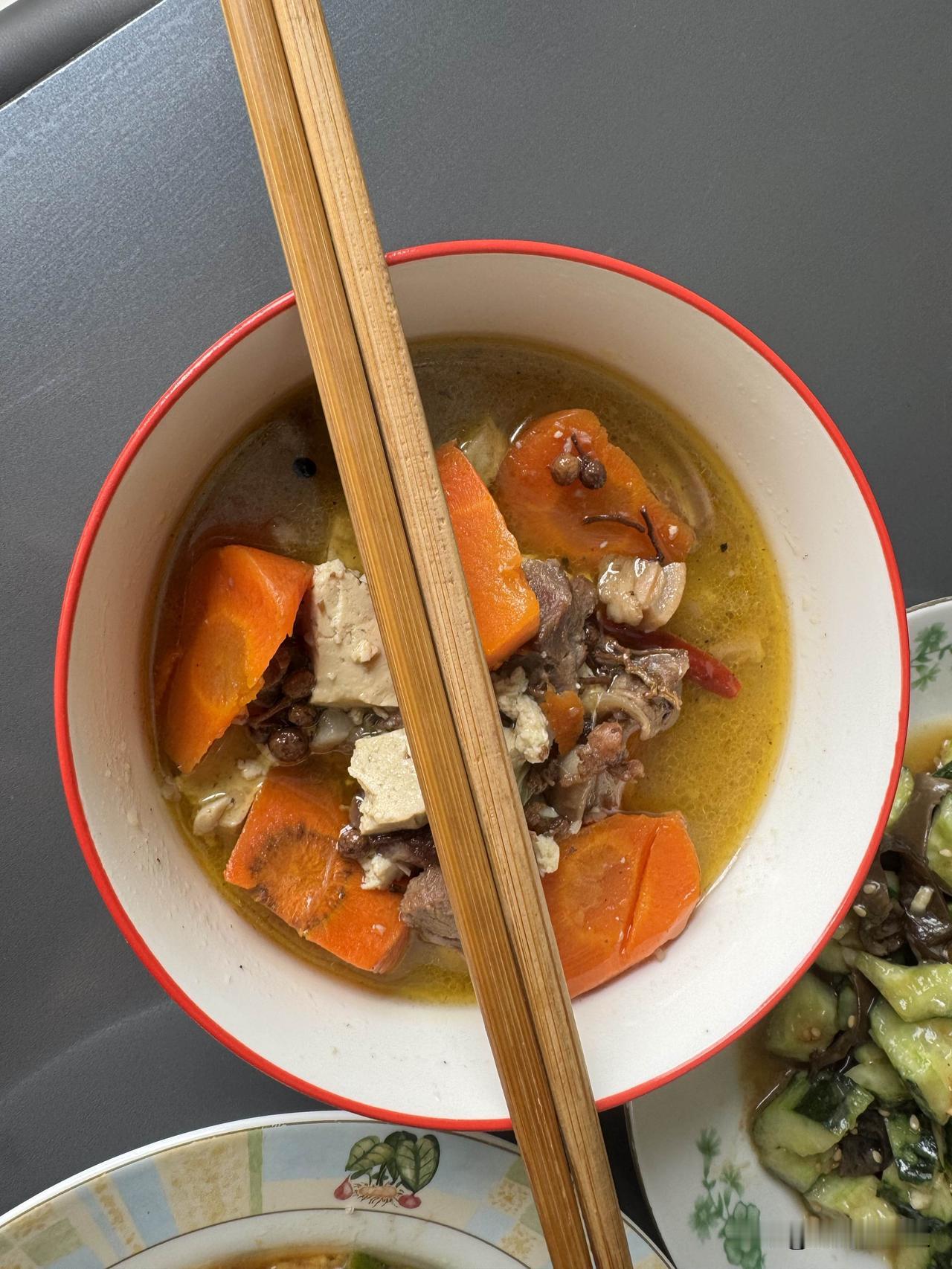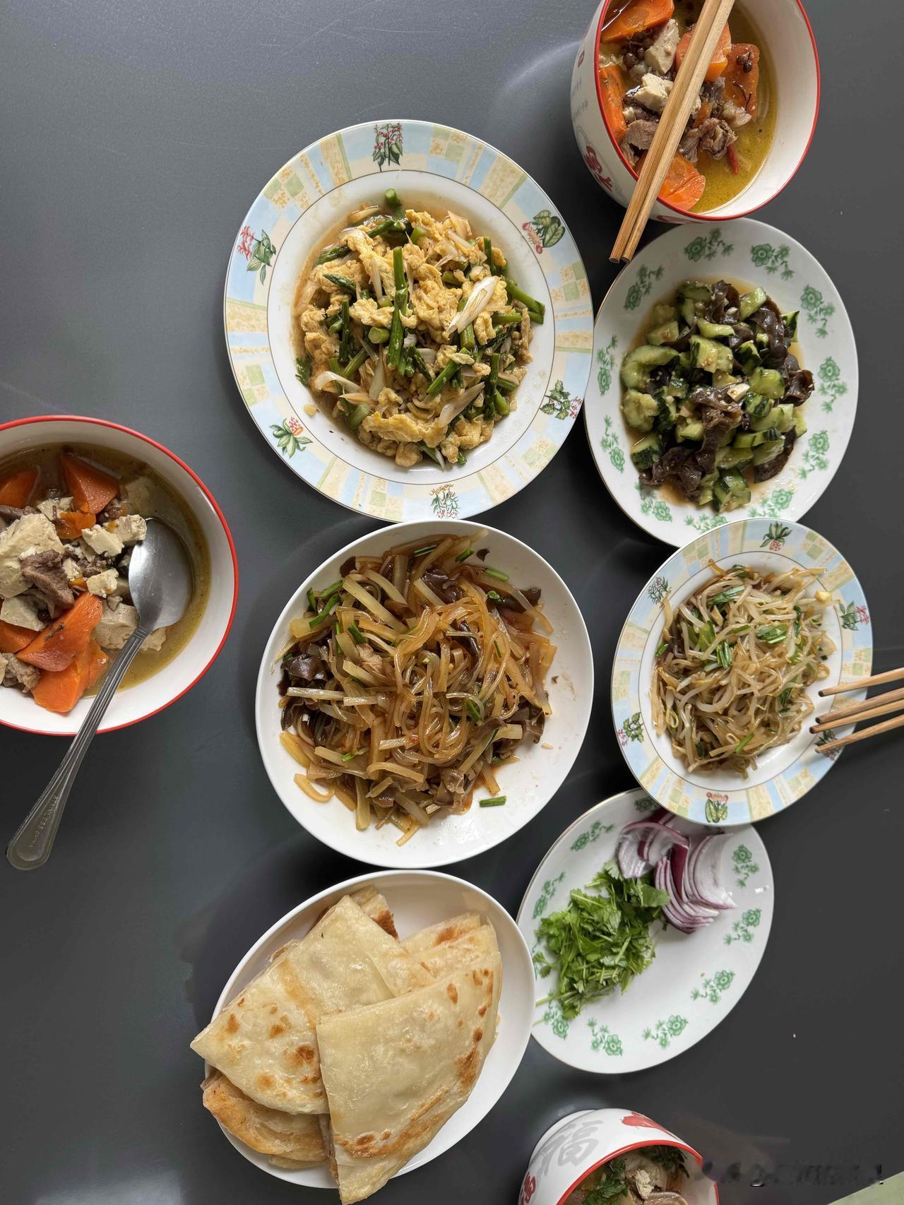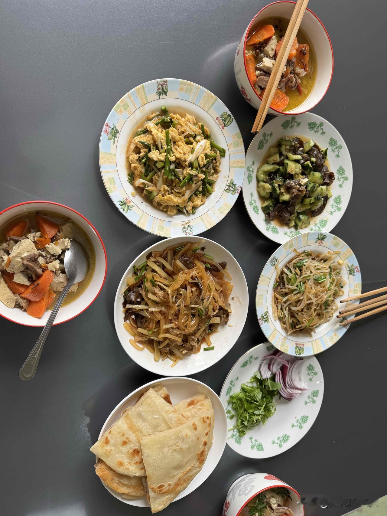 哎呀哎呀哎呀,天气太冷了。温度5~12度。 为了保暖,给身体增加热量,今天中午炖羊肉。真香。 羊肉炖胡萝卜。 油丝饼。 凉拌黄瓜。 粉条拌豆芽。 炒莴苣。 香菜佐料。 鸡蛋炒蒜苔。