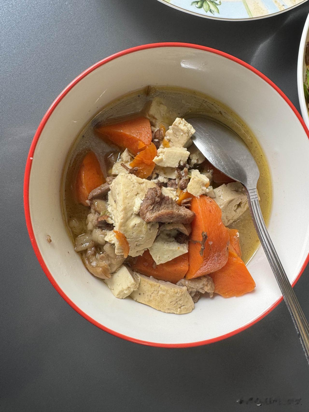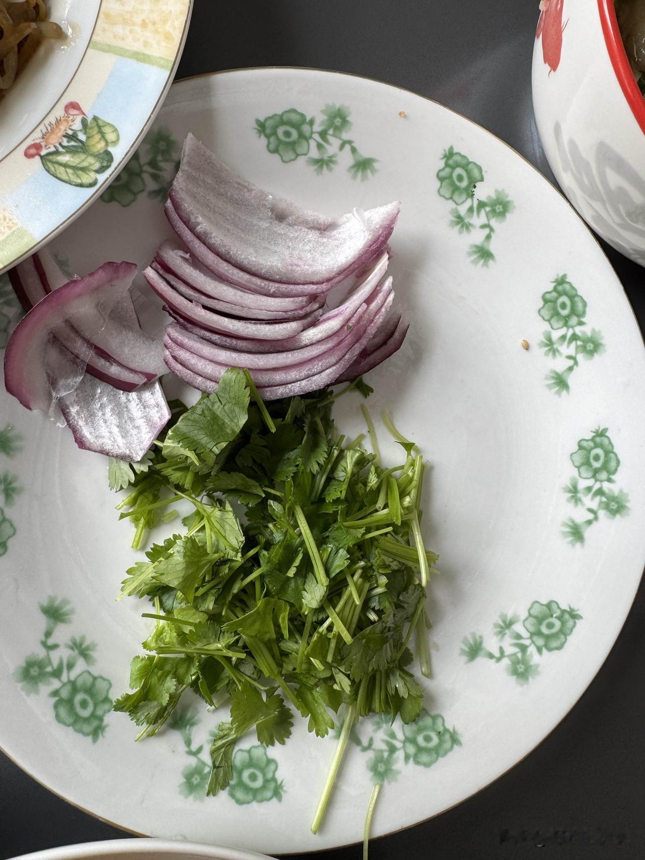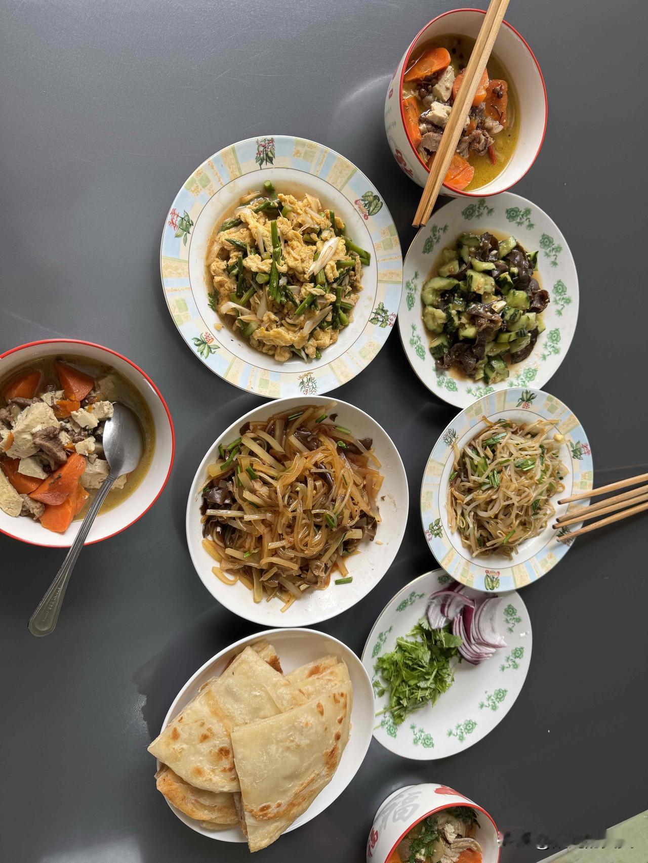 哎呀哎呀哎呀,天气太冷了。温度5~12度。 为了保暖,给身体增加热量,今天中午炖羊肉。真香。 羊肉炖胡萝卜。 油丝饼。 凉拌黄瓜。 粉条拌豆芽。 炒莴苣。 香菜佐料。 鸡蛋炒蒜苔。