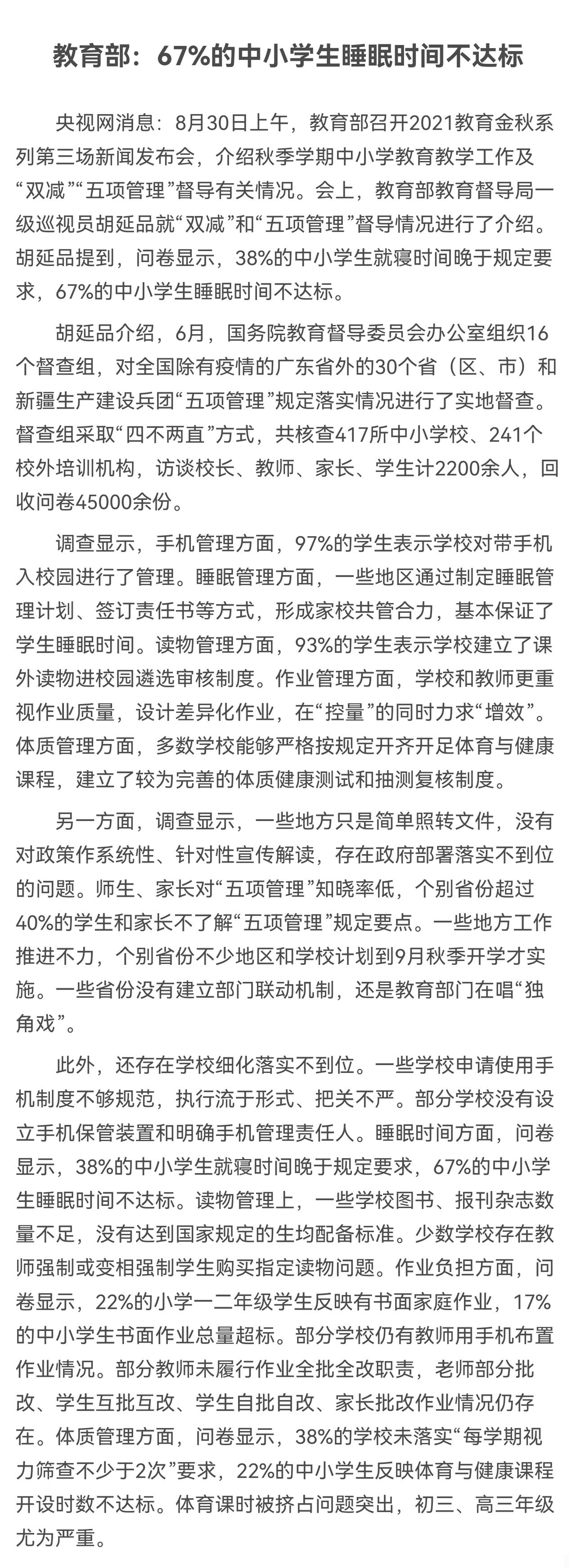 有网友说,现在学生的心理问题,都是搞“快乐教育”搞出来的,孩子接受不了一点挫折。 请问,全国有哪些地区的中小学生学业压力不重、不卷,作业很少,每天睡眠充足,在校有充分的体育运动时间?中小学生真享有幸福、完整、快乐的教育吗? 教育部近年来抓睡眠管理、作业管理、体质管理,针对的就是学生花在学习上的时间过长、睡眠时间不足、运动时间太少的现实问题。 而很多人还对这些问题视而不见,他们根本就没有把学生当人,而是学习机器,他们也不在意学生的身心健康,甚至把学生有心理问题也视为“淘汰赛”“适者生存”的一部分。