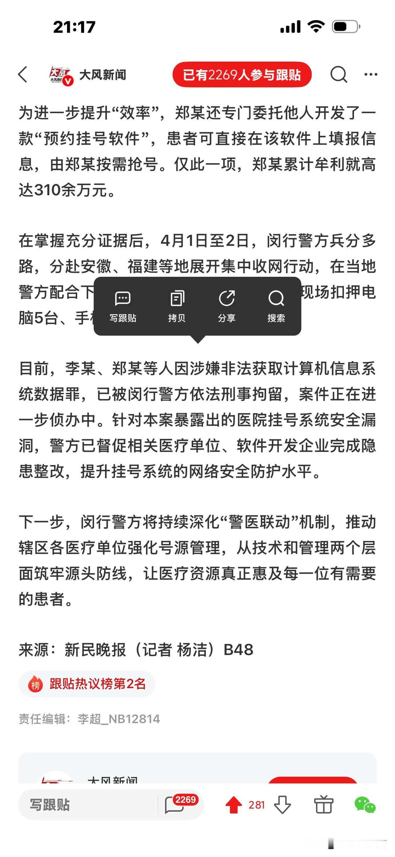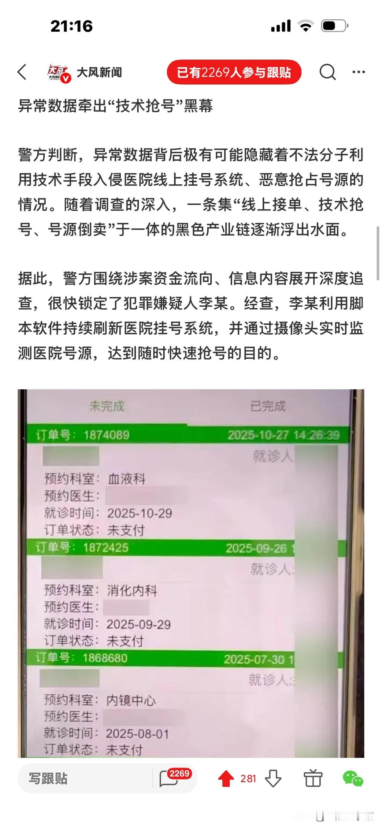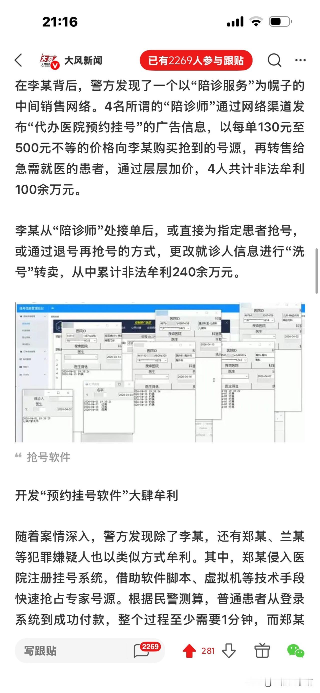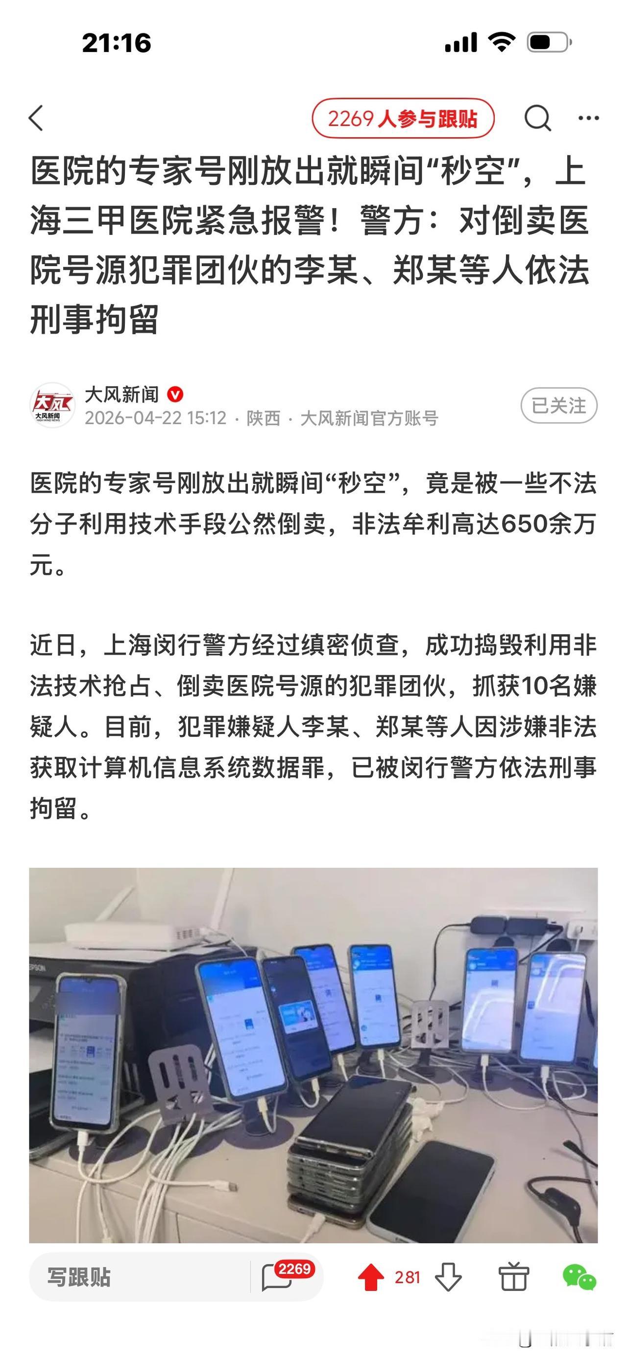 上海一家三甲医院刚放出专家号, 就被人秒抢一空,医院报警, 原来,有人利用了“预约挂号软件”牟利几百万! 据大风新闻报道,上海闵行警方近日破获了这起案件。 今年3月,帽子叔叔接到该三甲医院的反映称,医院线上挂号小程序显示大量专家号已约满,然而实际到诊率不到一成,无人就诊,造成好多号浪费。 而另一面,许多患者却抱怨根本挂不到号,就算拿着手机第一时间开抢也抢不到号。 医院发现异常,就按患者挂号预留的电话打回去,结果很多电话根本打不通,不像正常电话。 帽子叔叔从这些异常电话入手,发现一部分电话非常活跃,频繁挂号退号,取消退号,就像玩似的。 后来帽子叔叔查出,是一批不法分子利用技术手段入侵了该医院的线上挂号系统,恶意抢占号源。 被抓获的李某交代,他就是利用脚本软件、虚拟技术,持续刷新医院的挂号系统,并装上摄像头实时监测医院号源,秒抢号源的。 而李某背后还有一个下游链,一共4人,他们以“陪诊服务”为名,向患者推广“代办医院预约挂号”的服务,并向李某购买他抢到的号,每单130元至500元不等,买到号源后,他们又以更高的价格转卖给患者牟利。 这4人牟利高达100多万,而上游的李某获利更高,达到了240多万。 可怜的只是生了病的患者,要去看病,就得以更高数倍的价格购买专家号。 帽子叔叔顺藤摸瓜,还抓获了和李某一样非法谋利的另外两人。 比如郑某,他为了更快抢号,专门委托他人开发了一款“预约挂号软件”,患者可以直接在该软件上填报信息,郑某按需抢号,从中牟利300多万。 想想啊,这些倒卖号源的人利用专门软件,和多部电脑手机1秒钟就可以抢到号,而普通人从登录到完成抢号需要1分钟,哪里还有号剩给他们呢。 由于李某、郑某等人涉嫌非法获取计算机信息系统数据罪,现在已经被帽子叔叔抓捕拘留。他们的行为已经造成了公共服务的混乱,损害了患者的利益和公平,真是罪有应得呀! [酷拽][酷拽]