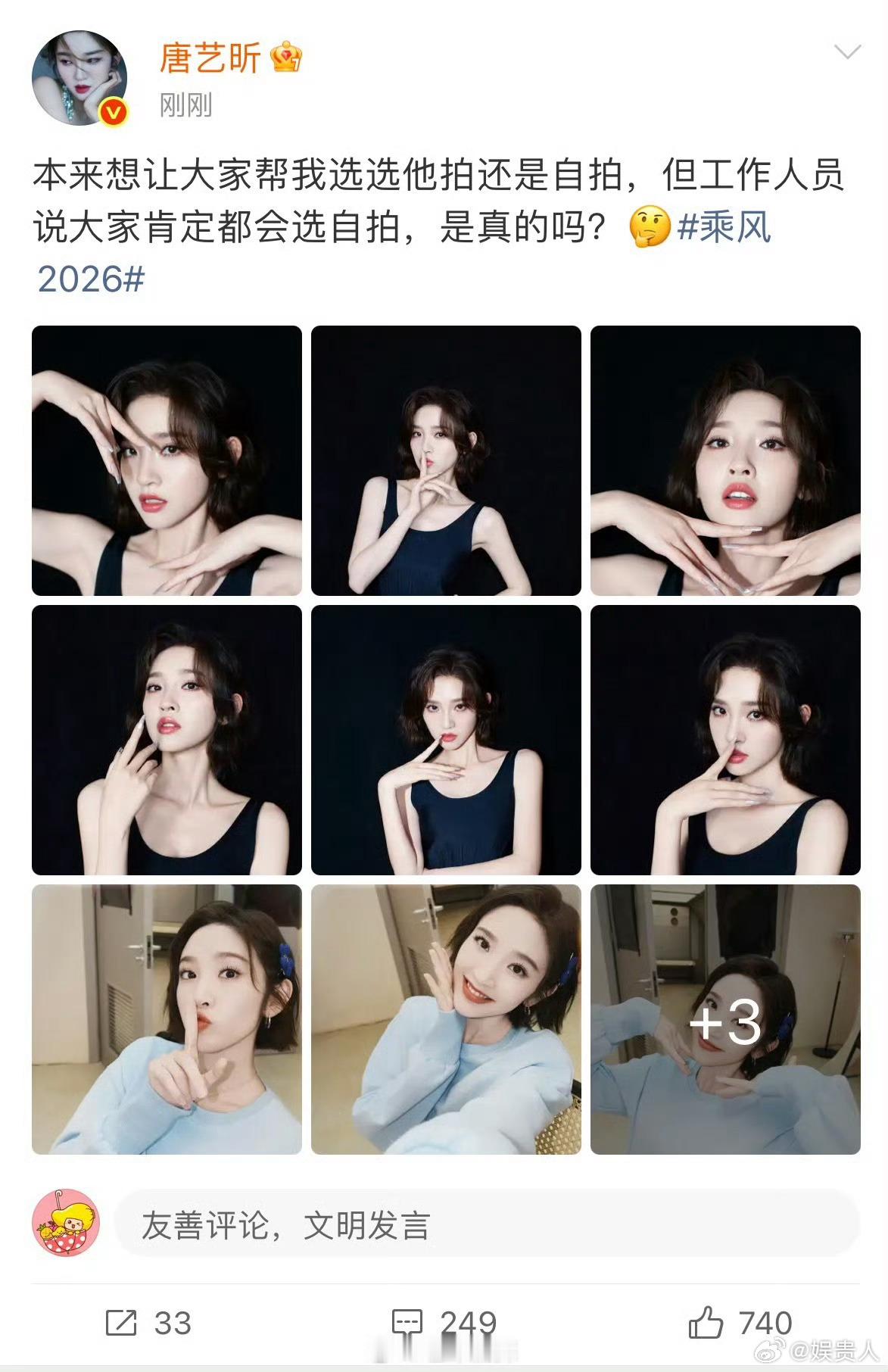 唐艺昕让大家选自拍还是他拍唐艺昕晒自拍和他拍这可难到我了,自拍俏皮,他拍高级,都爱呢