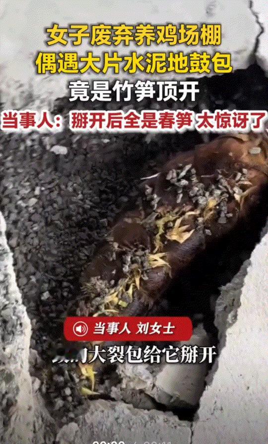 安徽广德,一女子家中有个废弃的养鸡棚,这天她和父亲一起去看了看这棚,结果发现鸡棚水泥地出现大片鼓包,再仔细查看一番发现,既是鸡棚水泥地下冒出的一根根竹笋导致的。视频可见,棚内果然从地面冒出一根根横七竖八的竹笋,长的甚至长达一米之多,而地面崩裂处掰开,也是未能破地而出的竹笋。这一幕也让女子和父亲觉得惊讶,他们也没想,这竹笋竟如此坚硬,从鸡棚水泥地里都冒出这么多! 此事被女子分享到网上后,也是引起了网友们的一片热议。有网友就表示:山上几百斤重的石头,毛竹笋都能顶动,何况这水泥地面咯。赶紧清理一下周边竹子吧,否则整个鸡场都可能会被竹子掀了。 还有网友表示:这破坏力惊人了,所以也提醒大家,这房前屋后千万不能种竹子,不然笋子觉醒时,就是掀房之日[捂脸] 不得不说,这真是“笋”到家了!谁能想到这笋子会从家里水泥地冒出来啊。不正如网友所说,赶紧把它们清理干净吧,不然以它的增长速度,一个星期后至少得冒好几米,到时候真就连棚顶都给你掀了!