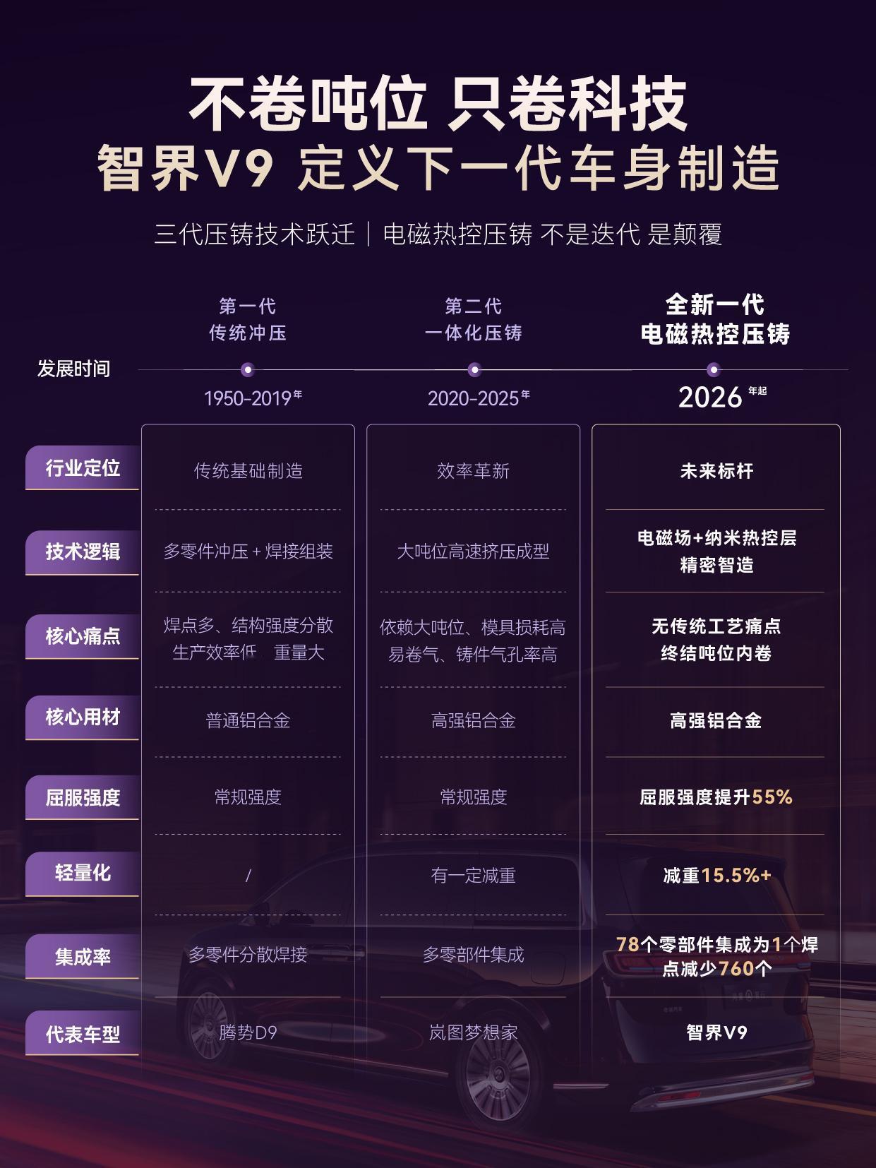 智界汽车最新推出的MPV智界V9,而且这车将搭载全球首发的电磁热控压铸技术,这令汽车制造行业焕发出新的生机。 这项创新技术通过对铝液温度和流动性的精准控制,不仅显著提升了铸造件的质量,也有效解决了传统压铸工艺中普遍存在的气孔、厚薄不均等问题。智界V9的车身结构经过优化整合,由78个零部件整合为一,大幅降低了焊接点的数量,将焊接工序减少了760个,使得生产流程更加高效。 在安全性能方面,智界V9以其高致密性的铸造结构能够有效抵御外部冲击,为乘客提供可靠的保护。同时,车型配备了多达13个安全气囊,进一步增强了被动安全性能,确保在各种碰撞情况下乘客的安全。随着电磁热控压铸技术的不断完善,智界汽车将以实际行动推动出行安全、环保与智能化的融合,为消费者创造更好的出行选择。智界V9全球首发电磁热控压铸技术