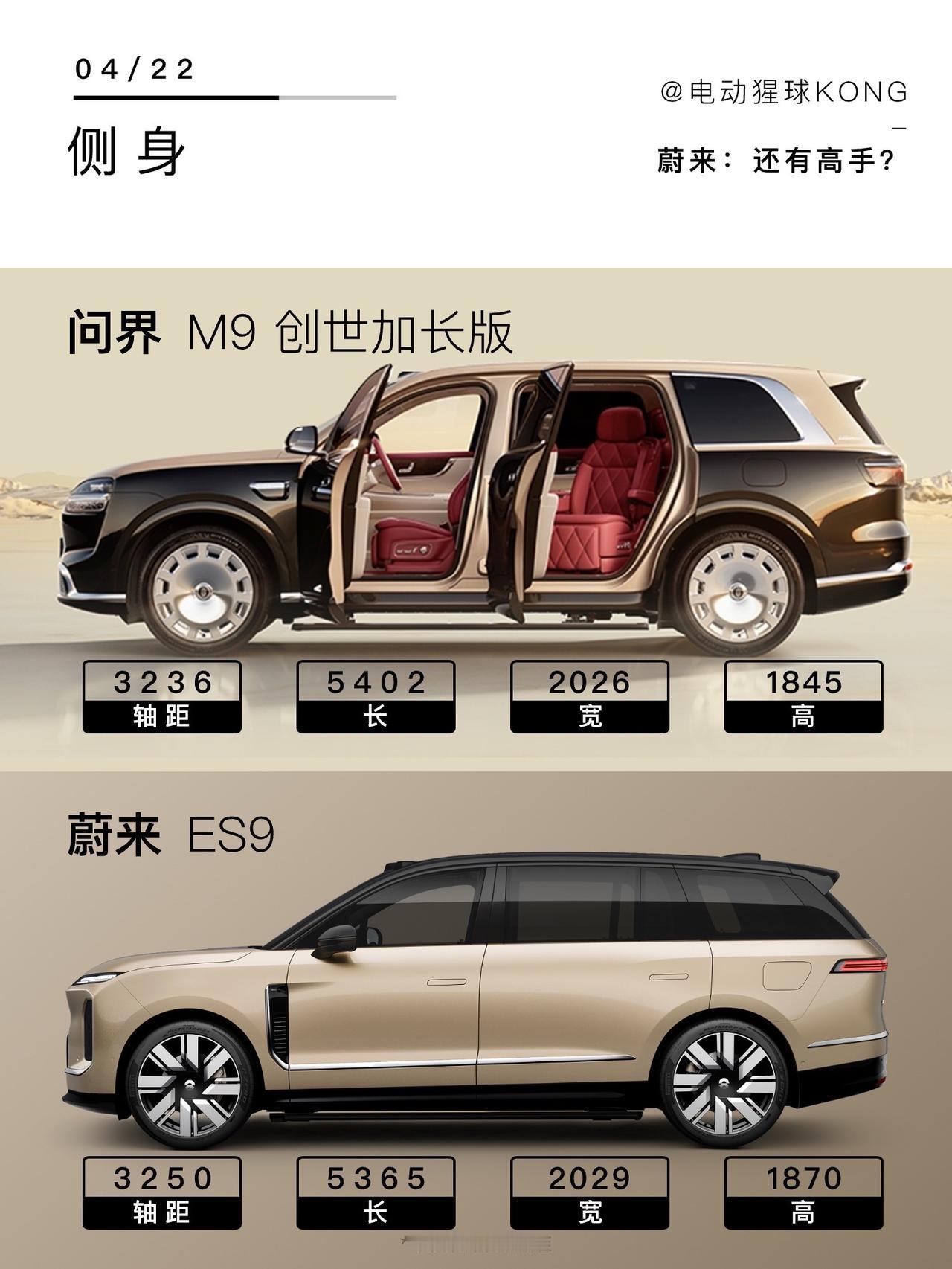 蔚来ES9:还有高手?问界M9创世加长版来了,好家伙,长5米402?!以为蔚来ES9已经够夸张了,原来还有高手,之前公布的其实是标轴版。预售价和ES9的地平线版差不多,北京车展这两辆车在一个展馆,这也太刺激了,手握60多个W,你会怎么选?问界m9