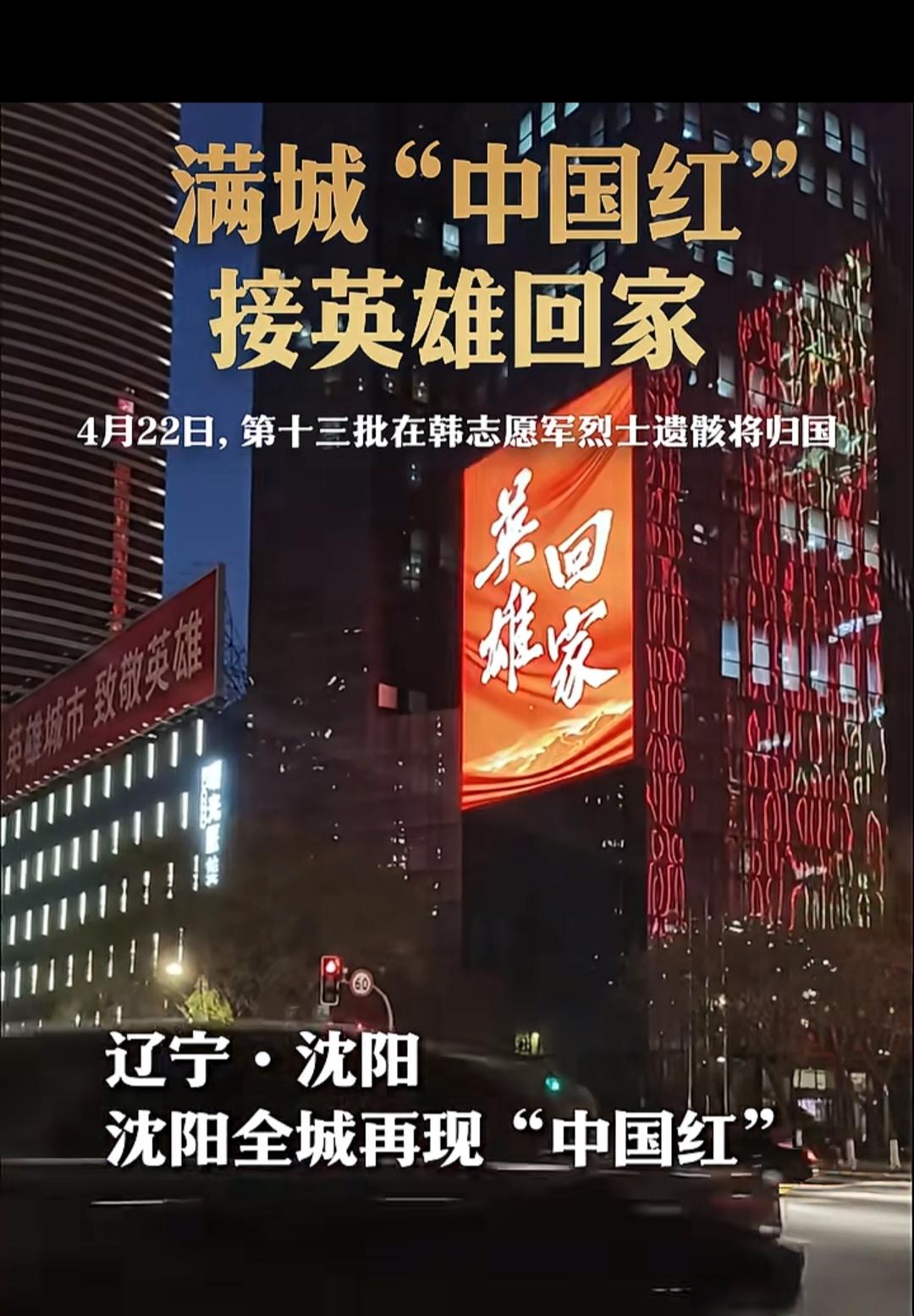 一代人打了三代人的仗,一代人吃了三代人的苦。未见其面,却深受其恩! 第十三批志愿军烈士遗骸归国,沈阳全城电子屏幕亮起红色标语,大街上悬挂起五星红旗,以城市之名,接英雄归来!76年了,保家卫国,为祖国为人民的牺牲奉献,祖国没有忘记,人民没有忘记。向志愿军烈士致敬! 沈阳作为英雄城市,崇尚英雄、捍卫英雄、学习英雄、关爱英雄已成为城市基因。自2014年中韩达成交接共识以来,沈阳始终以最高礼遇迎接志愿军烈士遗骸归国。