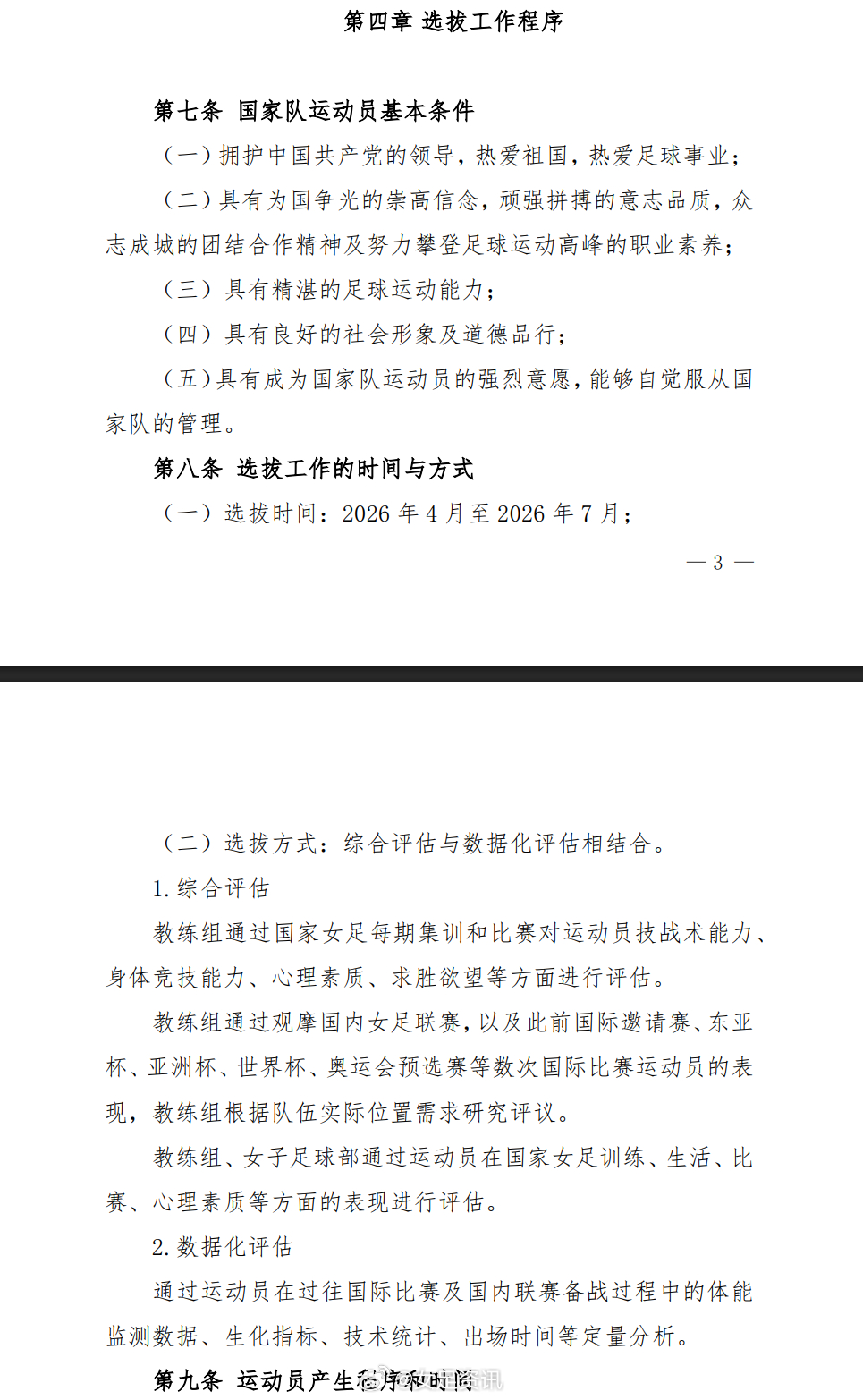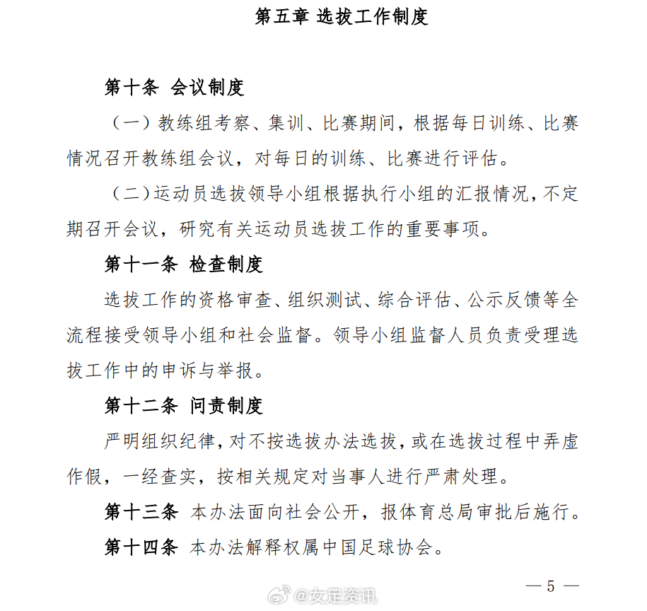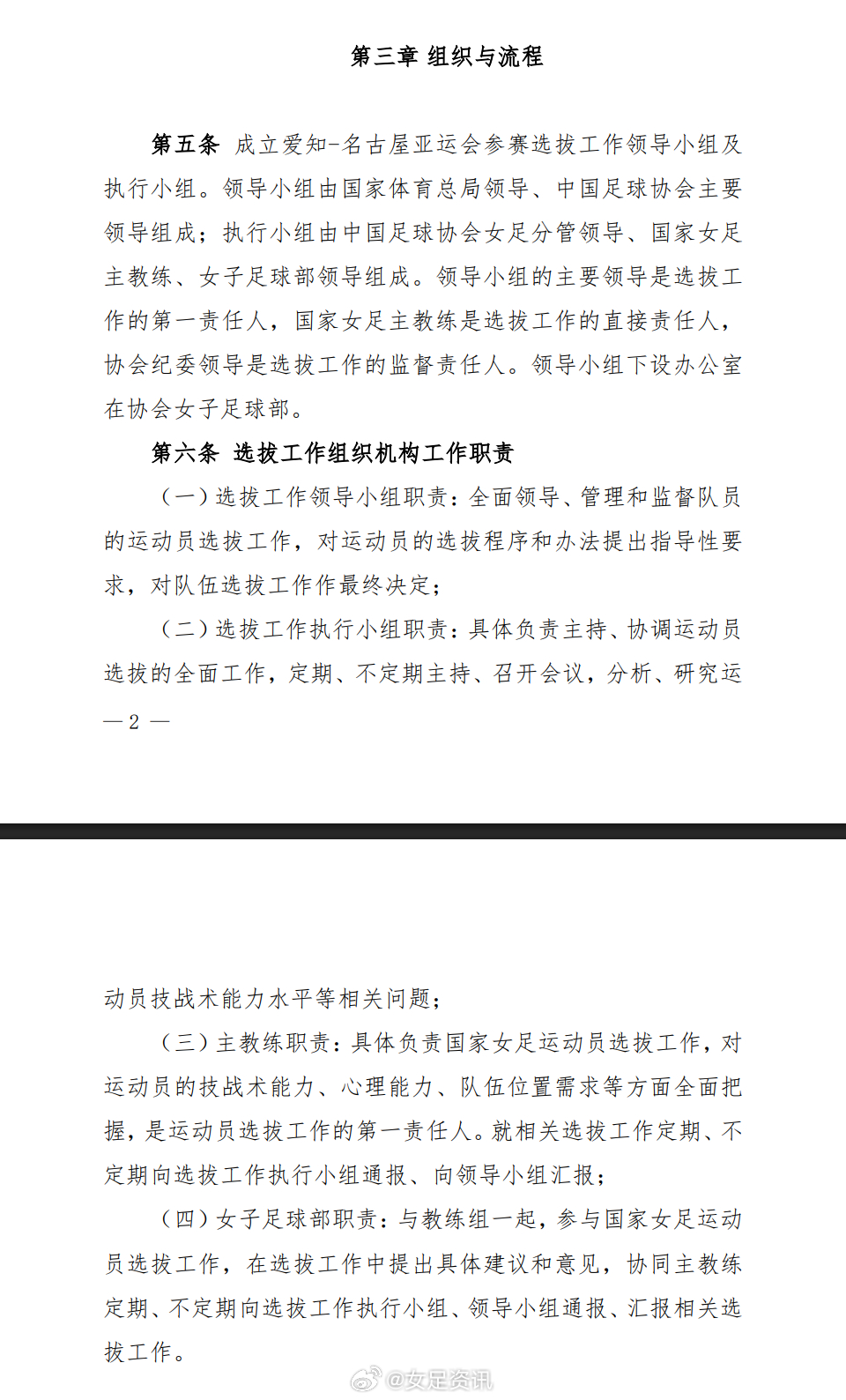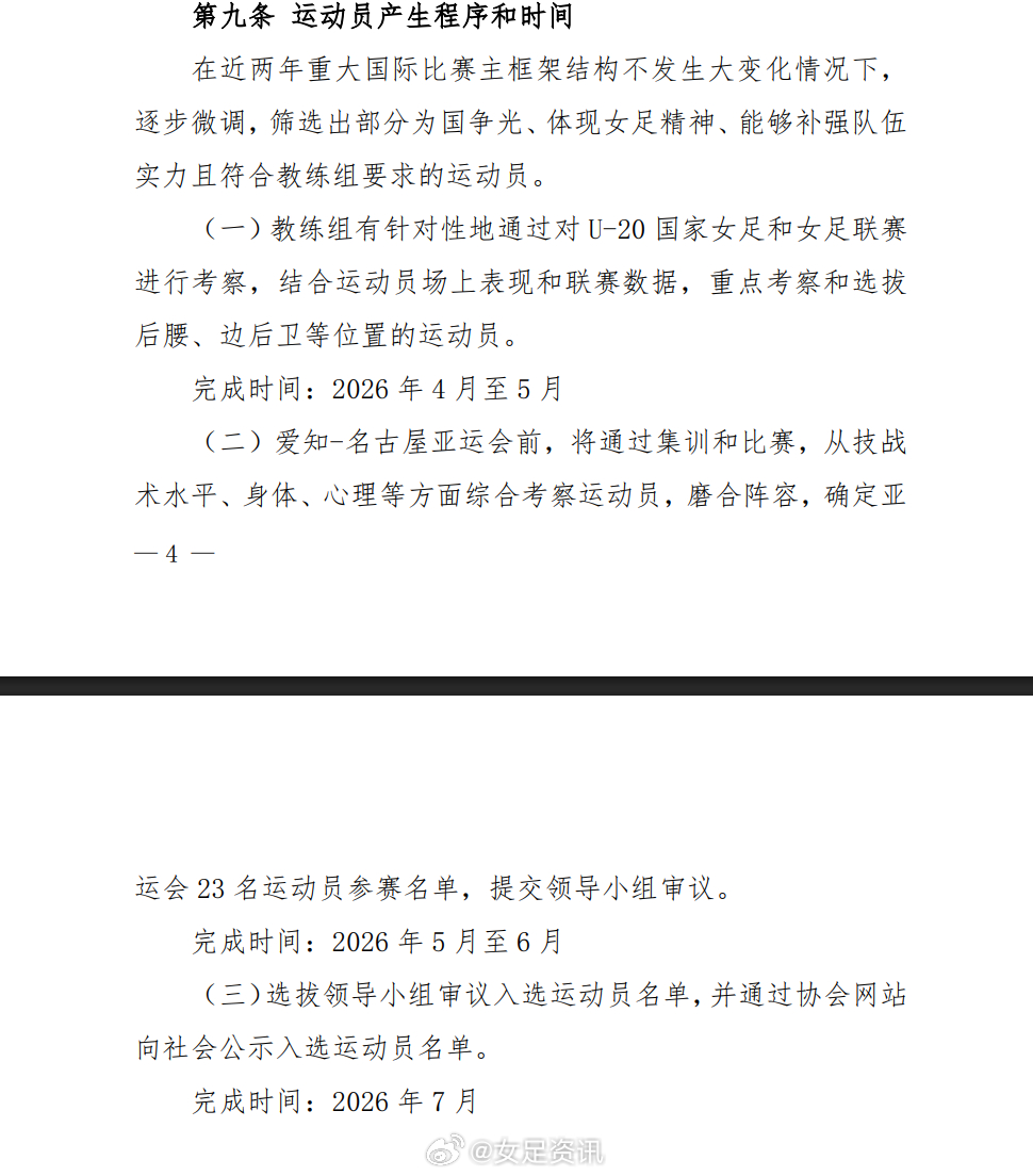 有球友让再解读一下关于亚运会参赛球员的规定,这个规定是个官话版的,我试着翻译成一个简版的。 核心的内容就两点,一,两级管理负责制,总局和足协领导负责最后拍板,女子部和主教练组成二人工作小组负责选人,随时向足协女足分管人孙雯汇报。 二,选人的过程4月至5月从U20国家队和女超联赛中选人,选人有个基本要求就是不能在原来的基础上变化太大,5月和6月通过集训和热身赛(即和俄罗斯女足的两场热身赛)工作小组确定23人大名单,这里面有个活话,一级管理者随时可能会有指导性的意见,7月上报等审批,批准之后公示。