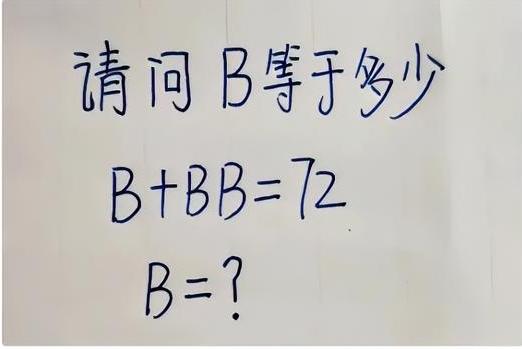 炸锅了!这道小学题把99%的人难倒 看到B+BB=72这个式子,我第一反应都懵了!B加BB等于72,这BB是指B乘以B,还是B个B组成的两位数啊?要是按两位数算,B只能是6,可6+66=72,这也太巧了! 难道这就是考逻辑思维?感觉比做高数还烧脑。头条里藏龙卧虎,你们说B到底等于几?