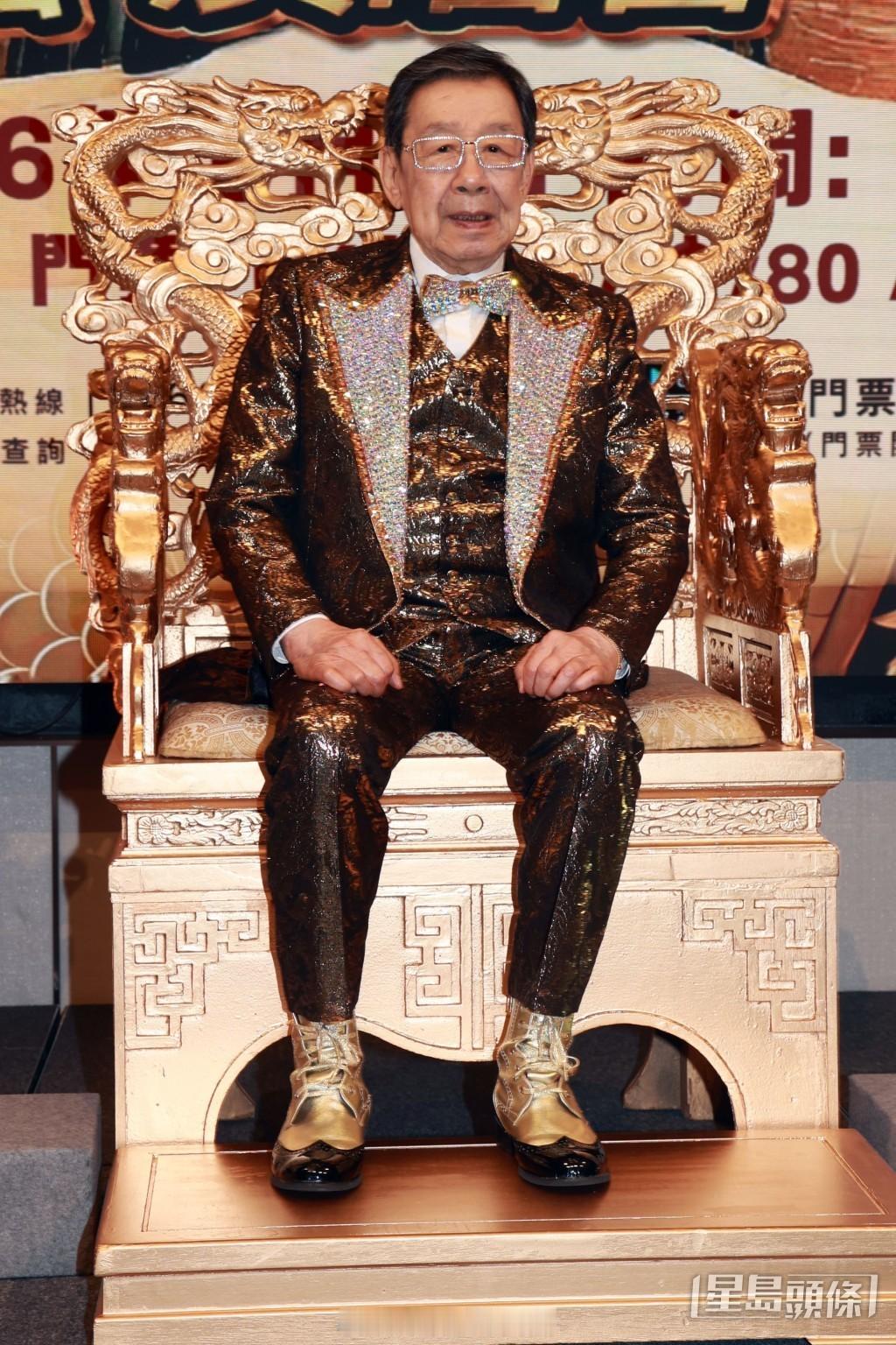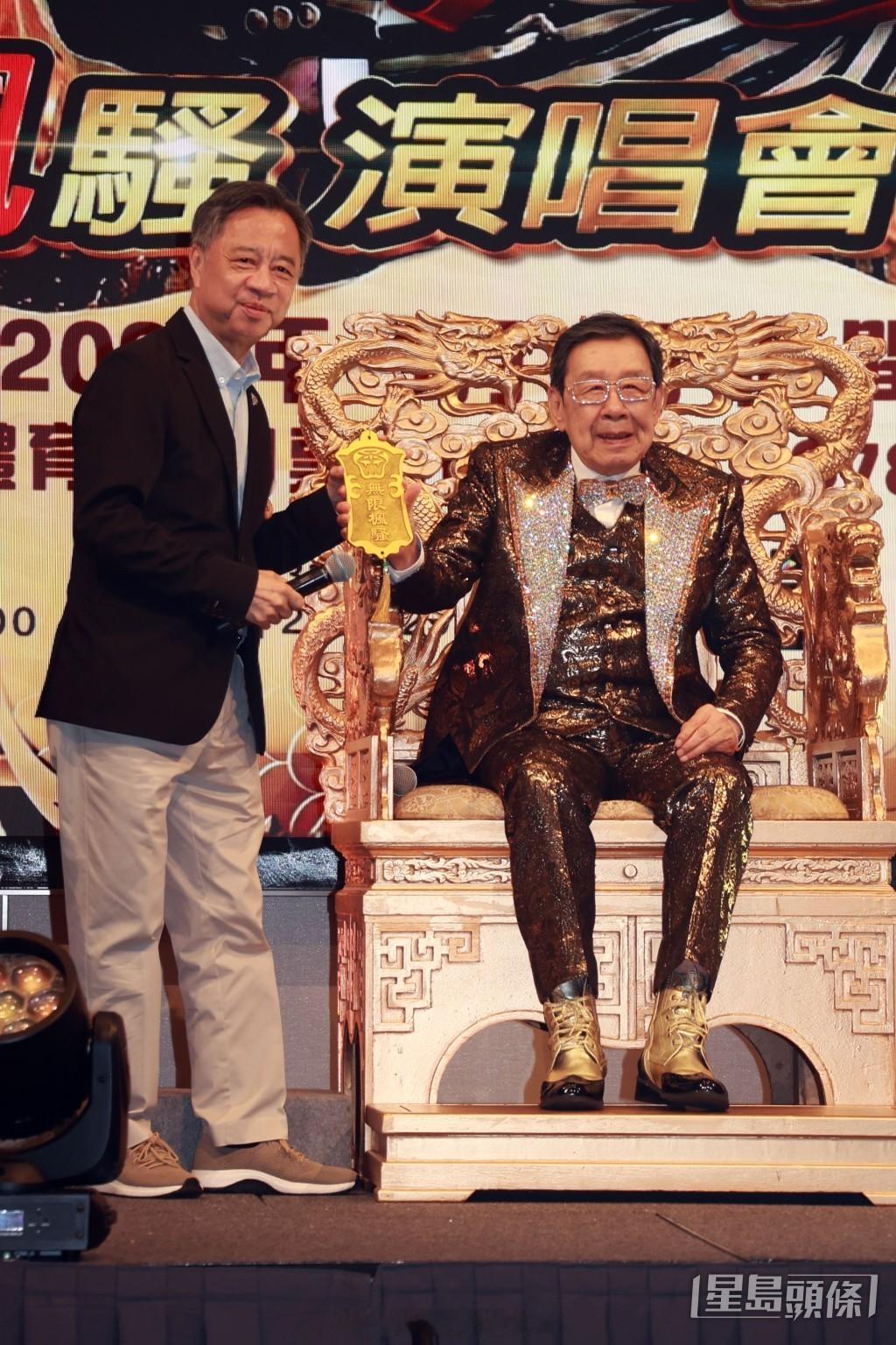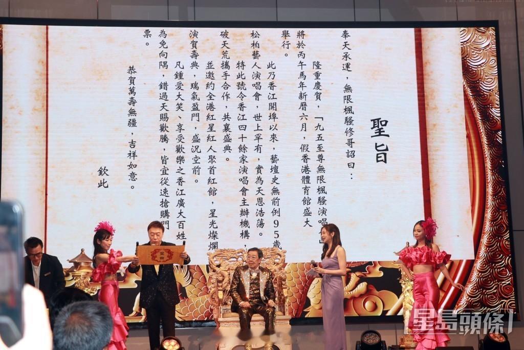 明年将踏入95岁的胡枫(修哥)出席“修哥九五至尊无限枫骚演唱会”记者会,大会播放影片回顾修哥的演艺之路,以及他过往五场红馆演唱会片段。一身金光闪闪的修哥在六位美女陪同下进场,并坐上龙座,由陈欣健及麦美恩担任司仪。修哥见到麦美恩时风趣地说:“你不是入了雪柜吗?”麦美恩随即笑称:“修哥都这么留意娱乐新闻,多得主上你从冷宫救我出来。”配合“九五至尊”主题,陈欣健以宣读圣旨形式公布演唱会详情,将于6月7日星期日下午3时半在红馆举行,修哥即场“批奏”并以玉玺盖章。
