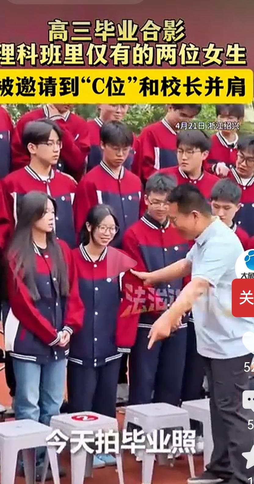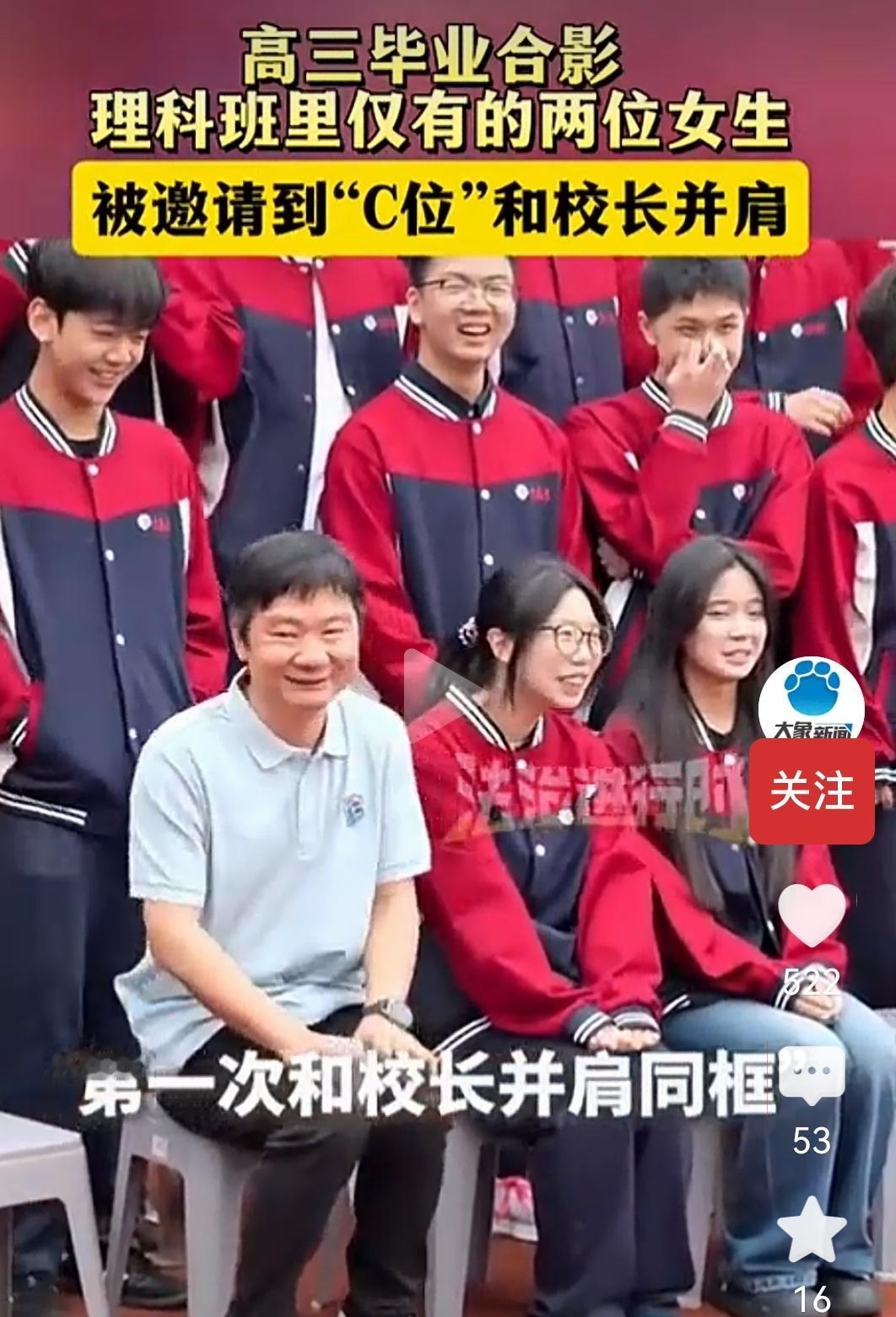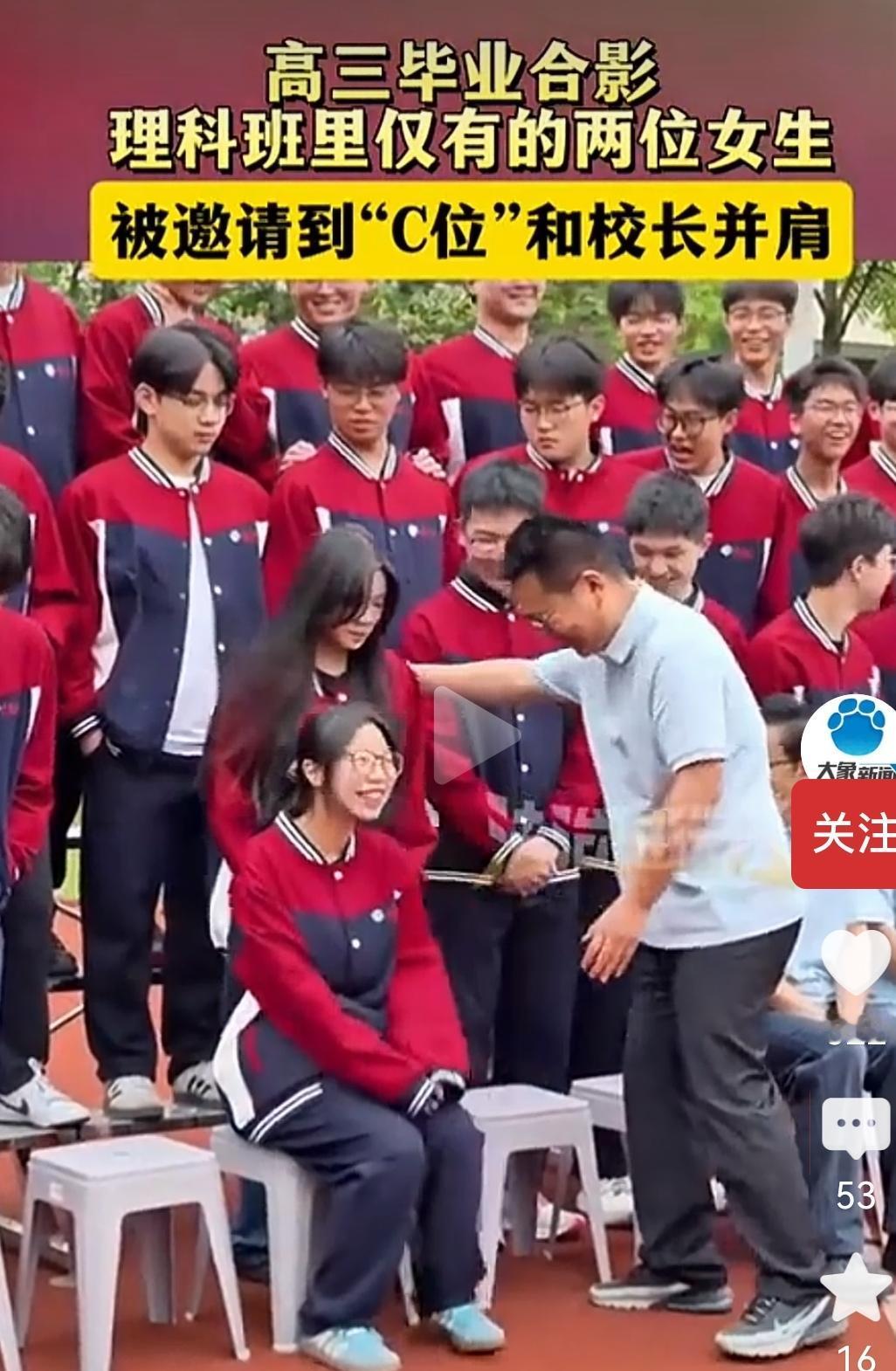 一个高三理科班仅有两名女生,这也太稀缺了,连五朵金花都凑不齐,仅有两朵,必须供在C位,与校长坐齐了! 一般来看,女孩子到了高中以后,形象思维发达,逻辑思维渐渐落后于男生,所以选择文科的远远多于选择理科的,这才有了理科班仅有两名女生的现象。这俩女生真是“班宝”,更是女神!合影时,校长主动邀请俩女生坐C位与己相邻,就很自然了。 我们也看到,近年来的公务员、事业单位入编招考,最后上岸的女生比例远远高于男生。为什么呢,女生学文科的多,记性又好,参加这种考试颇具优势。加之公务员事业单位的工作相对稳定,报考的女生自然就比较多,成绩也相对好,上岸的女生比例肯定就高。小编所在市的市委大院前年招录新公务员12人,有11名就是女生。 对此,友友们怎么看呢欢迎评论区留言讨论哦。(图片源自网络视频截图侵即删)