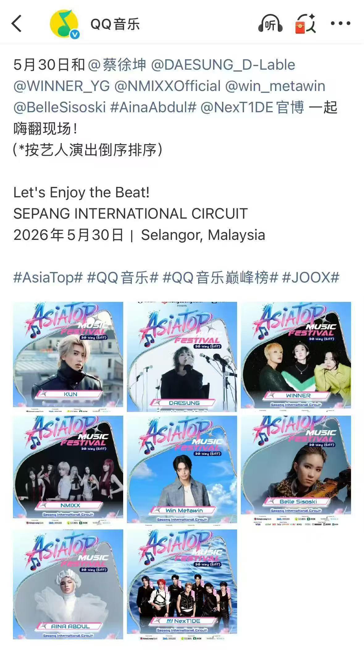 蔡徐坤音乐节压台出场ASIATOP MUSIC FESTIVAL蔡徐坤压轴重磅登场,作为唯一华语歌手站在国际舞台,实力与排面直接拉满。5月30日舞台倒计时开启,期待他用舞台惊艳全场,华语力量走向世界✨