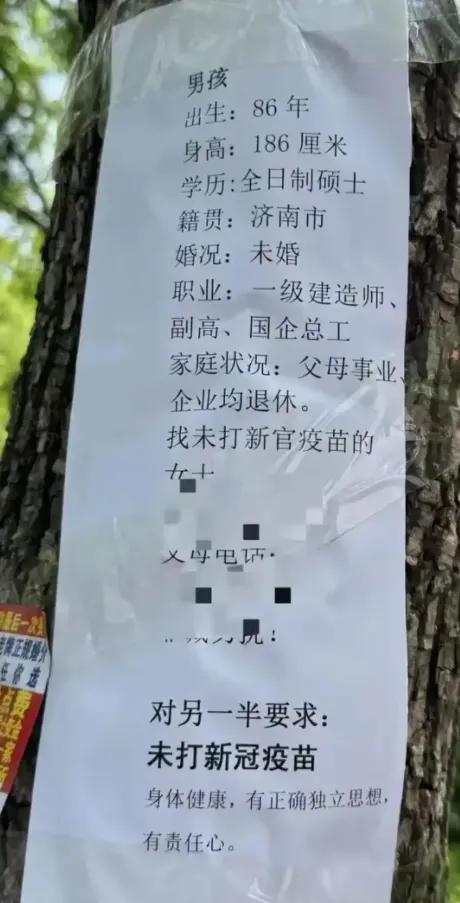 相亲角惊现“疫苗筛查”!济南千佛山相亲会上,一位86年国企总工、硕士、186cm的优质男,征婚条件就一条最扎眼!女方必须没打过新冠疫苗。 网友懵了!现在还有人一针没打?有人自曝“我没打,因为当时生孩子”,还有人说“我家母猪也没打”。看似荒诞,却撕开了婚恋市场最现实的一面!从查户口,看征信,到现在连疫苗记录都成了三观试纸。 这哥们条件确实亮眼!国企总工、副高、父母退休,放在相亲市场绝对是香饽饽。可他偏偏跳过年龄、性格、地域,独独卡在疫苗接种史这一关。有人说这是坚守原则,我却觉得这是婚恋焦虑的极端投射。把婚姻当成了精密仪器组装,每个零件都得严丝合缝。 更可怕的是,这种清单式择偶正在蔓延。北京上海相亲角,只找非素食者,不能养猫,得会炒股已成常态。婚恋军师们拿着放大镜分析相亲资料,没写体重就是胖,没写学历就是大专,没写全款就是有贷款。感情呢?早被量化成一条条KPI。 后疫情时代,疫苗本是个体健康选择,却硬生生被贴上了思想纯度标签。可婚姻的真谛从来不是找克隆人,而是两个不完美的人,愿意彼此包容、共同成长。当你用未打疫苗筑起高墙,挡住的不仅是潜在伴侣,更是爱情本身的可能性。 优质条件外加极端要求是否注定孤独?这场闹剧背后,是2.4亿单身人群的集体焦虑。但真正的爱情,从来不是简历匹配,而是灵魂共鸣。放下那些非黑即白的条条框框吧,毕竟,婚姻需要的不是无菌环境,而是携手面对风雨的勇气。