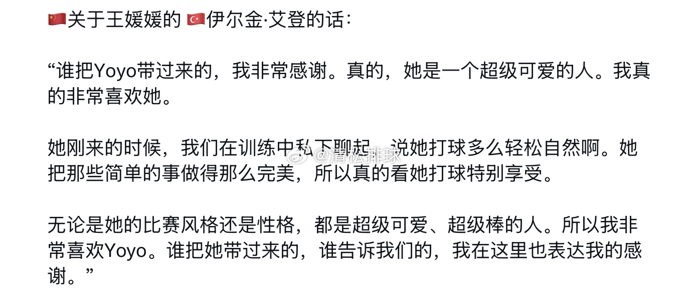 土耳其加拉塔萨雷女排队长伊尔金对王媛媛的评价,同时伊尔金表示王媛媛仍在下赛季的球队阵容中,并且希望一直在。”