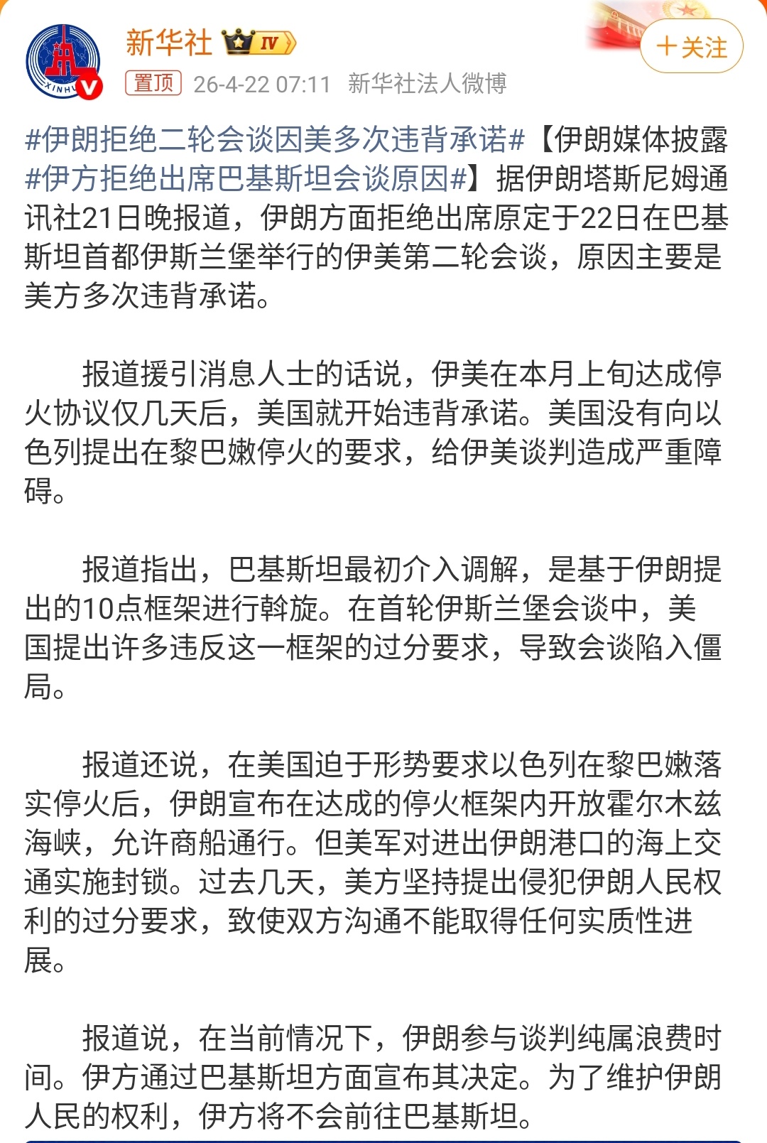 短短两周的停火窗口,终究没能兜住美伊之间深不见底的信任赤字。昨天(4月21日)深夜,一则消息让原本翘首以盼的国际社会倒吸一口凉气:伊朗方面正式宣布拒绝出席原定于4月22日在巴基斯坦首都伊斯兰堡举行的第二轮会谈。至此,这场在最后关头达成的临时停火,再度走到了悬崖边上。
