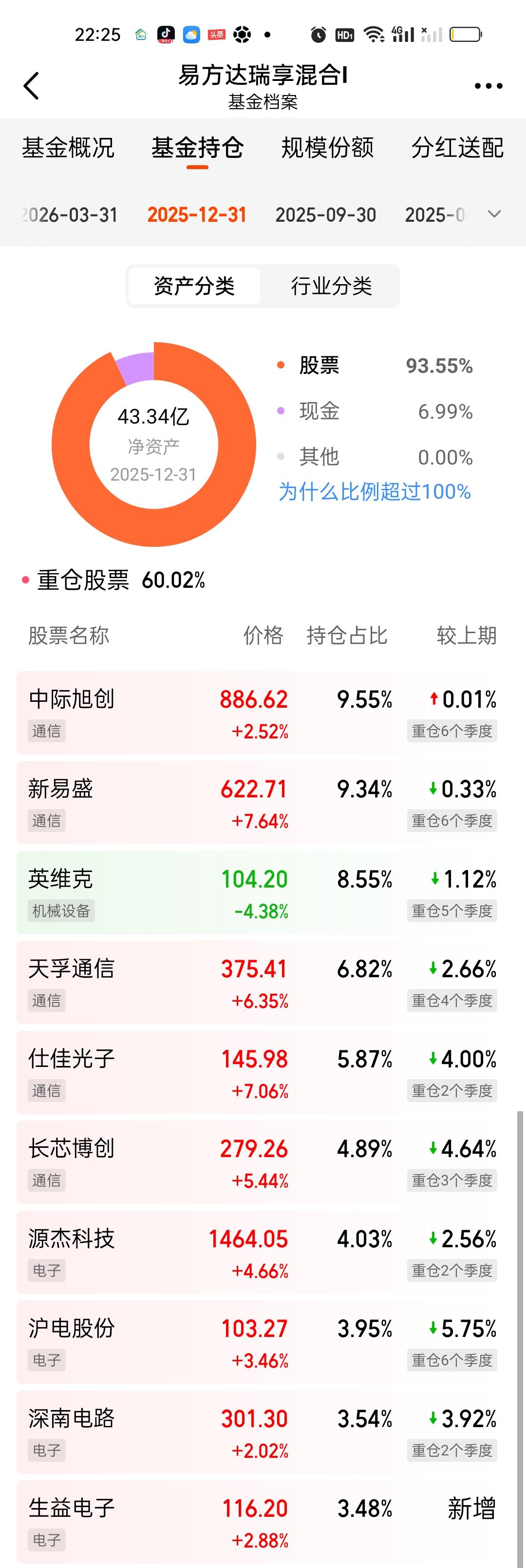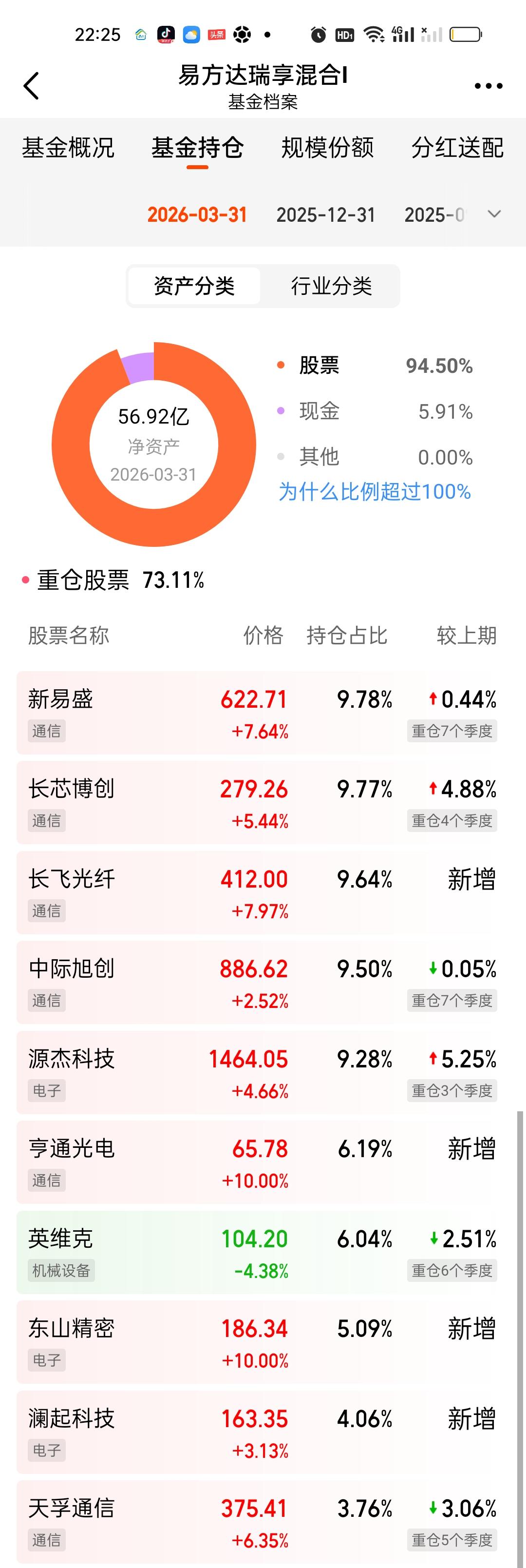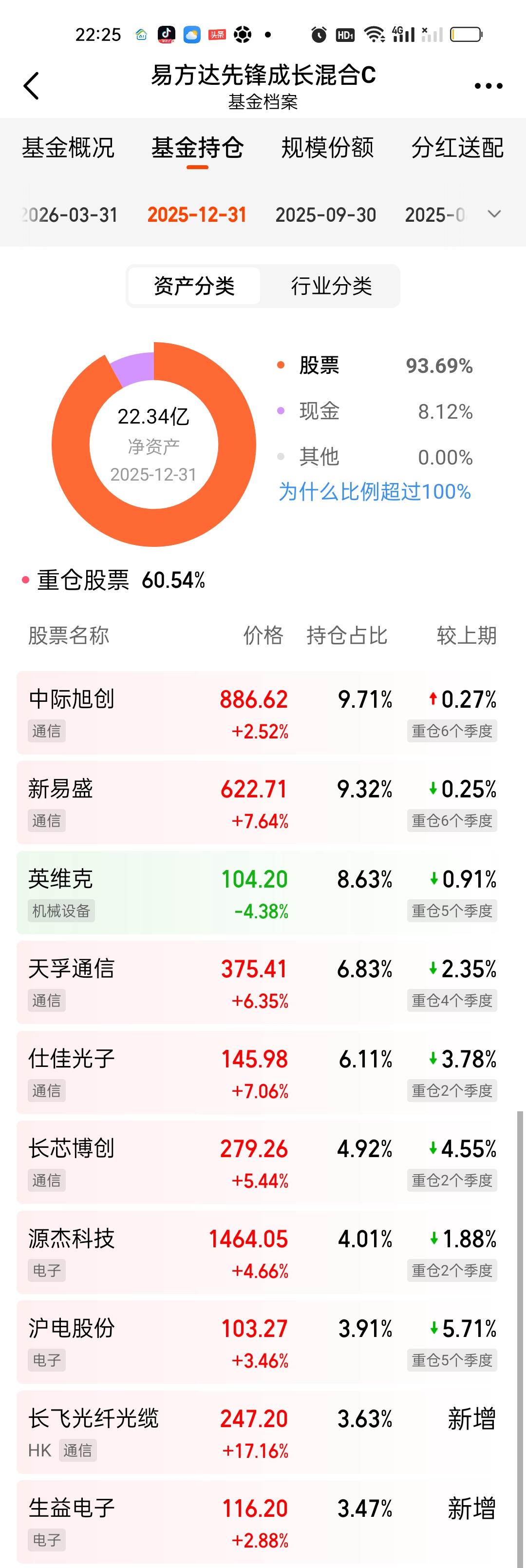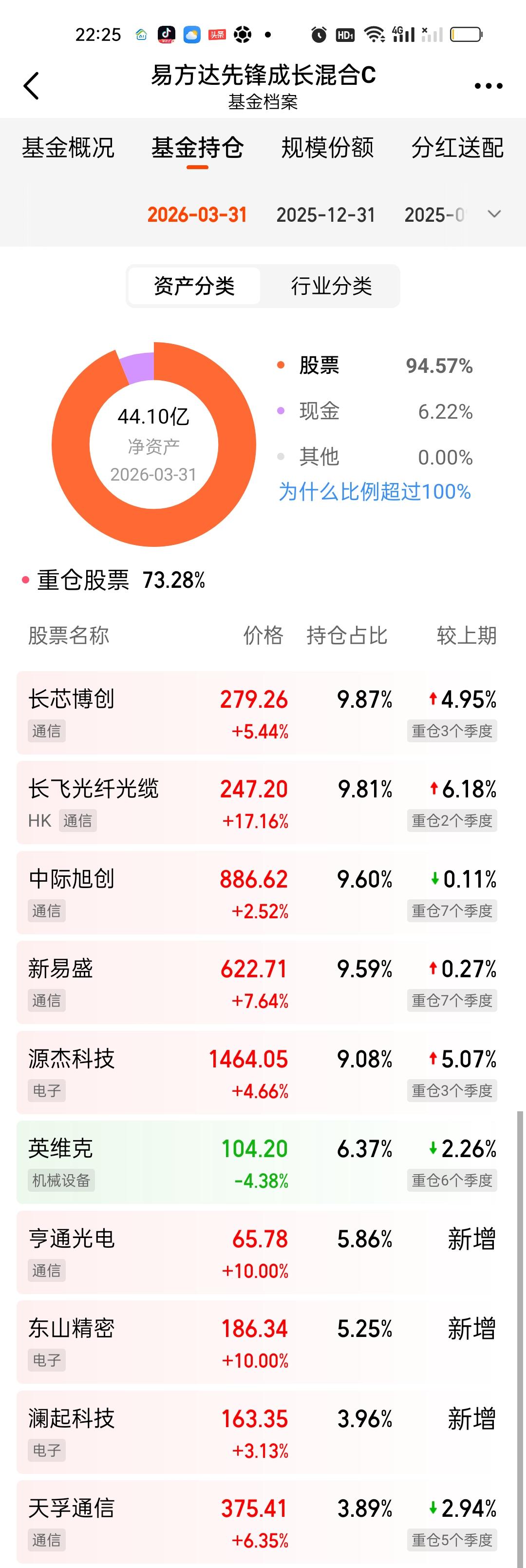 易方达三兄弟(瑞享,先锋,远见)也属于CPO板块的老牌基金,中流砥柱。这次更新,它们的规模都增加了很多。调仓换股完成后,三只基金的前十大重仓股是一模一样的。不同的是每只个股的持股比例。基金经理是同一个人,所以表现基本是差不多的。 三只基金的前十大重仓股占比都从60%增加到了73%左右。持股进一步集中。远见和先锋的基金规模都增加了20多亿。这次调整都新增了3只个股,亨通光电,东山精密,澜起科技。舍弃了仕佳光子,沪电股份和生益电子。大幅提升长飞光纤,长芯博创和源杰科技的仓位,长芯博创从第六直接升到了第一,长飞光纤由第九升到了第三,源杰科技第六升到第五。英维克与天孚通信的仓位下降了一些。 瑞享的调仓相对复杂一些。这次调整新增了4只个股,长飞光纤,亨通光电,东山精密,澜起科技。舍弃了仕佳光子,沪电股份,深南电路,生益电子。前面两只基金原本就有长飞的仓位,这次只是加仓操作,瑞享之前没有长飞的仓位,这次是直接一步到位,买成了第二大重仓股。其它操作没有大的变化,也是长芯博创和源杰科技大幅加仓,英维克与天孚通信大幅减仓。