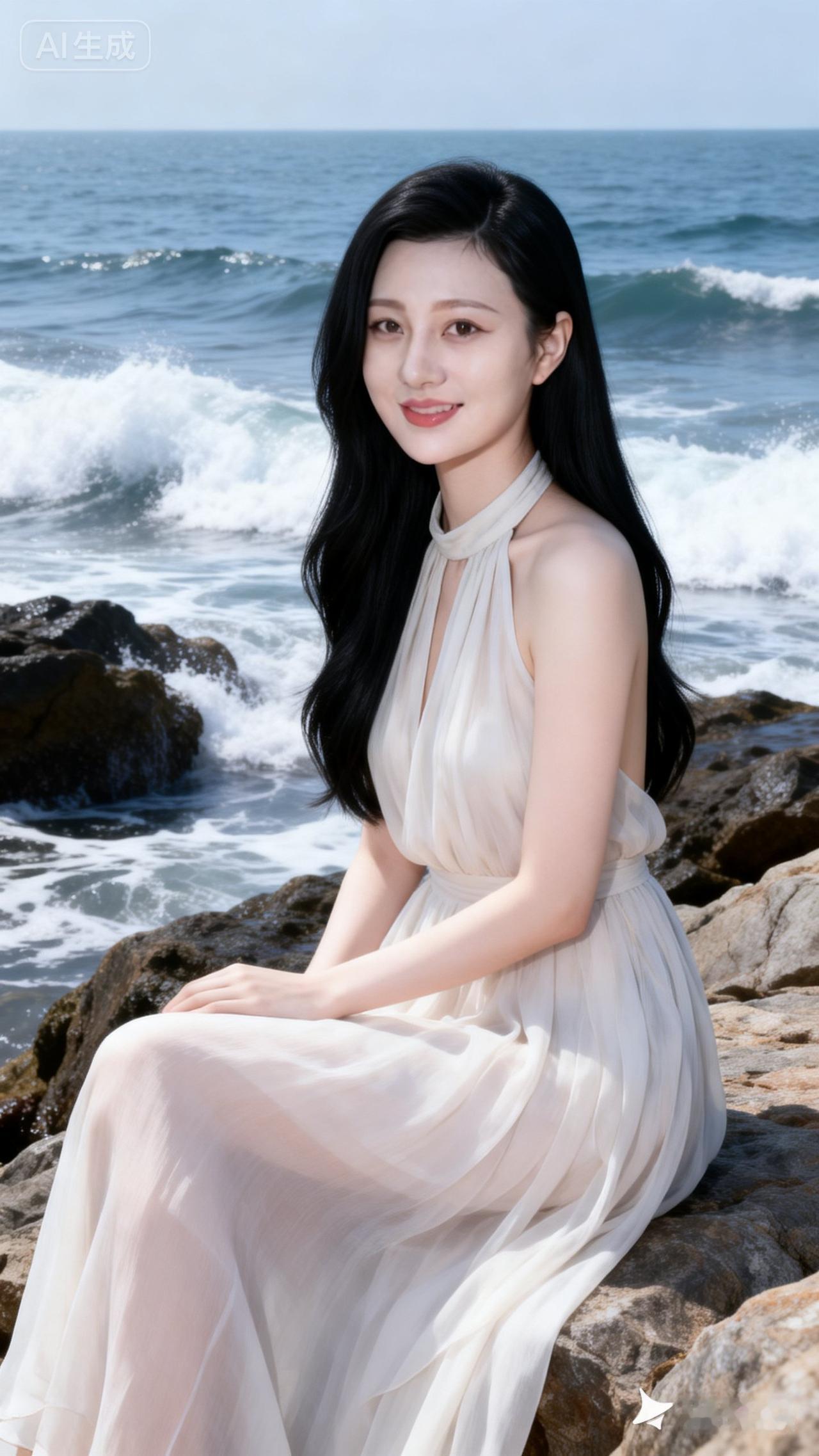 海边漫步,轻盈飘逸的白色长裙,与海浪相映成趣。