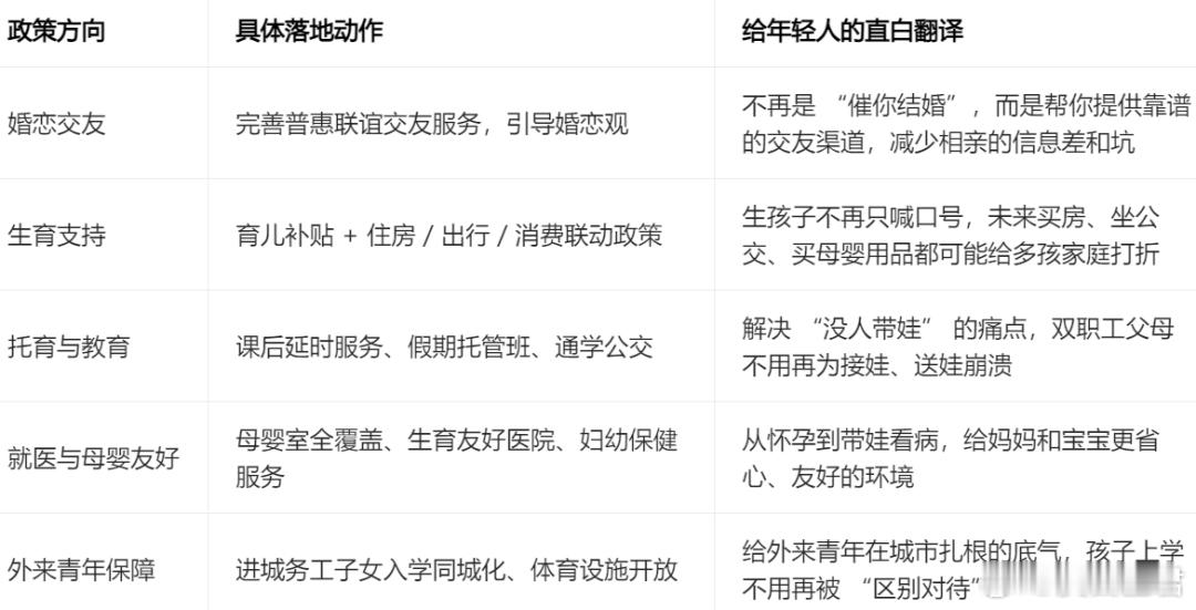全方位降低年轻人在城市里结婚、生娃、养娃的门槛,让年轻人在城市里更 “敢” 恋爱、结婚、生孩子。以前是催结婚、催生,现在是国家帮着你恋爱、结婚、生娃,带娃、养娃