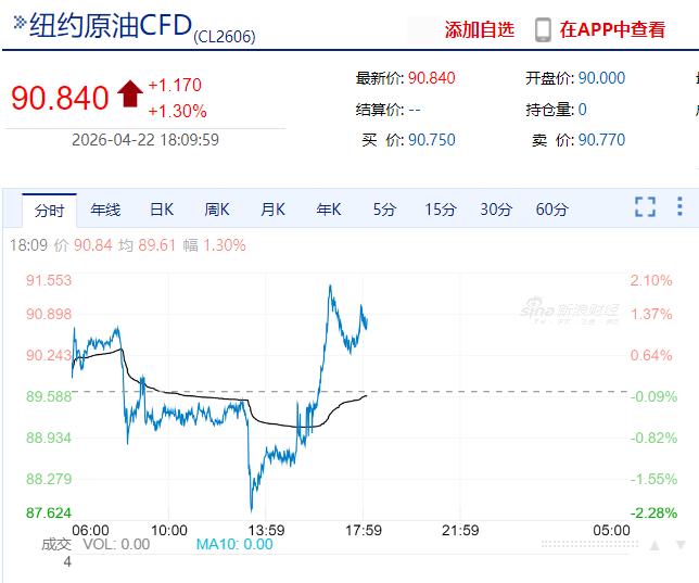 【国际油价直线猛拉】4月22日下午,国际油价短线跳水后迅速修复,随后直线走强。布油突破100美元/桶,日内涨幅近2%,然后高位震荡。美油站上91美元/桶,截至发稿,涨幅达1.40%。与此同时,欧洲主要股指震荡翻绿。据央视新闻报道,当地时间4月22日,英国海上贸易行动办公室通报称,伊朗以西约8海里处发生一起货轮遇袭事件。这也是该机构当天在波斯湾及周边海域收到的第二起船舶遇袭报告。另据央视新闻报道,4月22日,伊朗外交部发言人巴加埃表示,伊朗目前尚未决定是否参加与美国的新一轮谈判。