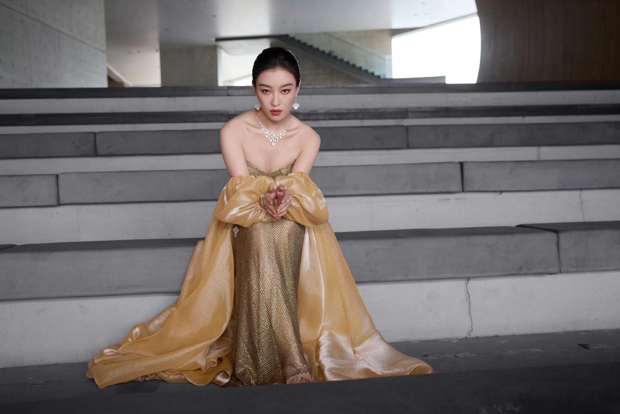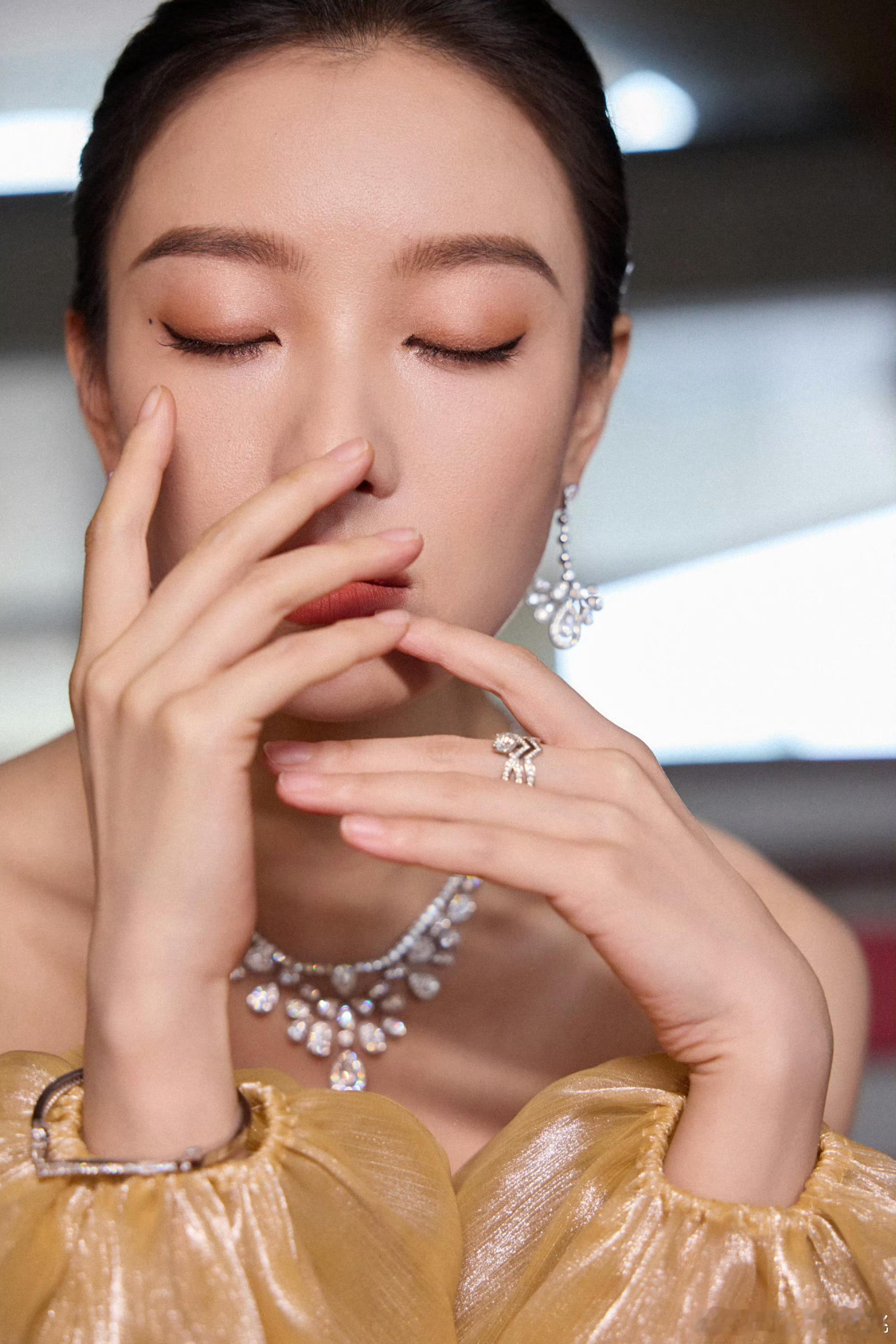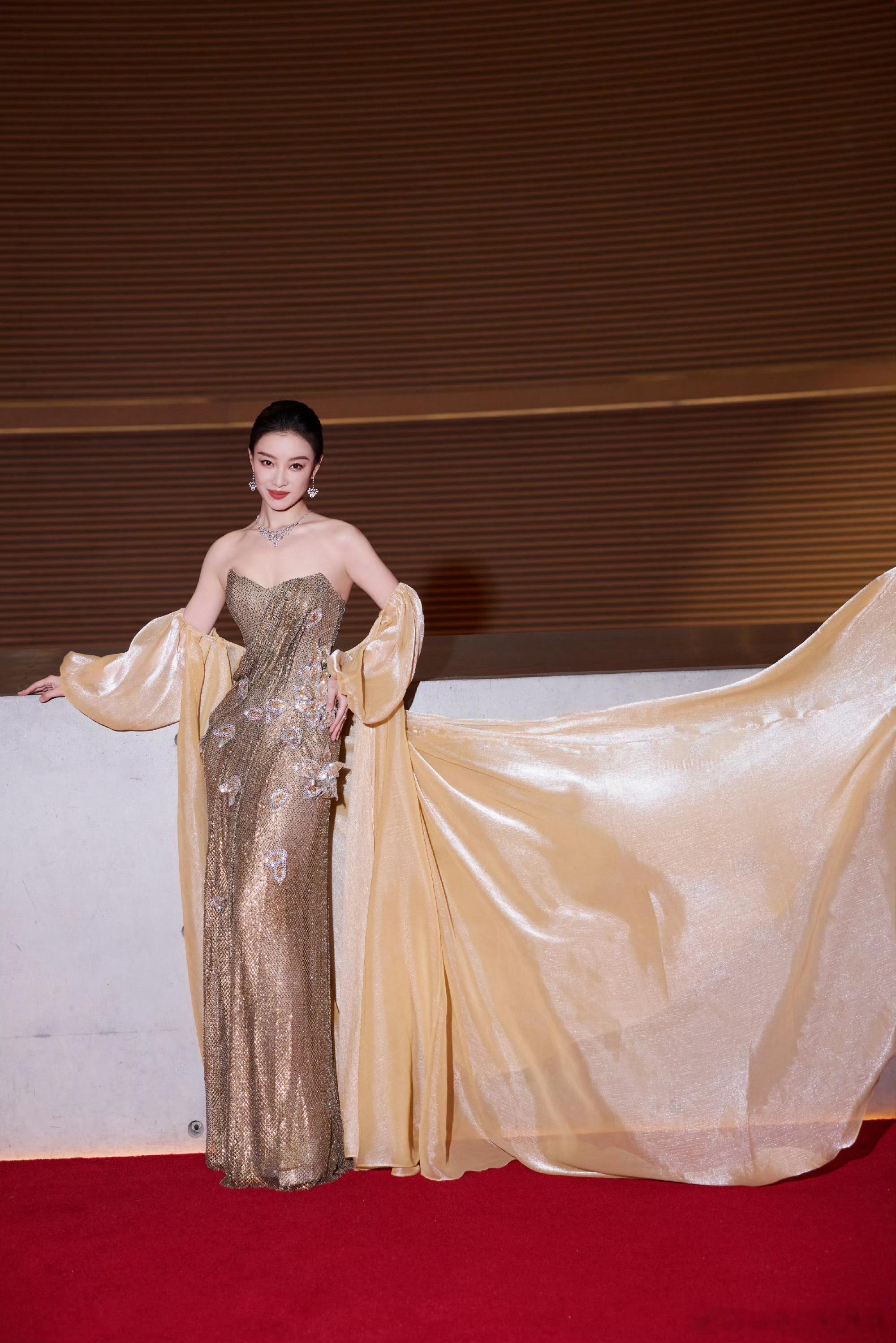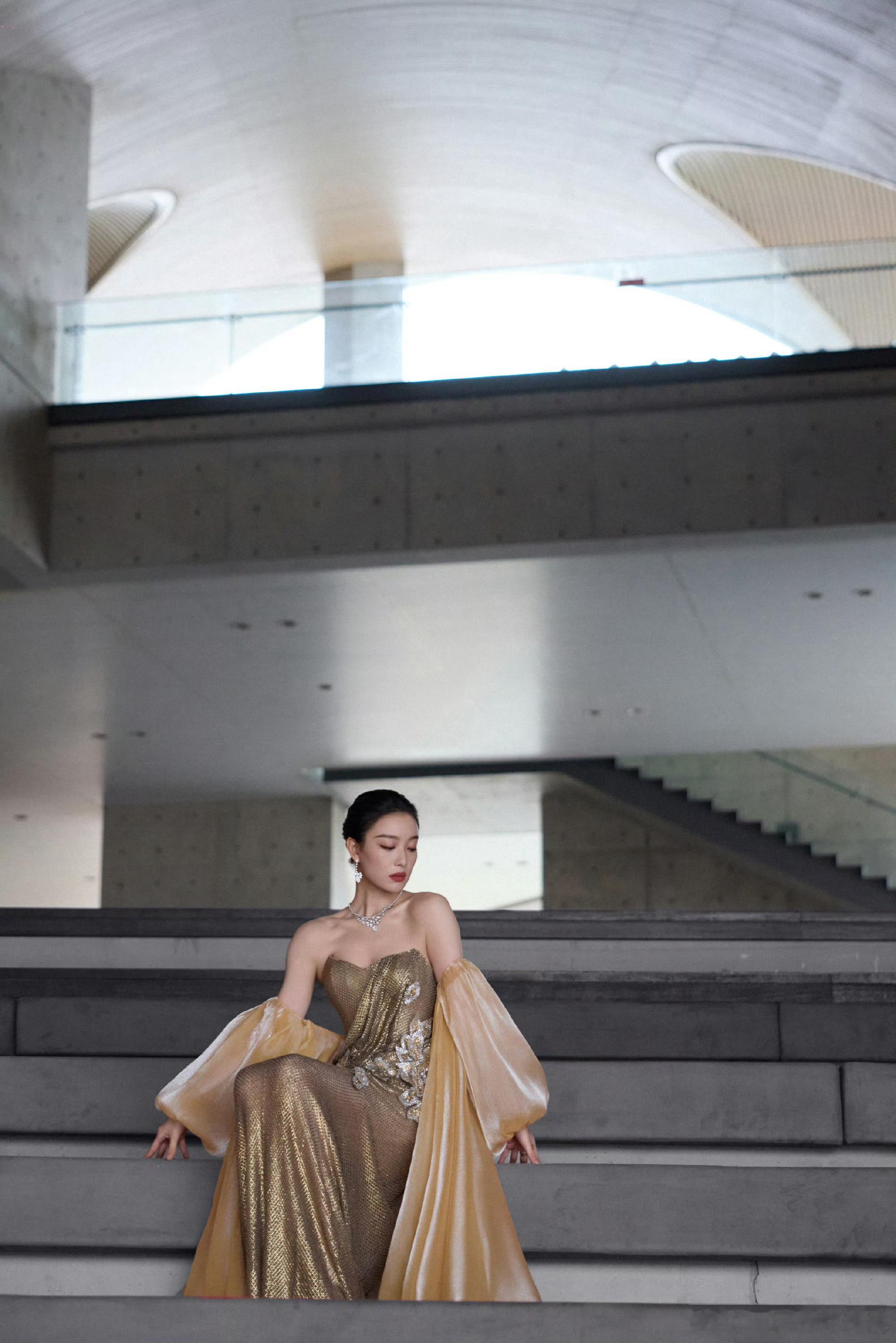身穿TRALINH 鎏金礼服,佩戴尚美巴黎珠宝,又是被美到的一天倪妮鎏金礼服主持