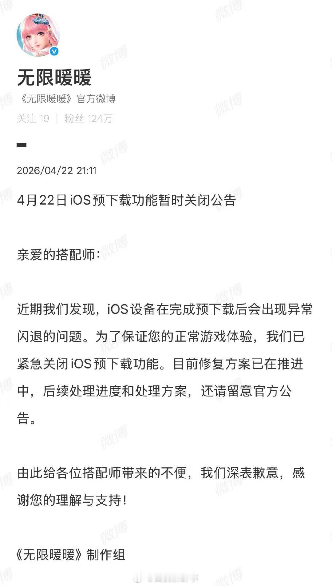 【无限暖暖iOS预下载功能暂时关闭】无限暖暖紧急关闭iOS预下载功能4月22日,发布iOS预下载功能暂时关闭公告:近期我们发现,iOS设备在完成预下载后会出现异常闪退的问题。