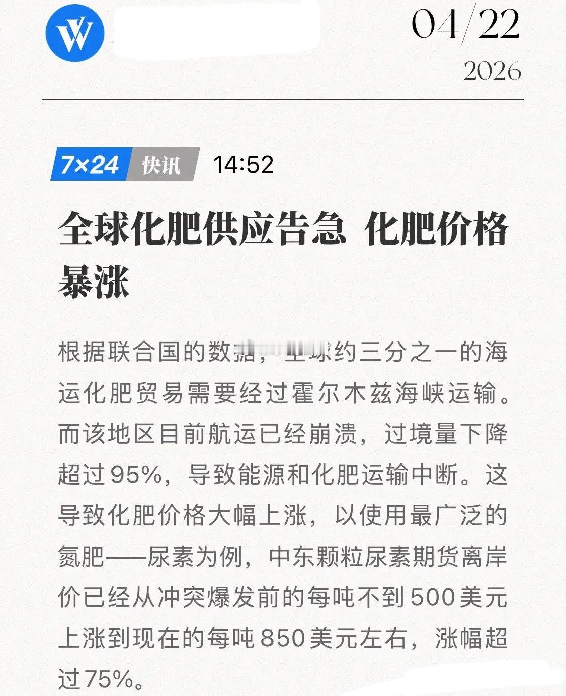 家人们,联合国拉响红色警报⚠️全球化肥断供,隐形风暴来了!全球三分之一化肥都要走霍尔木兹海峡,现在航运几乎瘫痪,运输暴跌95%直接断供。