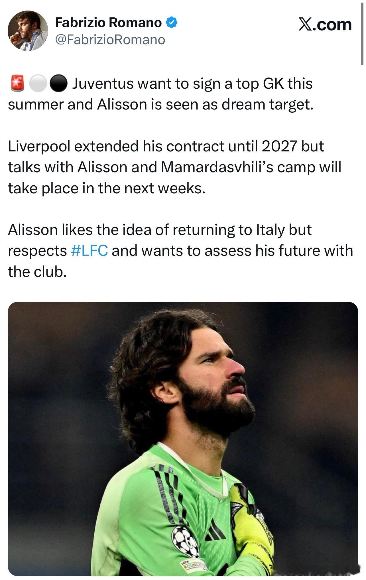 罗马诺也跟进了意大利媒体最近说的尤文想要引进阿利森的消息,表示阿利森是尤文图斯梦想中的那个门将人选。我军虽说是已经和阿利森续约到了2027年,但是会在接下来的几周时间里继续和阿利森以及马马达什维利的团队去沟通。阿利森本人也是对重返意大利持开放态度的,但他同时也尊重我军并希望和我军一起来商谈评估自己的未来。