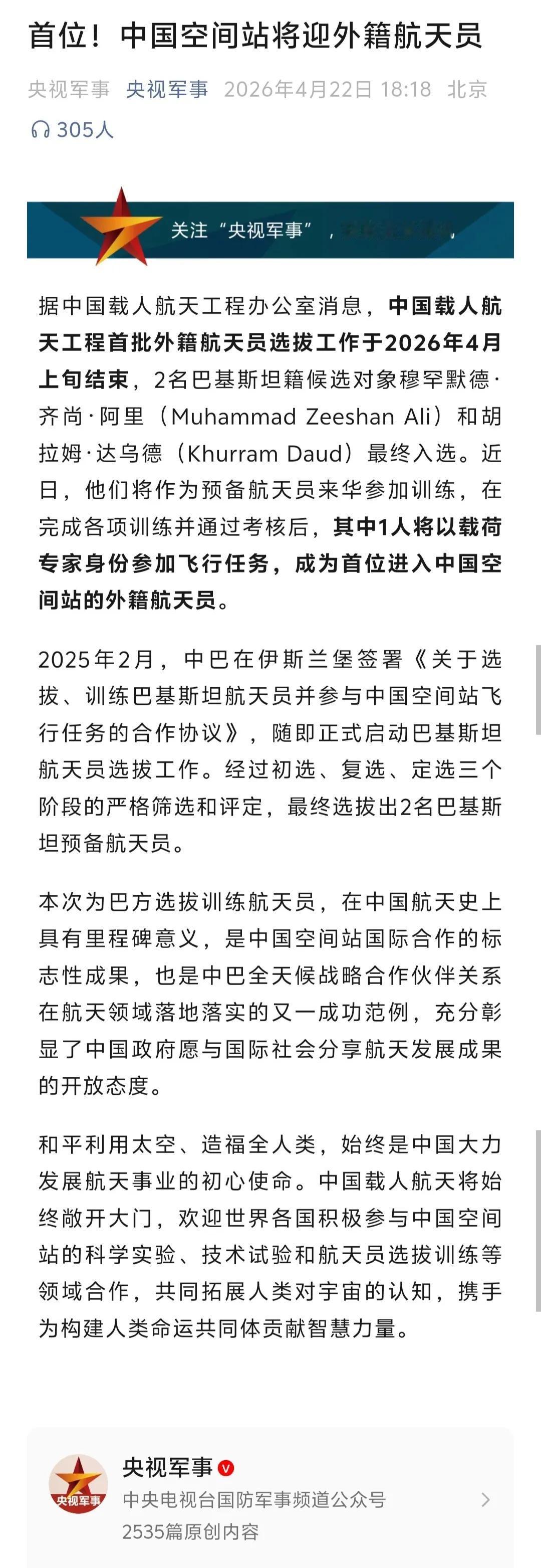 中国空间站将迎来首位外籍航天员,而且如很多网友之前猜的那样来自巴基斯坦。而这也意味着巴基斯坦即将有首位航天员进入太空,这对于振奋巴基斯坦的民族自豪感、进一步深化中巴关系都有着重大意义。对巴基斯坦来说,跟着中国,未来的日子会越来越好。 外籍航天员即将进入中国空间站,还说明中国空间站正式向全球南方国家开放合作,为全球南方国家参与深空探索提供了新范式。