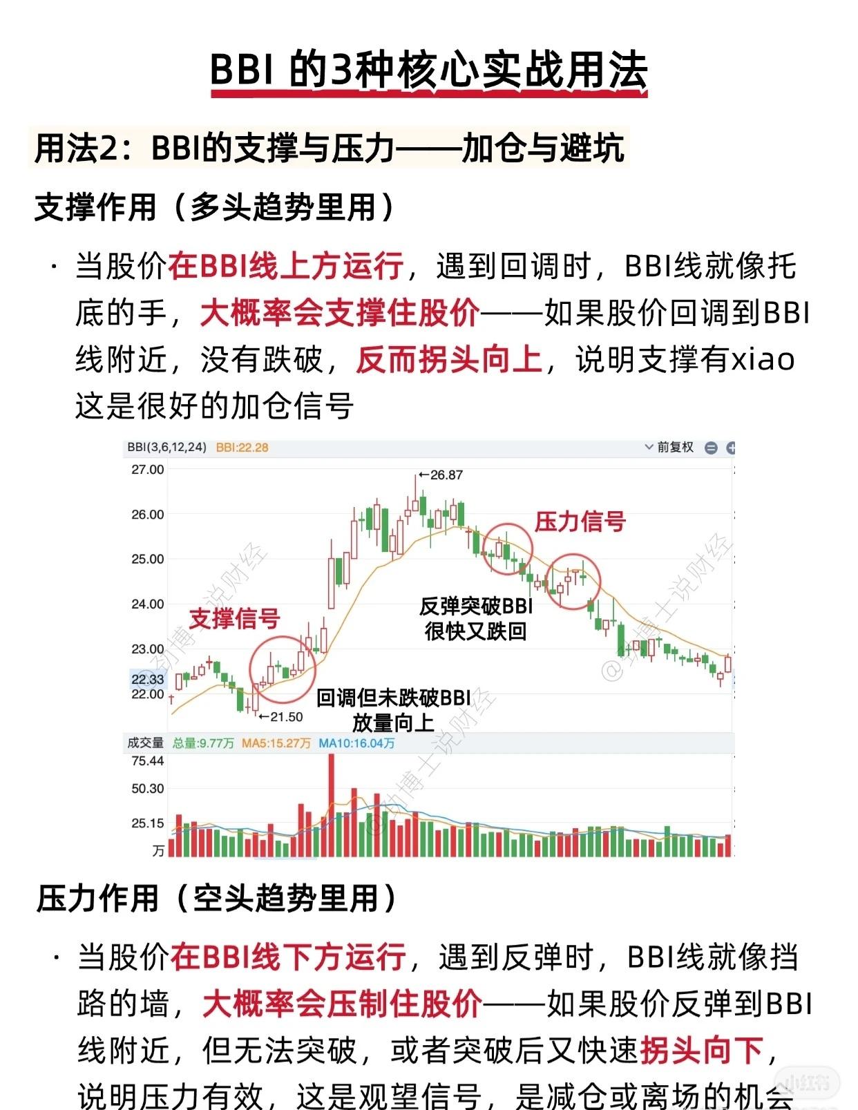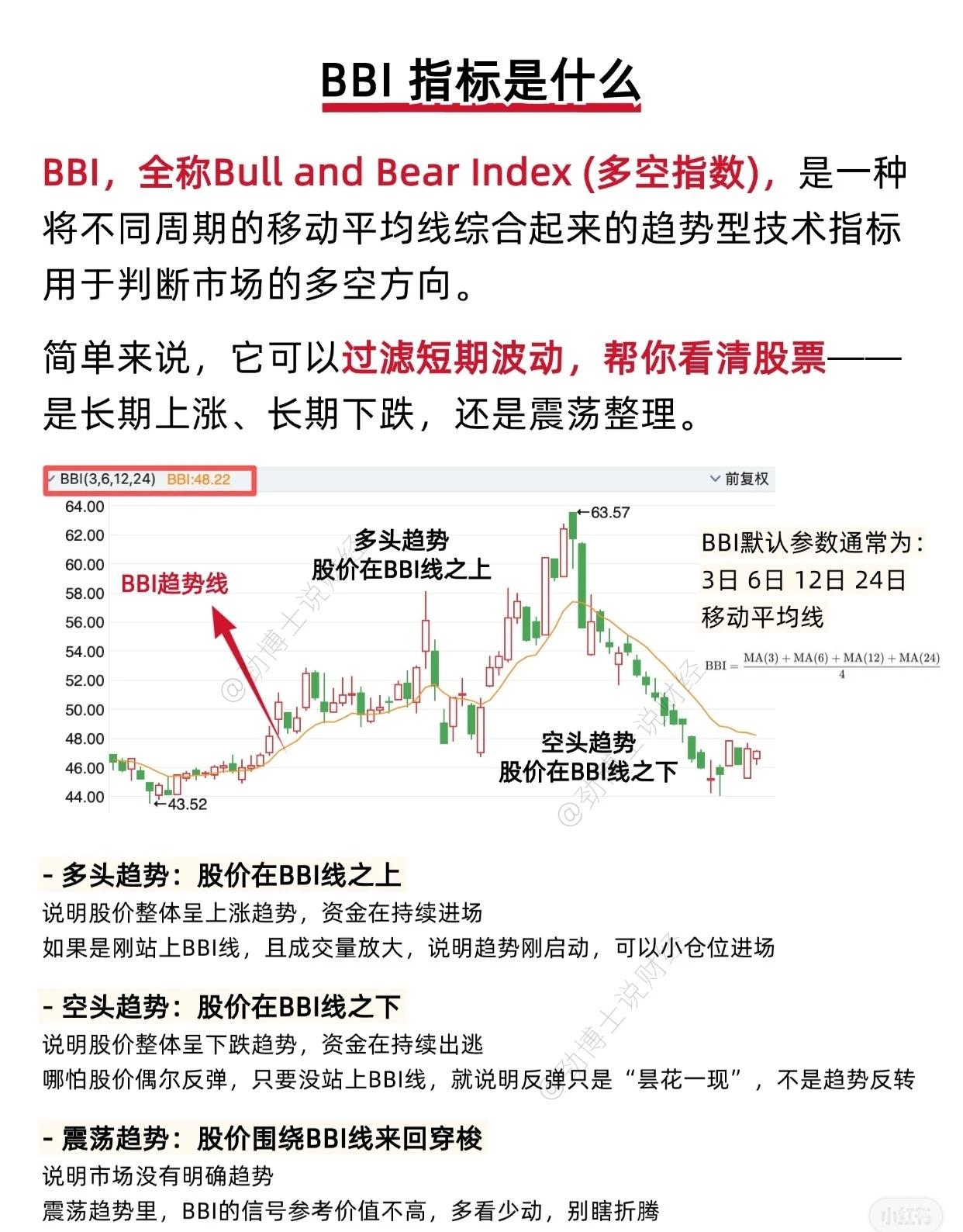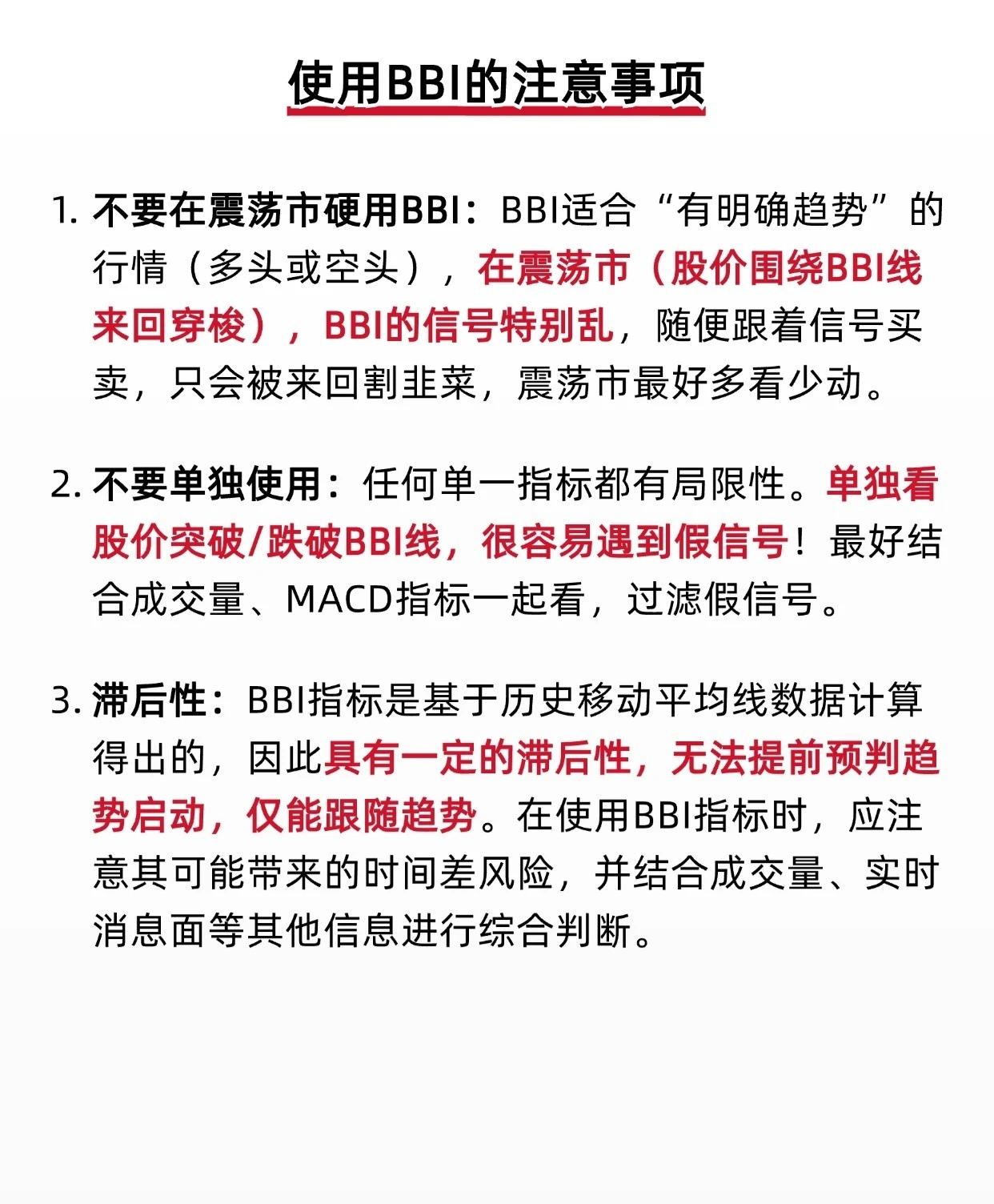 📌 使用BBI指标的注意事项 BBI(Bull & Bear Index,多空指标)是一种趋势跟踪型技术指标,但在实际应用中需注意以下几点,以避免误判或亏损: 1. 避免在震荡市中强行使用BBI BBI最适合用于有明确趋势的行情(无论是多头还是空头)。在震荡市中(股价围绕BBI线反复上下穿梭),BBI信号会频繁切换,极易产生“假突破”或“假跌破”,导致投资者频繁买卖、被市场“来回割韭菜”。 ✅ 建议:震荡市中应“多看少动”,等待趋势明朗后再操作。 2. 不可单独依赖BBI,需结合其他指标验证 任何单一技术指标都存在局限性。若仅依据“股价突破/跌破BBI线”作为买卖依据,极易遭遇假信号。 ✅ 建议:结合成交量和MACD等指标综合判断,可有效过滤虚假信号,提高决策准确率。 3. BBI具有滞后性,仅能跟随趋势而非预测趋势 BBI是基于历史移动平均线数据计算得出的,因此天然带有滞后性,无法提前预判趋势启动点,只能跟随趋势运行。 ✅ 注意:使用BBI时需意识到其“时间差风险”,并结合实时成交量、基本面消息、市场情绪等多维度信息,进行综合研判,避免盲目追涨杀跌。 — 💡 总结一句话: BBI是趋势跟随者,非趋势预言家——用对行情、组合指标、警惕滞后,方能事半功倍。