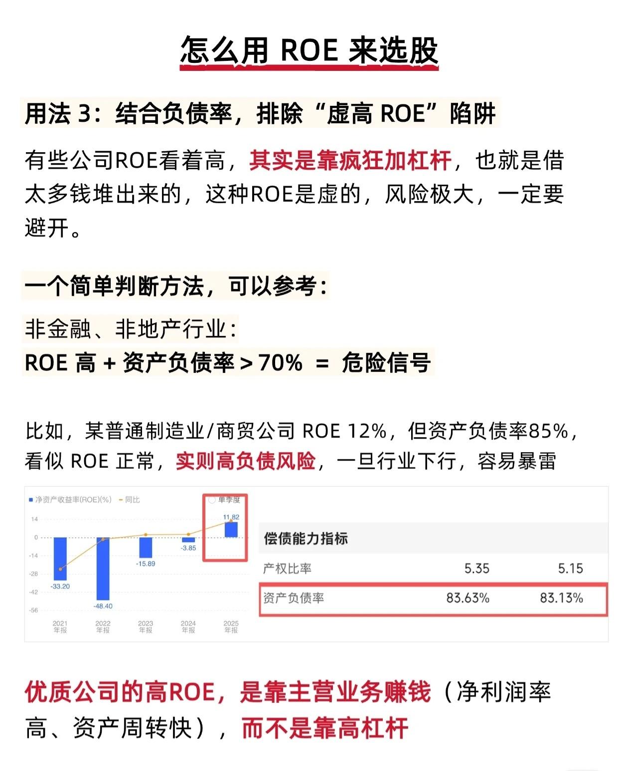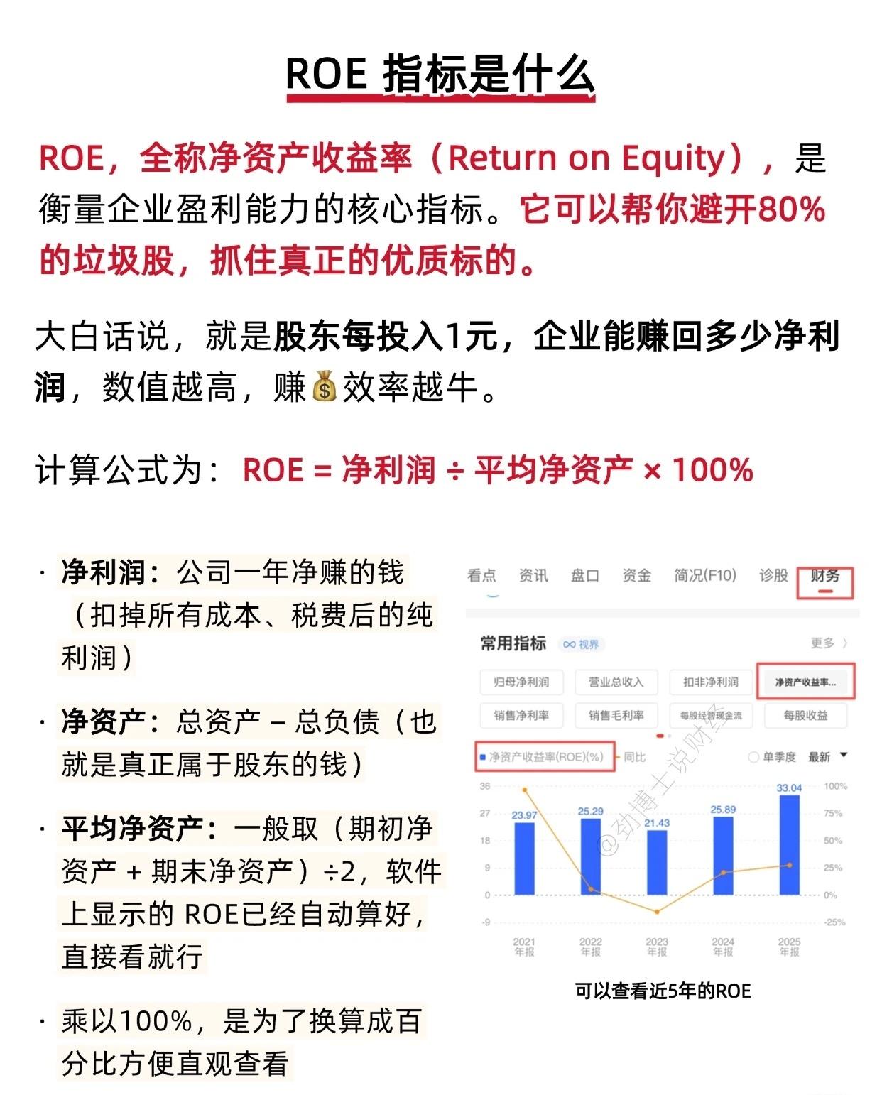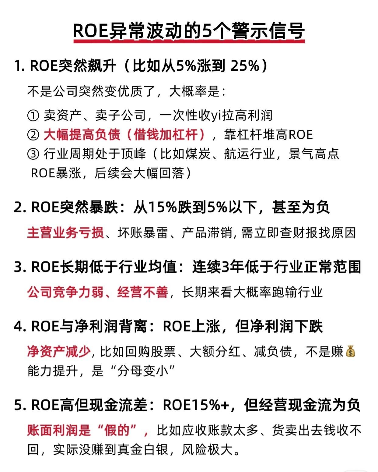 📈 ROE异常波动的5大警示信号 ROE(净资产收益率)是衡量企业盈利能力的重要指标,但其异常波动往往暗藏风险。以下5种情况需高度警惕: 1. ROE突然飙升(例如从5%跃升至25%) ⚠️ 并非公司基本面突然变好,极可能源于: ① 出售资产或子公司,一次性收益拉高利润; ② 大幅提高负债(加杠杆),靠财务杠杆推高ROE; ③ 行业处于周期性顶峰(如煤炭、航运),景气高点后ROE将大幅回落。 → 此类增长不可持续,需警惕“虚胖”。 2. ROE突然暴跌(如从15%骤降至5%以下,甚至为负) ⚠️ 往往预示严重经营问题: 主营业务亏损、坏账集中爆发、产品滞销等。 → 应立即查阅财报,深挖原因,避免踩雷。 3. ROE长期低于行业均值(连续3年低于行业正常范围) ⚠️ 反映公司竞争力薄弱、经营管理不善。 → 长期来看,大概率跑输行业平均水平,投资价值存疑。 4. ROE与净利润背离(ROE上涨,但净利润下降) ⚠️ 核心原因:净资产减少(分母变小)。 常见于:股票回购、大额分红、偿还债务等。 → 并非盈利能力提升,而是“账面优化”,非真实增长。 5. ROE高但现金流差(ROE≥15%,但经营现金流为负) ⚠️ 账面利润可能是“纸面富贵”。 常见情形:应收账款过高、销售回款困难、货已发出但钱未收回。 → 实际未赚到真金白银,风险极高,需谨慎对待。 — 📌 总结建议: 分析ROE时,务必结合利润质量、现金流、行业周期与负债结构综合判断。异常波动往往是风险前兆,切勿被表面数字迷惑。