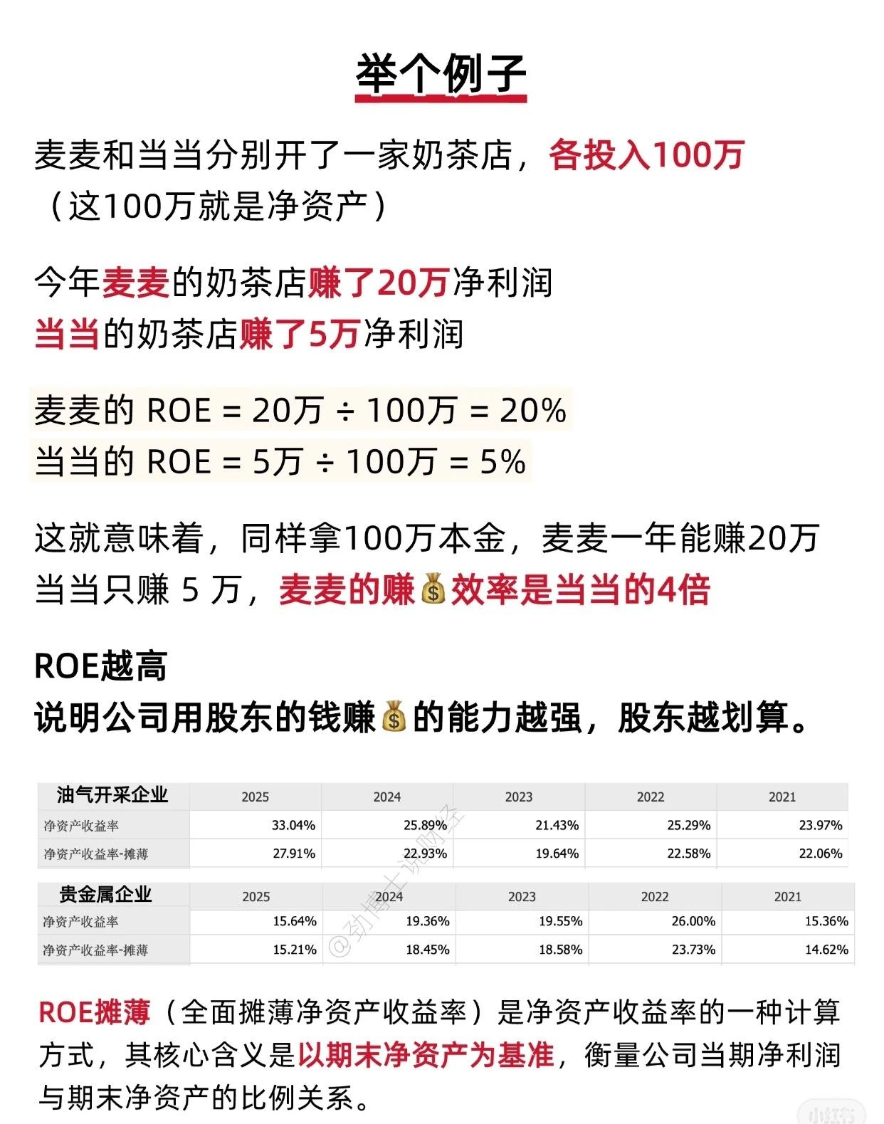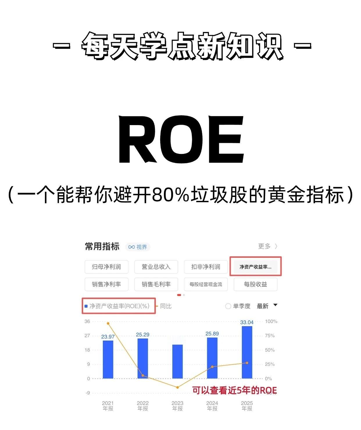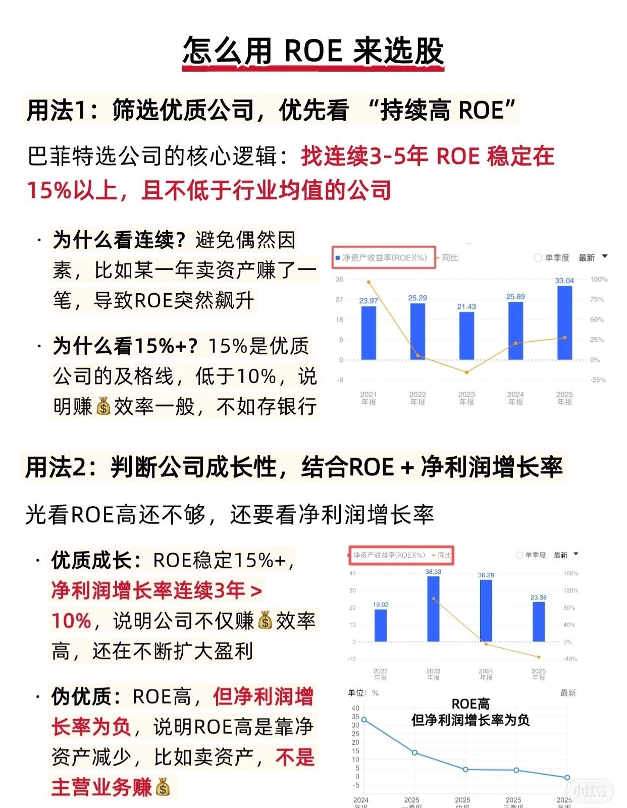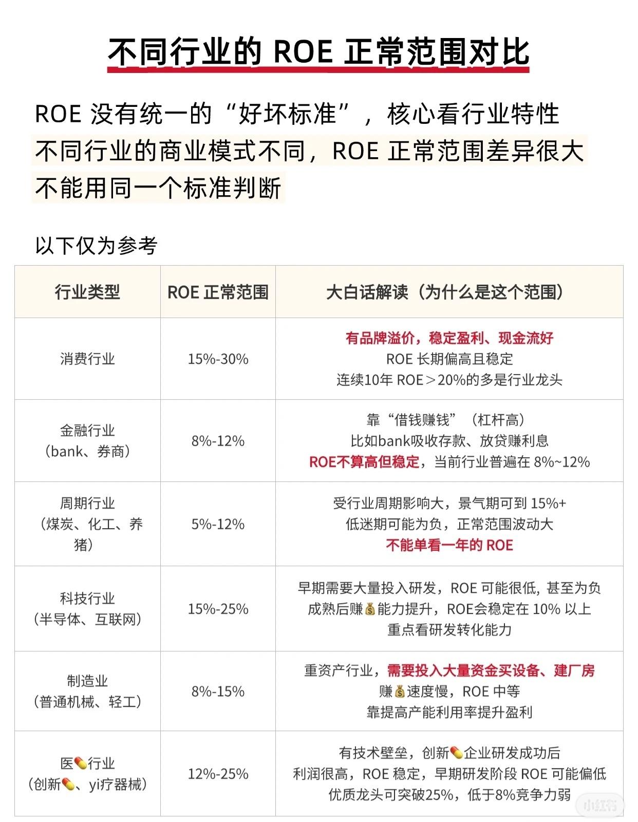 📈 ROE异常波动的5大警示信号 ROE(净资产收益率)是衡量企业盈利能力的重要指标,但其异常波动往往暗藏风险。以下5种情况需高度警惕: 1. ROE突然飙升(例如从5%跃升至25%) ⚠️ 并非公司基本面突然变好,极可能源于: ① 出售资产或子公司,一次性收益拉高利润; ② 大幅提高负债(加杠杆),靠财务杠杆推高ROE; ③ 行业处于周期性顶峰(如煤炭、航运),景气高点后ROE将大幅回落。 → 此类增长不可持续,需警惕“虚胖”。 2. ROE突然暴跌(如从15%骤降至5%以下,甚至为负) ⚠️ 往往预示严重经营问题: 主营业务亏损、坏账集中爆发、产品滞销等。 → 应立即查阅财报,深挖原因,避免踩雷。 3. ROE长期低于行业均值(连续3年低于行业正常范围) ⚠️ 反映公司竞争力薄弱、经营管理不善。 → 长期来看,大概率跑输行业平均水平,投资价值存疑。 4. ROE与净利润背离(ROE上涨,但净利润下降) ⚠️ 核心原因:净资产减少(分母变小)。 常见于:股票回购、大额分红、偿还债务等。 → 并非盈利能力提升,而是“账面优化”,非真实增长。 5. ROE高但现金流差(ROE≥15%,但经营现金流为负) ⚠️ 账面利润可能是“纸面富贵”。 常见情形:应收账款过高、销售回款困难、货已发出但钱未收回。 → 实际未赚到真金白银,风险极高,需谨慎对待。 — 📌 总结建议: 分析ROE时,务必结合利润质量、现金流、行业周期与负债结构综合判断。异常波动往往是风险前兆,切勿被表面数字迷惑。