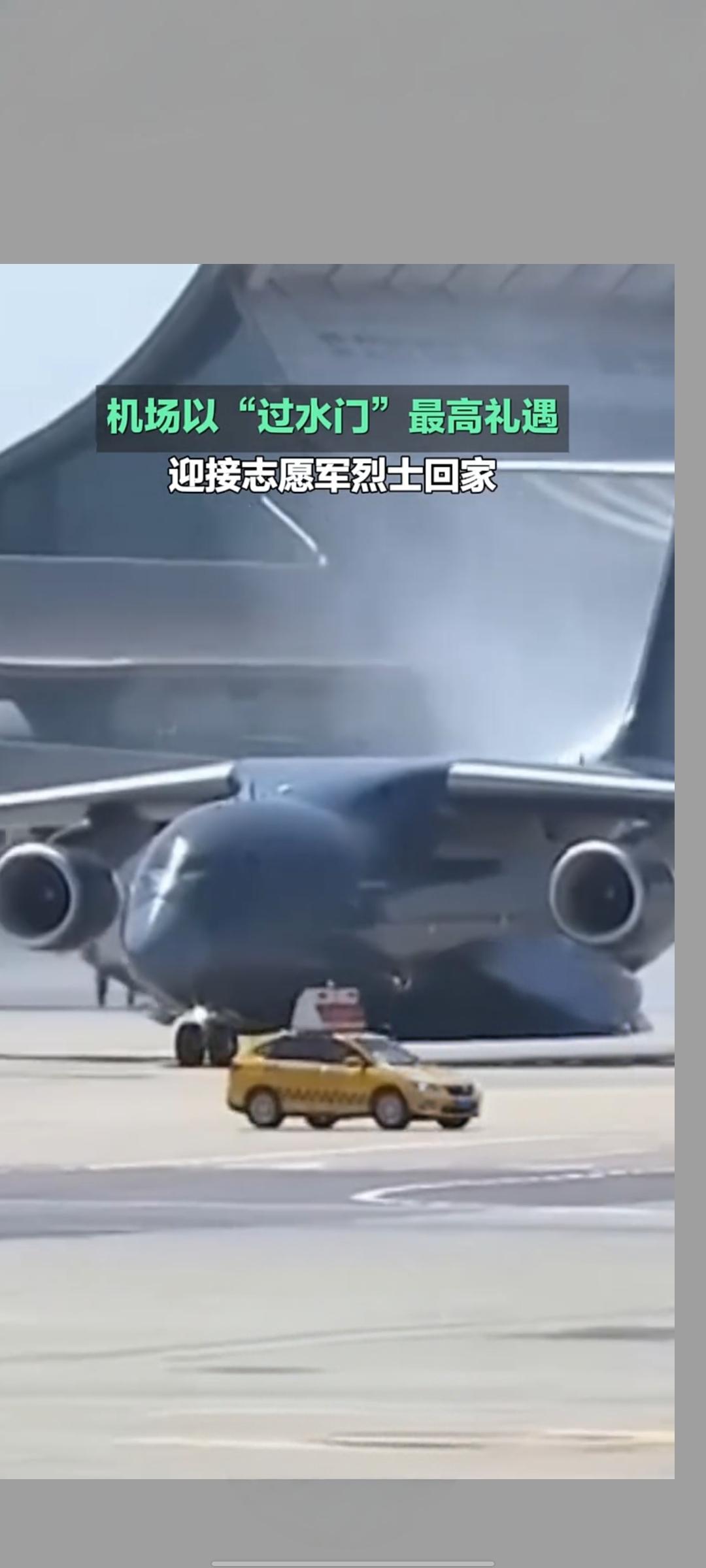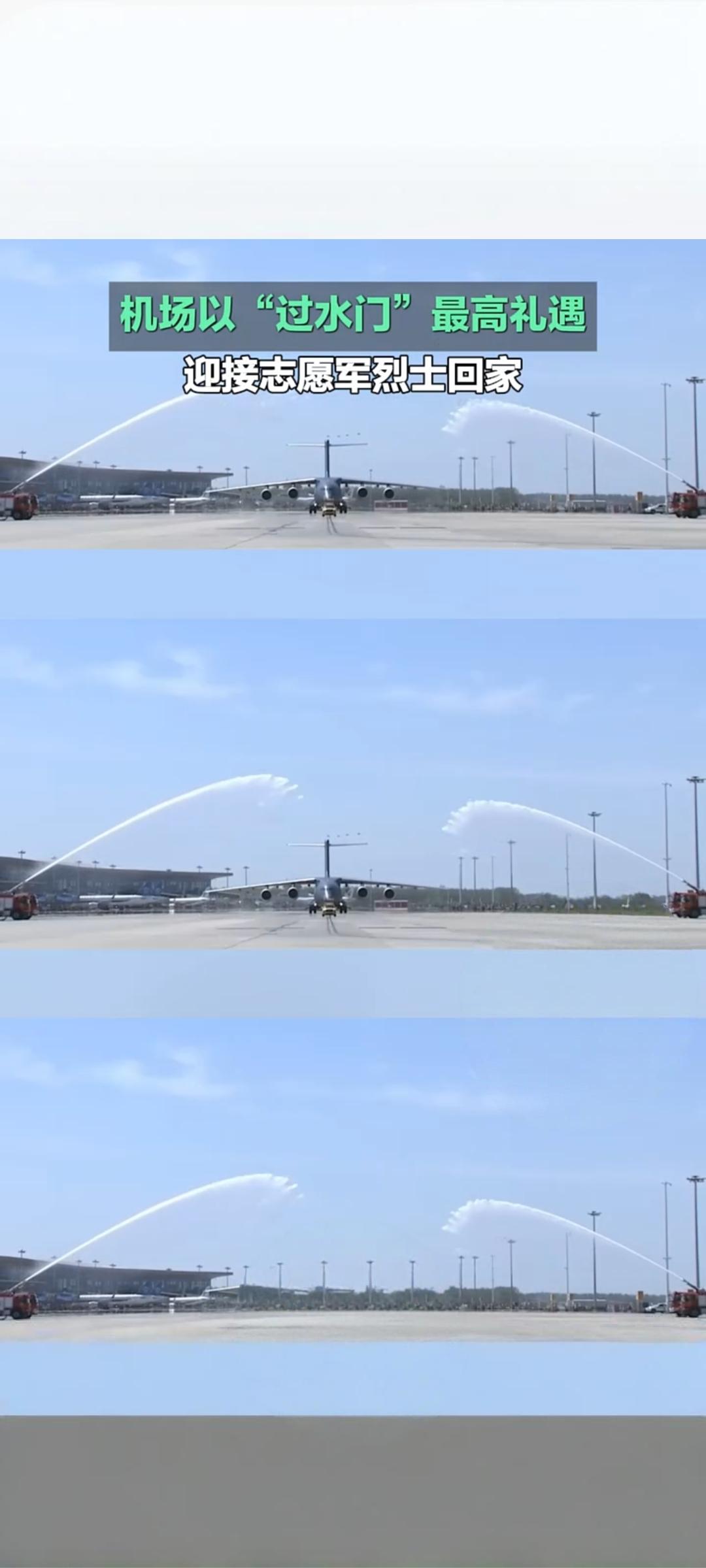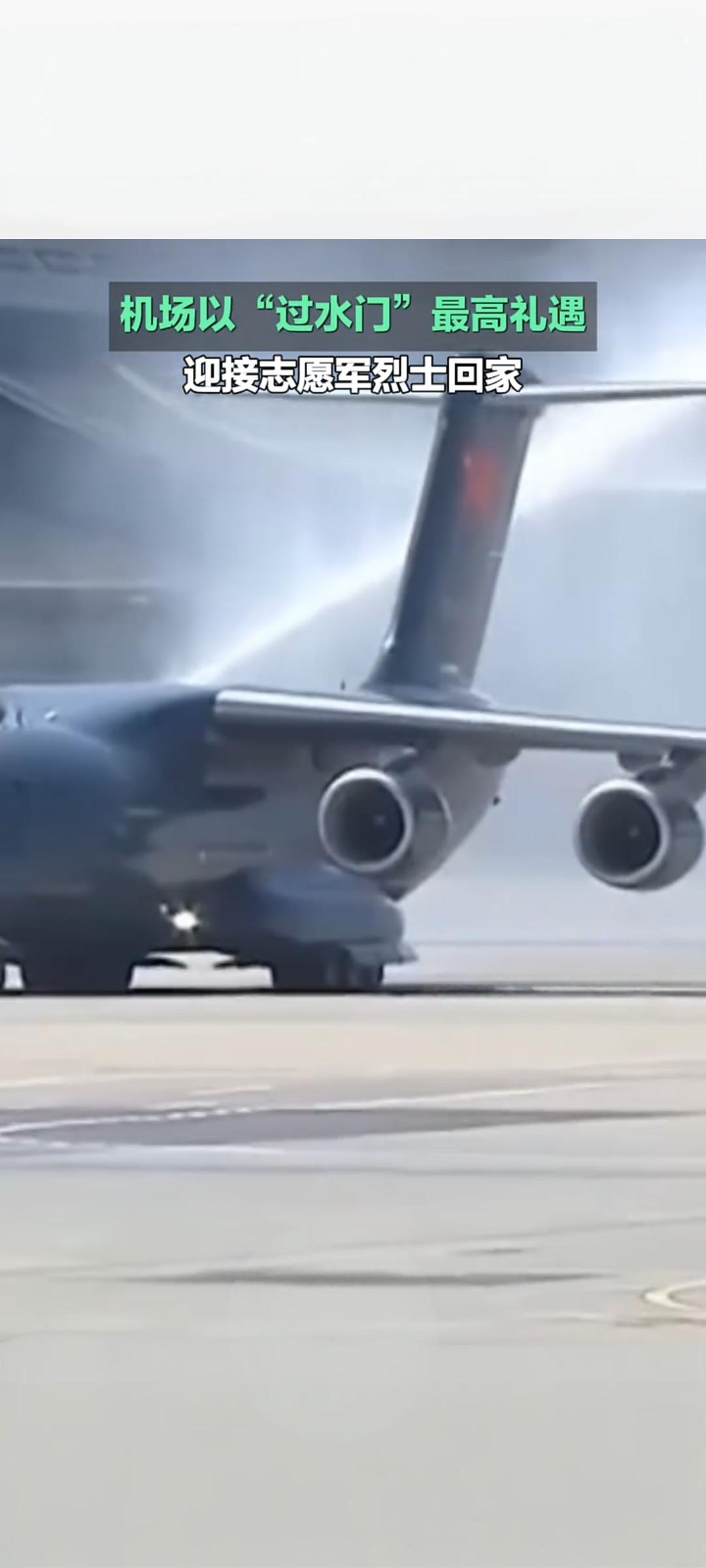 最高礼遇迎忠魂!沈阳桃仙机场“过水门”迎接志愿军烈士回家 4月22日,沈阳桃仙国际机场以航空界最高礼仪“过水门”,迎接第十三批在韩中国人民志愿军烈士遗骸荣归祖国,告慰先烈、致敬英雄 。 当日上午,中韩双方在韩国仁川国际机场完成烈士遗骸交接。此次回归的共12位志愿军烈士遗骸及146件相关遗物,由中国空军运-20B专机接运回国 。专机进入中国领空后,4架歼-20战机编队护航,“双20”列阵长空,以蓝天仪仗致敬先烈 。11时25分,运-20B平稳降落沈阳桃仙机场,机场消防车辆喷射出水柱,形成庄严“水门”,为英灵洗尘接风。 随后,迎回仪式正式举行。礼兵护送覆盖五星红旗的烈士棺椁缓步走下专机,现场全体人员肃立鞠躬,气氛庄重肃穆 。抗美援朝老战士、烈士家属、部队官兵、青少年代表等各界人士到场迎接,共同见证英雄回家时刻 。 自2014年起,中韩已连续13年开展在韩志愿军烈士遗骸交接工作,累计已有千余位先烈英灵回归故土。此次以国之重器护航、最高礼仪迎接,彰显着国家对英烈的尊崇与缅怀,传承着伟大抗美援朝精神,激励后人铭记历史、珍爱和平。 志愿军归家 志愿军遗骸迎回 最高礼遇迎军婚 沈阳桃仙机场
