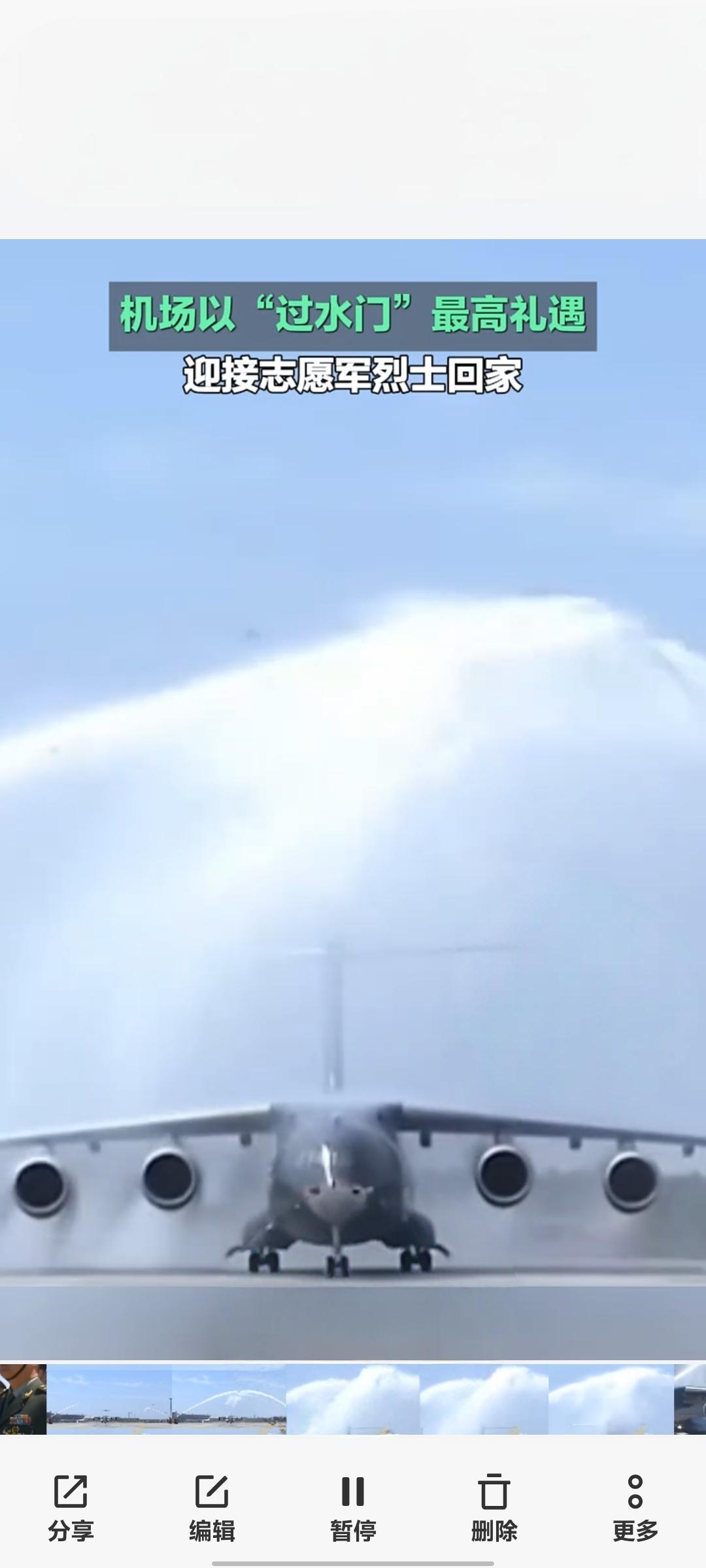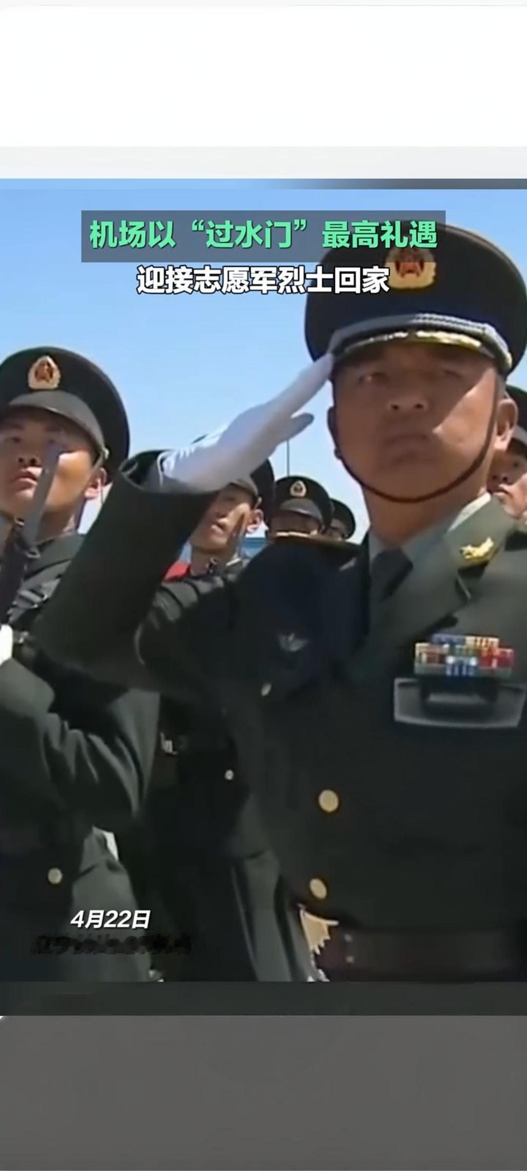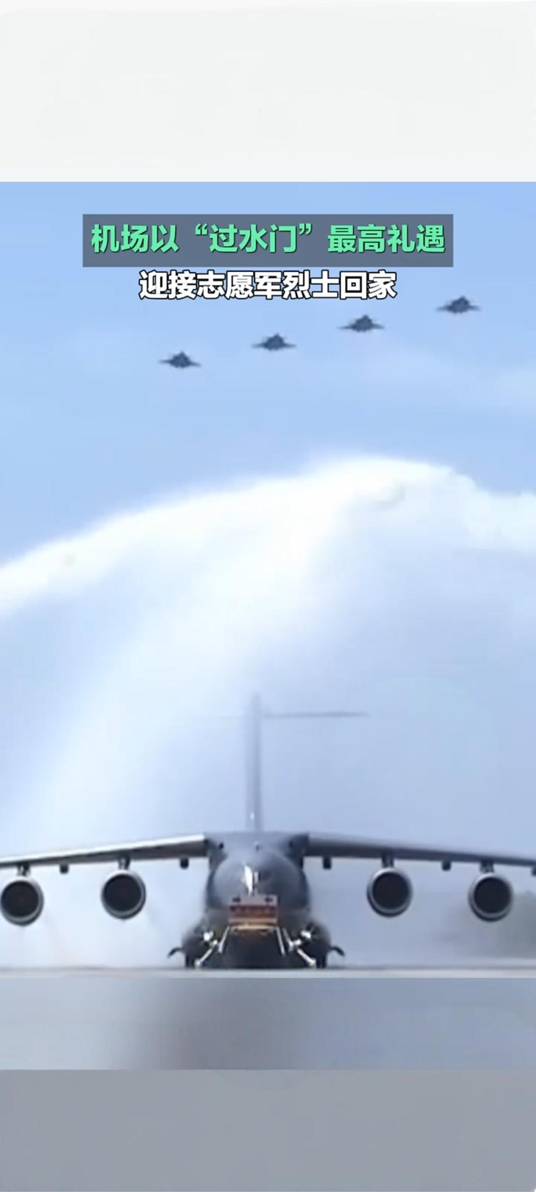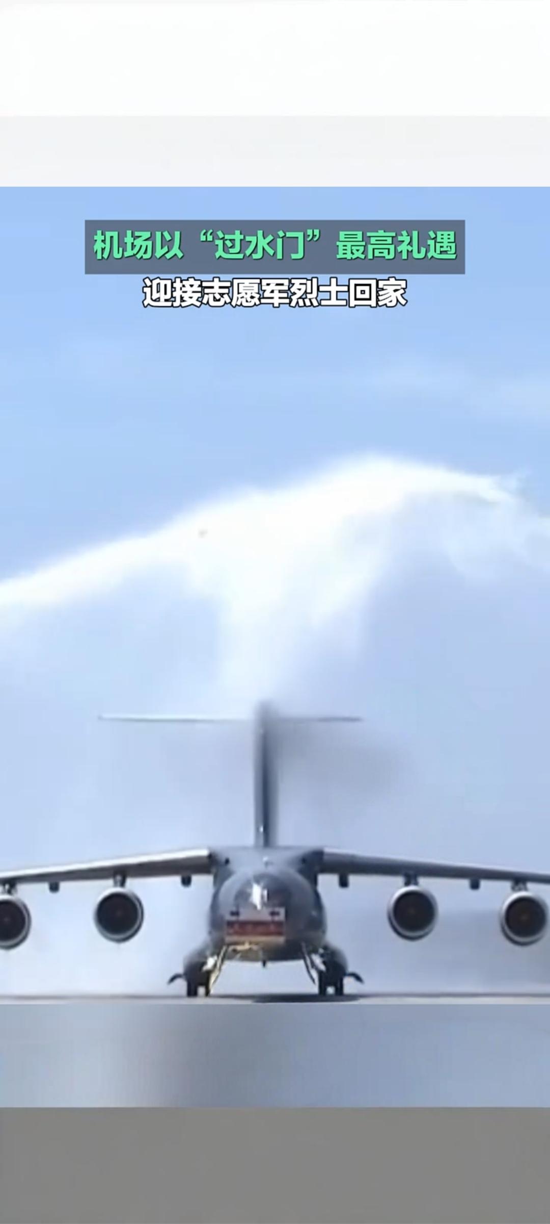 最高礼遇迎忠魂!沈阳桃仙机场“过水门”迎接志愿军烈士回家 4月22日,沈阳桃仙国际机场以航空界最高礼仪“过水门”,迎接第十三批在韩中国人民志愿军烈士遗骸荣归祖国,告慰先烈、致敬英雄 。 当日上午,中韩双方在韩国仁川国际机场完成烈士遗骸交接。此次回归的共12位志愿军烈士遗骸及146件相关遗物,由中国空军运-20B专机接运回国 。专机进入中国领空后,4架歼-20战机编队护航,“双20”列阵长空,以蓝天仪仗致敬先烈 。11时25分,运-20B平稳降落沈阳桃仙机场,机场消防车辆喷射出水柱,形成庄严“水门”,为英灵洗尘接风。 随后,迎回仪式正式举行。礼兵护送覆盖五星红旗的烈士棺椁缓步走下专机,现场全体人员肃立鞠躬,气氛庄重肃穆 。抗美援朝老战士、烈士家属、部队官兵、青少年代表等各界人士到场迎接,共同见证英雄回家时刻 。 自2014年起,中韩已连续13年开展在韩志愿军烈士遗骸交接工作,累计已有千余位先烈英灵回归故土。此次以国之重器护航、最高礼仪迎接,彰显着国家对英烈的尊崇与缅怀,传承着伟大抗美援朝精神,激励后人铭记历史、珍爱和平。 志愿军归家 志愿军遗骸迎回 最高礼遇迎军婚 沈阳桃仙机场