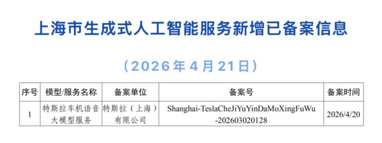 特斯拉 日前,网信上海发布最新公告,上海市新增一款完成备案的生成式人工智能服务,使得累计备案服务数量达到158款。最新备案的服务为特斯拉车机语音大模型服务,由特斯拉(上海)有限公司负责备案,备案日期为4月20日。