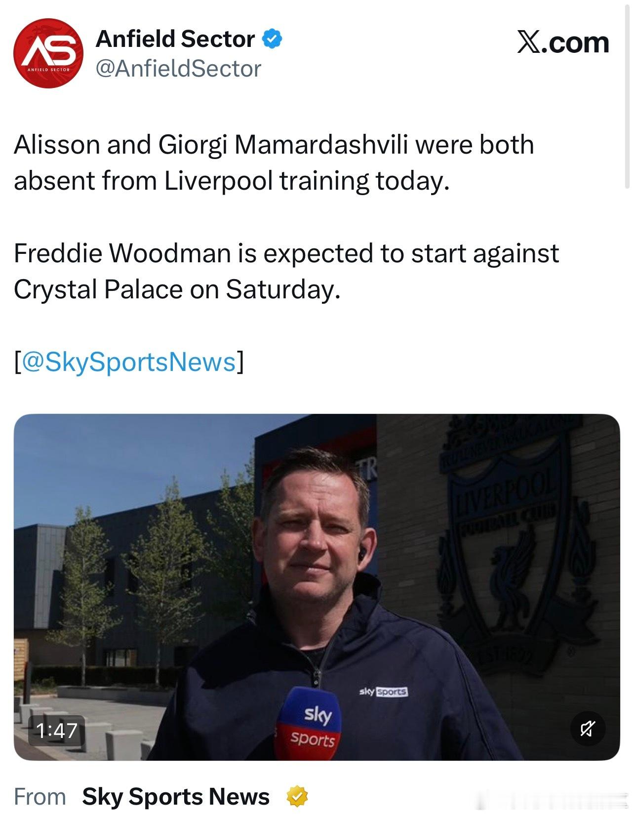 阿利森和马马达都缺席了今天的训练,伍德曼应该是会首发出战对阵水晶宫的比赛了。还是有个好消息的,麦康奈尔今天参加训练了。