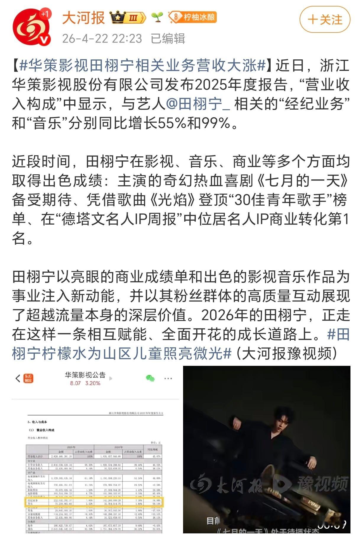 华策影视田栩宁相关业务营收大涨很早就说过,华策给商顶田栩宁和柠檬水磕一个