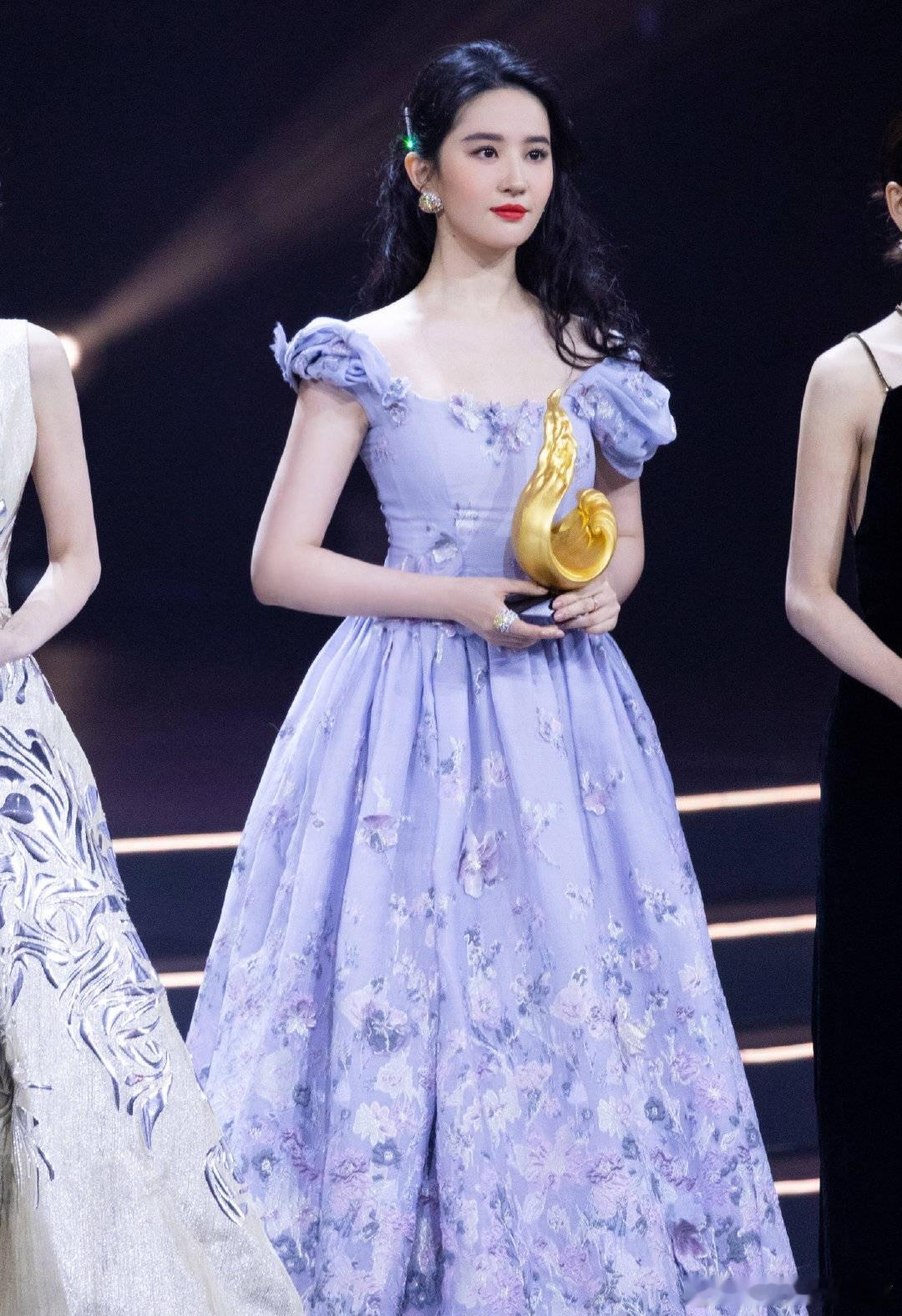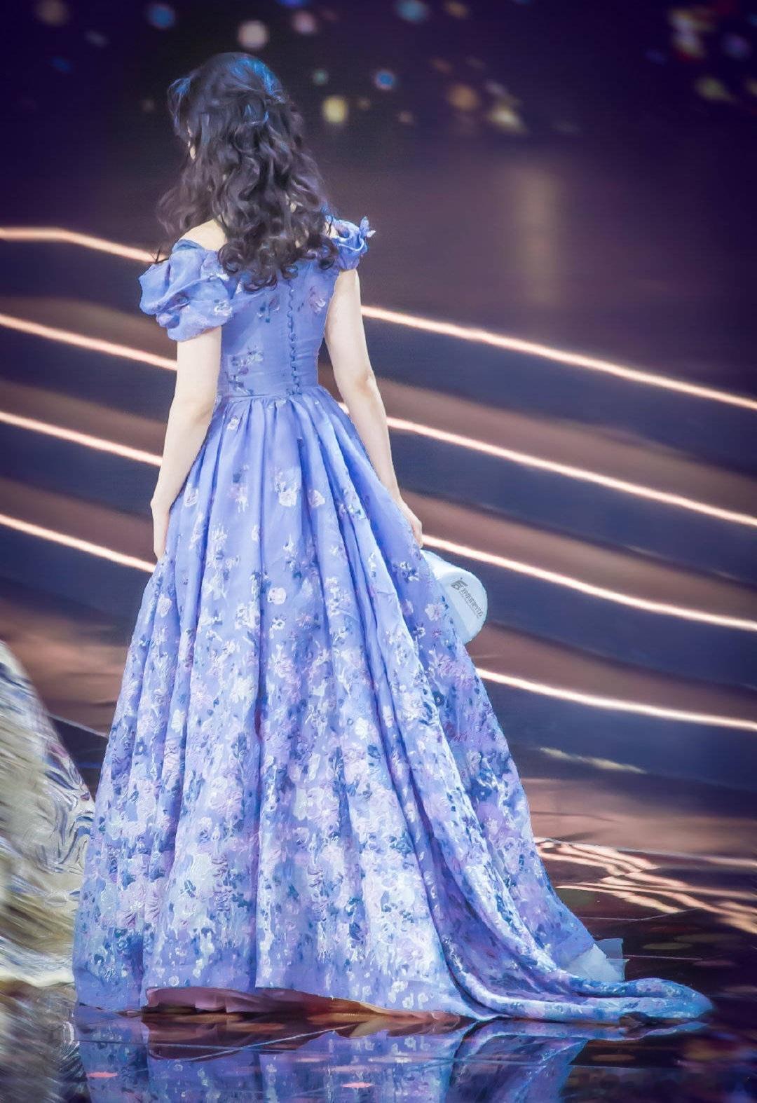 配饰上,精致的花卉耳饰与裙身印花相呼应,简约又精致。红唇妆点气色,与淡紫色礼服形成撞色,凸显明艳气质。颁奖盛典现场,舞台灯光璀璨,背景暖光线条与深色幕布,既突出了礼服色彩,又营造出庄重浪漫氛围。
