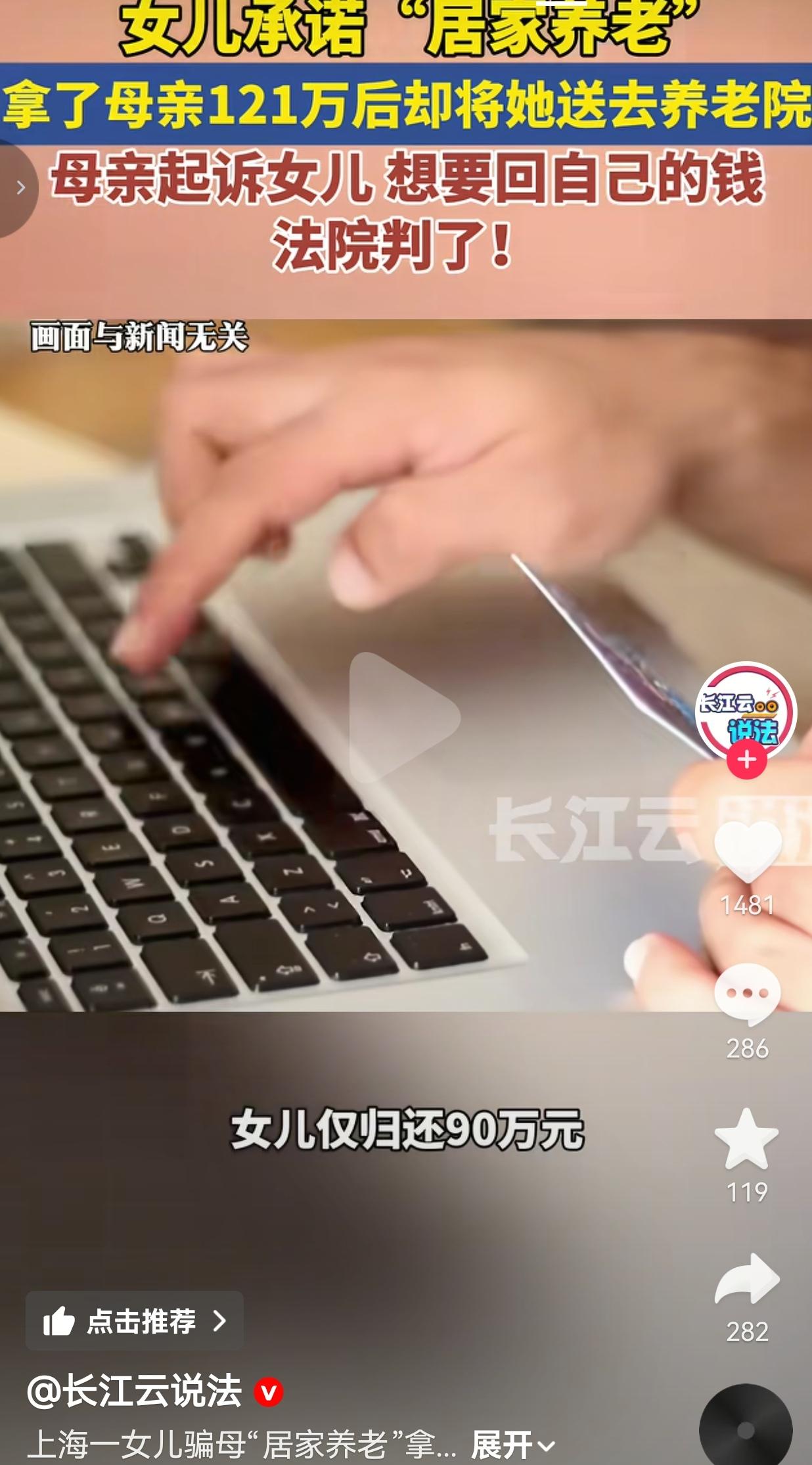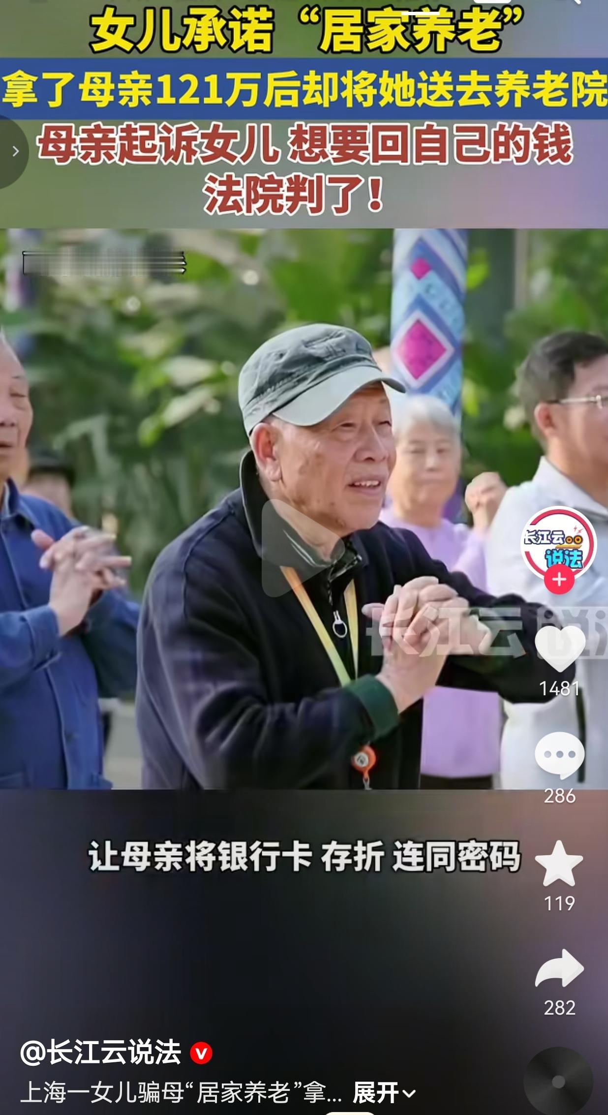 女子拿了母亲121万养老钱,承诺居家养老,结果,钱一到手,转头就把88岁亲妈送进了养老院,法院判了! 我真的搞不懂,怎么会有女儿,能把亲妈算计得这么彻底。 这事就发生在上海,88岁的马老太,被自己女儿骗得一干二净。 女儿当初拍着胸脯跟她说:“妈,你把钱都交给我,我给你养老,以后咱们就住一起,我天天陪着你。”老太太信了。 先是把自己的银行卡、存折,连密码一起给了女儿,又亲手交了48万现金。她以为这是给自己买的晚年安稳,没想到是给白眼狼递了刀。 前前后后,女儿一共拿了她121万,一分不少。可钱一到手,承诺就变了味。 女儿再也不提居家养老的事,直接把88岁的老太太送进了养老院,连面都很少露。 老太太想把钱要回来,女儿只肯还90万,剩下的30多万死不认账,说什么都不肯给。 老太太被逼得没办法,只能把亲女儿告上了法庭。 法庭上,法院直接认定,母女俩构成保管合同关系,子女根本无权擅自处置老人的财产。 最终判决女儿必须返还剩余的30多万元,而且这判决早就生效,钱也已经履行完毕了。 网友看到后评论说:“这哪是女儿啊,分明是来讨债的吧?养老钱都骗,心是石头做的?” 也有的网友说:“我要是这么对我妈,我这辈子都睡不踏实,她倒好,拿着亲妈的钱心安理得。” 还有的网友说:“给我看气笑了,48万现金+73万存款,老太太一辈子的积蓄,就这么被掏空了?” 更有网友表示:“以后可别再说养儿防老了,养出个讨债鬼,连养老的钱都给你算计没了。” 说真的,我看完这事儿,后脊梁骨直发凉。 一个88岁的老人,她这辈子最大的底气是什么?不就是手里那点养老钱吗?她把钱交给女儿,交的不是数字,是自己的安全感,是对女儿的全部信任。 可她女儿呢?把这份信任当成了提款机,拿了钱就翻脸不认人,把亲妈丢进养老院就不管了。 这种人,法律判她还钱,可良心的债,她这辈子都还不清。她以为自己占了天大的便宜,其实丢的是做人最基本的底线。连亲妈都能骗,她这辈子还能信谁? 我一直觉得,父母给孩子的爱,从来都是真心换真心,不是拿真心喂白眼狼。 当妈的掏心掏肺,当儿女的就该知恩图报,这不是义务,是做人的本分。 别拿养老当借口,算计生你养你的人,这辈子都抬不起头。 最后,我想说的是:人心换人心,换不来就趁早死心。 对此,你怎么看? 来源:长江云说法