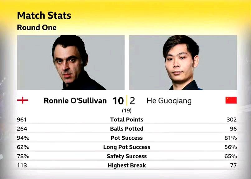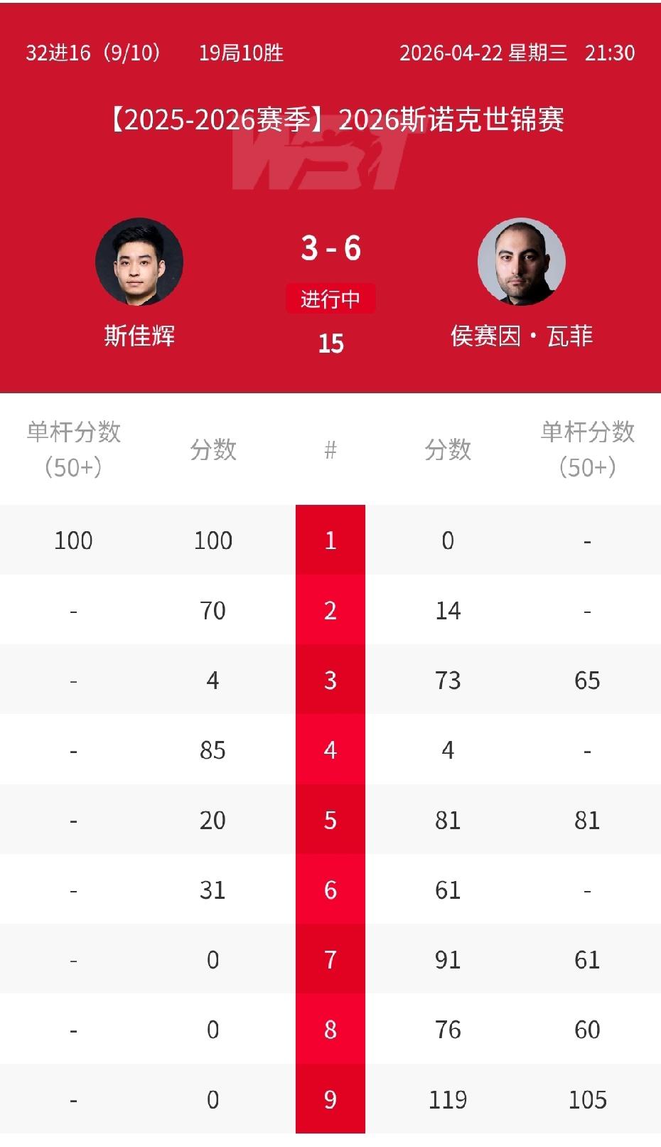 奥沙利文如约晋级16强,下一轮对阵希金斯!至此75三杰再度全员晋级16强。 两个5连鞭,3杆单杆破百,火箭10-2轻松击败国强晋级。 中国球员再度遭遇重创,斯佳辉恐成为第一个出局的种子球员。 3-1领先瓦菲,随后被瓦菲打了一个5连鞭,最终首阶段3-6落后瓦菲。