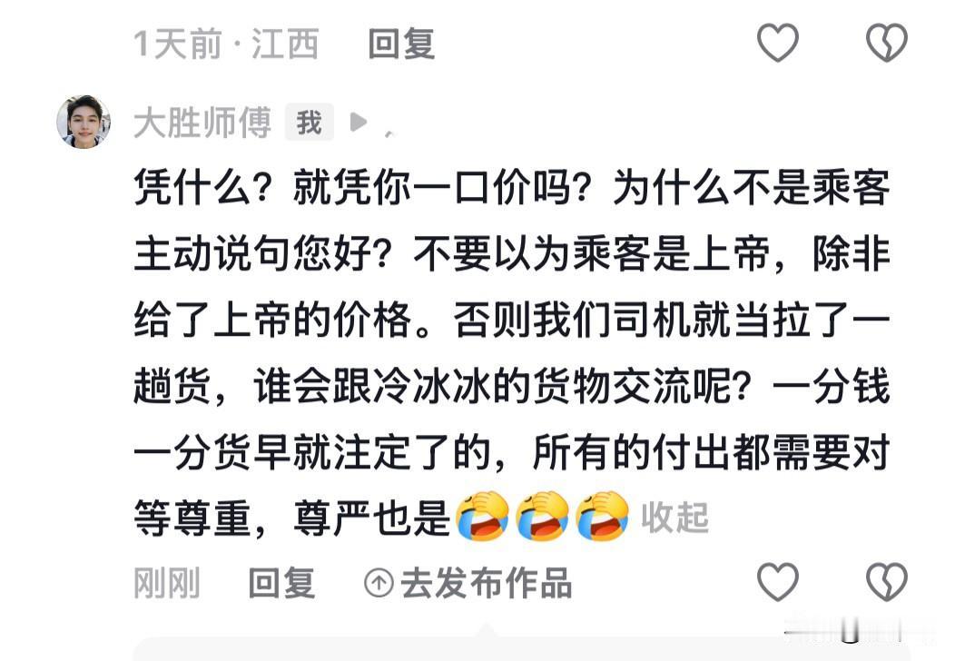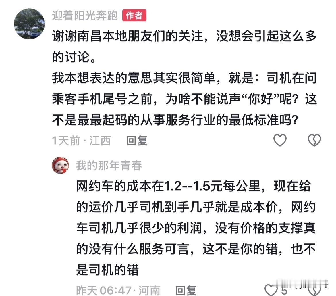 刚刚刷一个视频,一位来昌参加阅读大会的朋友,发了一条视频怼南昌的网约车司机。(见图一) 看到这个我是自然不能忍,所以我毫不犹豫的写了一条评论回复(见图二),我觉得尊重是相互的,您既然不尊重我们南昌网约车司机,那就不能怪我们不尊重您从远道而来了。 本来这个事情就是大家相互尊重并理解,难道网约车司机不是累了一天吗?开个阅读大会会比开网约车更累,哪怕你的理由是远道而来,单凭来者是客我们尚理解。(图三是网友回复) 但你的第一句居然是必须司机先对他说您好,平台都没这个规矩,法律也没有规定司机得先说您好。不都是谁主动都可以吗? 凭什么要司机先说,就凭你打了个特惠一口价? 那就只有一句,对不起! 网约车 网约车司机感悟 南昌读书会