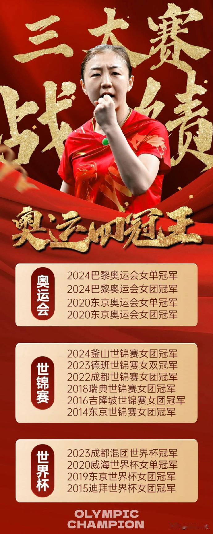 陈梦职业生涯共获得 4 枚奥运会金牌、5 枚世乒赛金牌及 3 枚世界杯金牌,是历史上第三位卫冕奥运会乒乓球女单冠军的运动员。 三大赛冠军 奥运会(4 金) 女单冠军:2020 东京奥运会、2024 巴黎奥运会(成功卫冕)。 女团冠军:2020 东京奥运会、2024 巴黎奥运会。 世乒赛(5 金) 女团冠军:2014、2016、2018、2022、2024 年。 女双冠军:2023 年德班世乒赛。 世界杯(3 金) 女单冠军:2020 年。 女团冠军:2015、2019 年。 其他国际及国内赛事 国际乒联总决赛:4 次女单冠军(2017-2020 年)。 WTT 大满贯:2022 新加坡女单、2024 沙特大满贯女单。 亚运会:2014 女双、2018 及 2023 女团冠军。 全运会:2025 年第十五届女团冠军。 陈梦于 2024 年 12 月宣布退出国际排名,但保留了已获荣誉记录。