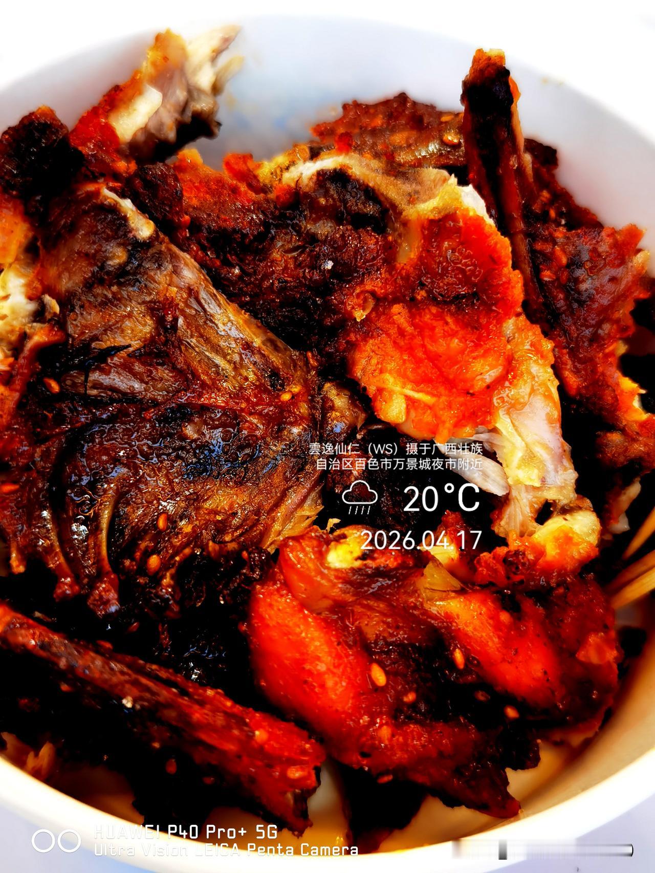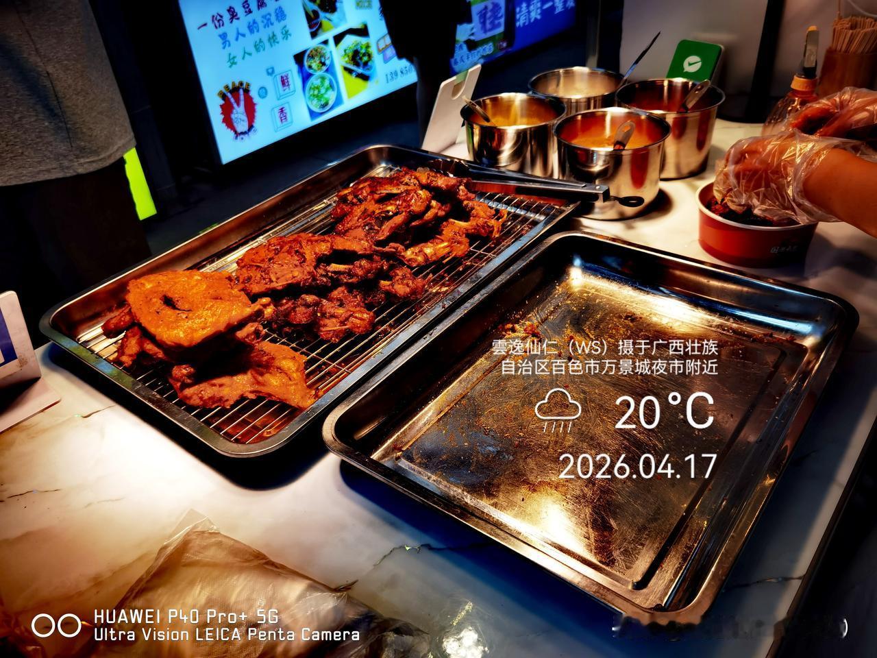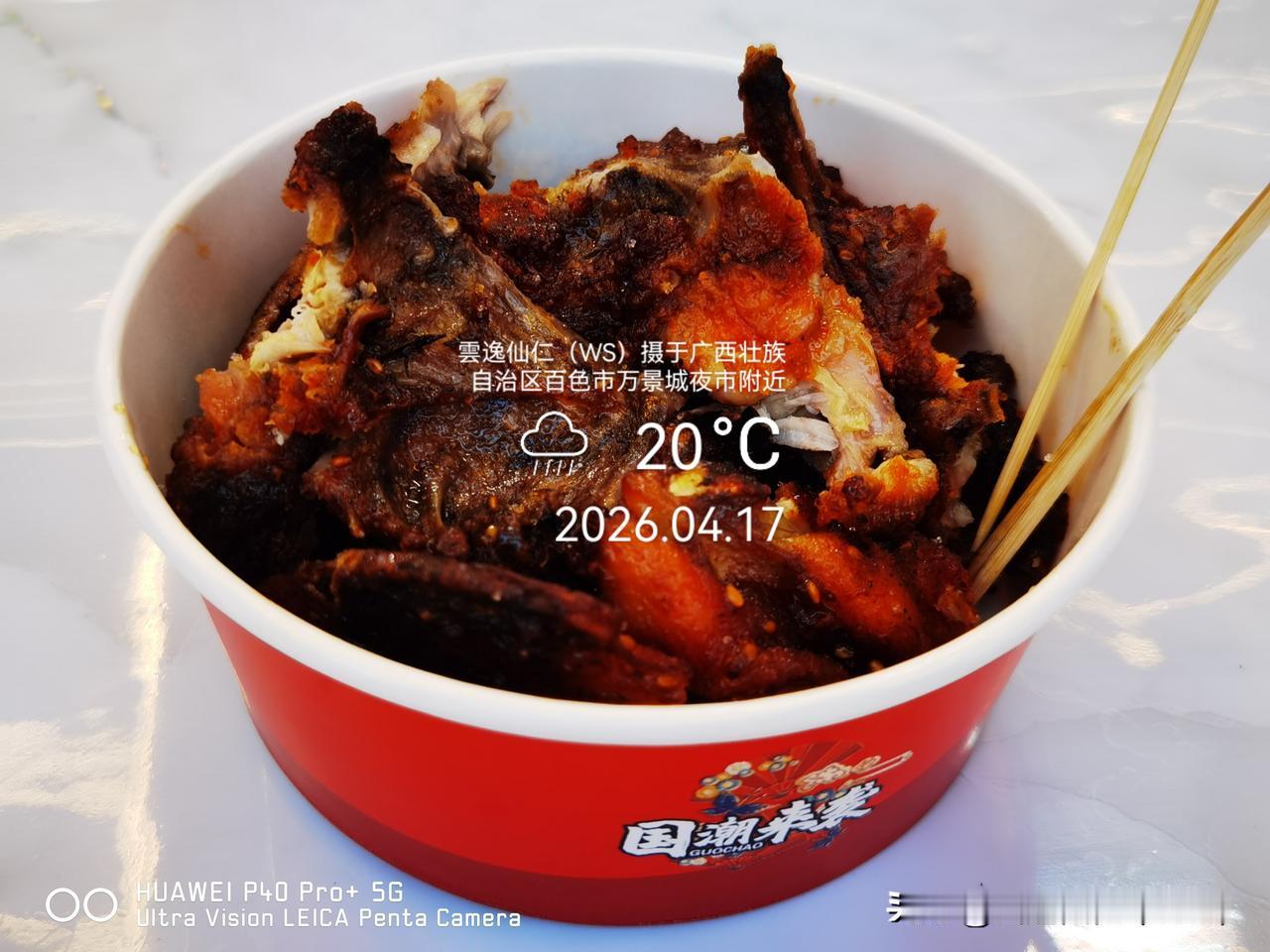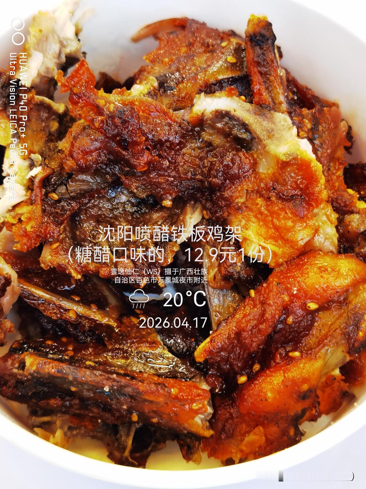 旅居生活记录(9551)广西壮族自治区百色市(237)品尝小吃59:沈阳喷醋铁板鸡架(糖醋口味的,12.9元1份)、新鲜车前草甘蔗汁(7元1小杯)、烤新鲜脆皮五花猪肉(16元1条)。