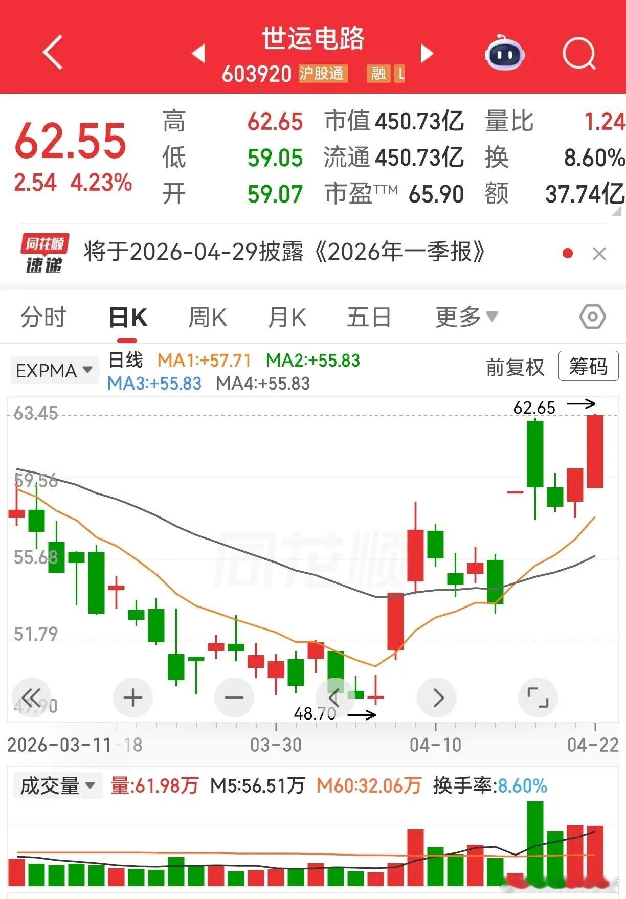世运电路,前面有一个放量长阴线,近两天回升,昨天中阳线,股价略高于前面长阴线。