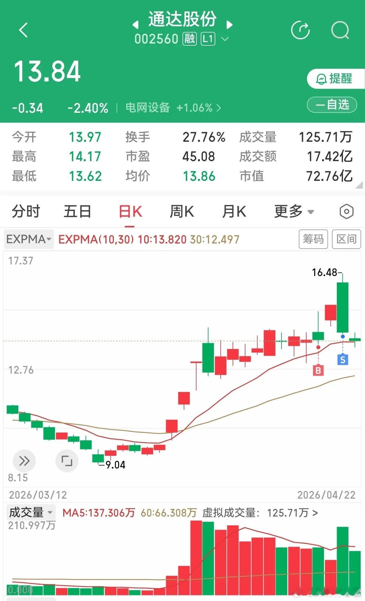 我前两天买过通达股份,昨天有人问这个票怎么处理,我是在赚了一个涨停板后,看到次日放量大阴线,就跑了。