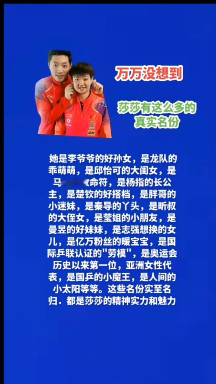 万万没想到莎莎有这么多的真实名份。 她是李爷爷的好孙女,是龙队的乖萌萌,是邱怡可的大闺女,是马琳的救命符,是杨指的长公主,是楚钦的好搭档,是胖哥的小迷妹,是秦导的丫头,是昕叔的大侄女,是莹姐的小朋友,是曼昱的好妹妹,是志强想换的女儿,是亿万粉丝的暖宝宝,是国际乒联认证的"劳模",是奥运会历史以来第一位亚洲女性代表,是国乒的小魔王,是人间的小太阳等等。 这些名份实至名归,都是莎莎的精神实力和魅力。