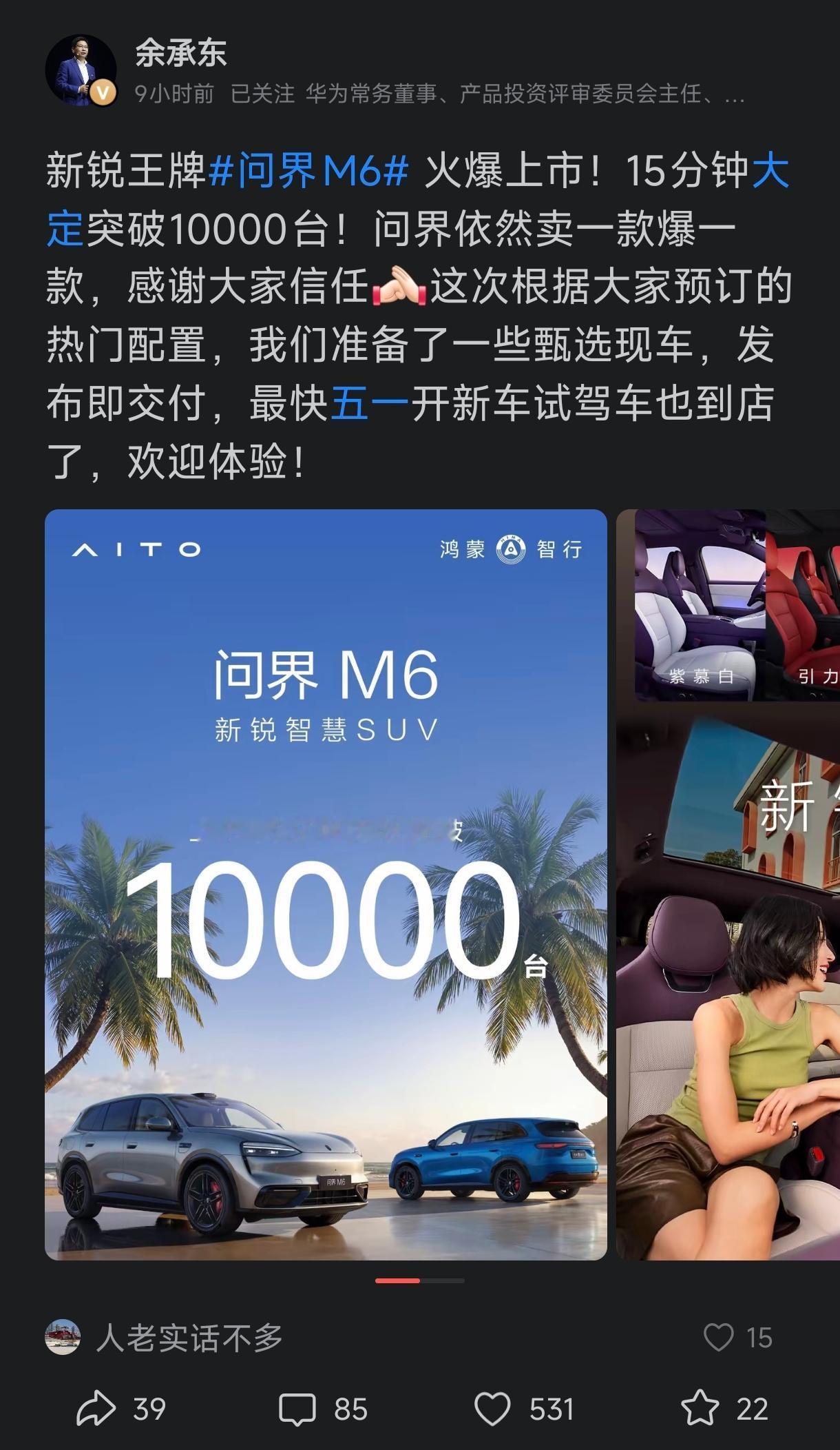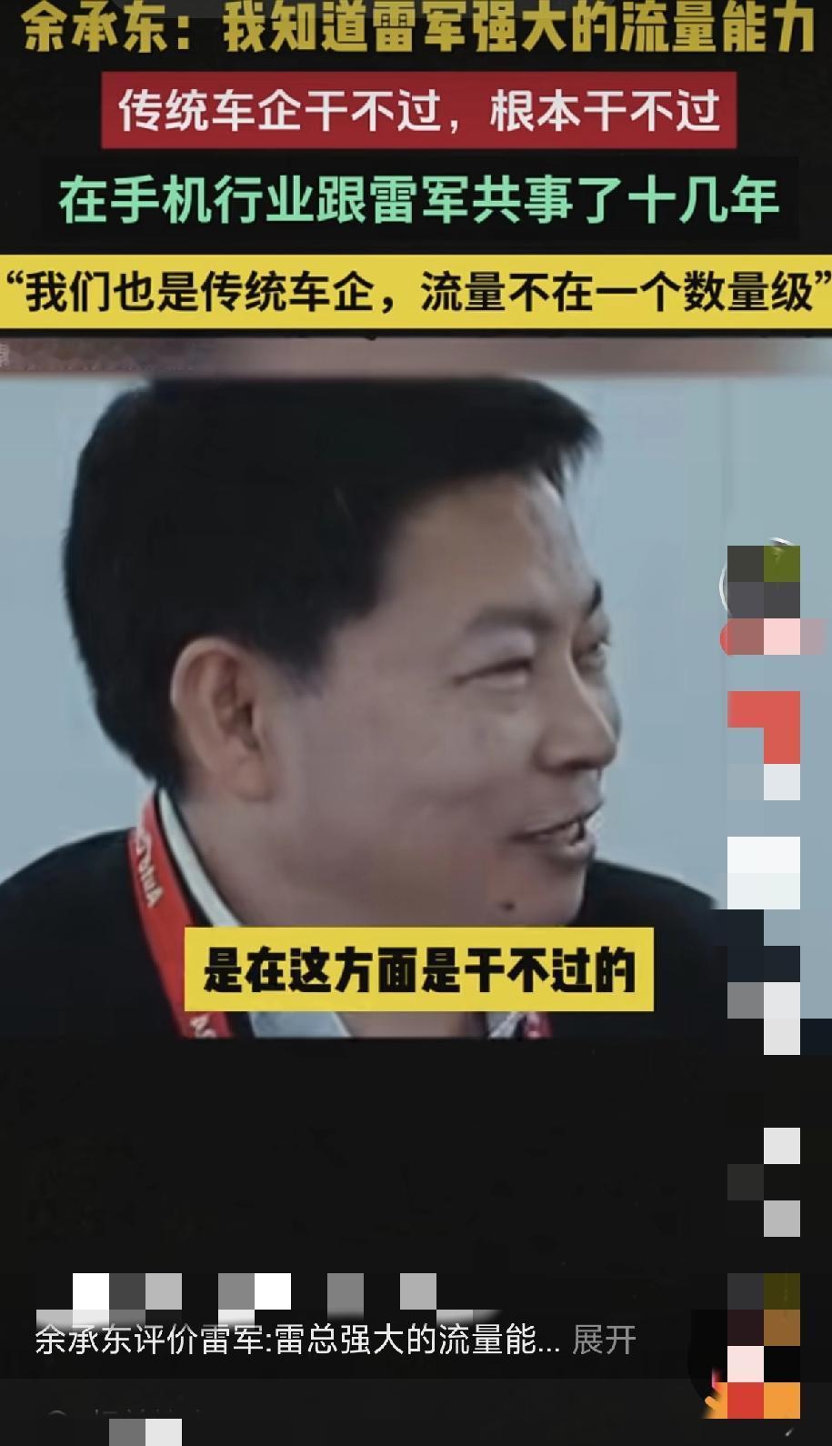 余承东有点谦虚过头了,我看他刚发的文章说给问界销量站台15分钟大定10000台。这就说明余承东的影响力和流量一点也不差。之前他说,小米雷军强大的流量能力传统车企根本干不过,我们在手机行业跟雷军共事十几年,我对他是非常的了解,他作为小米的创始人亲自下场,那个强大的流量能力会带来产品的迅速热销,我们根本是干不过的,都不在一个数量级。但是我们的优点和自信的地方是在于智能驾驶还是领先的。 雷军的营销能力确实无人出其左右,但是余承东在我看来一点也不差。营销确实是会起到非常大的助力作用,但是最终还是要靠产品本身说话。 问界为什么15分钟能大定10000台?为什么没有雷军的营销流量还能这么热销?我觉得固然有华为和余承东的加持有关。但最重要的还是产品突出,赢得了消费者的青睐。 商品终归是商品,它的第一属性是实用,好用,用户认可后的口碑相传这个流量价值也是无法估量的,显然华为问界做到了。