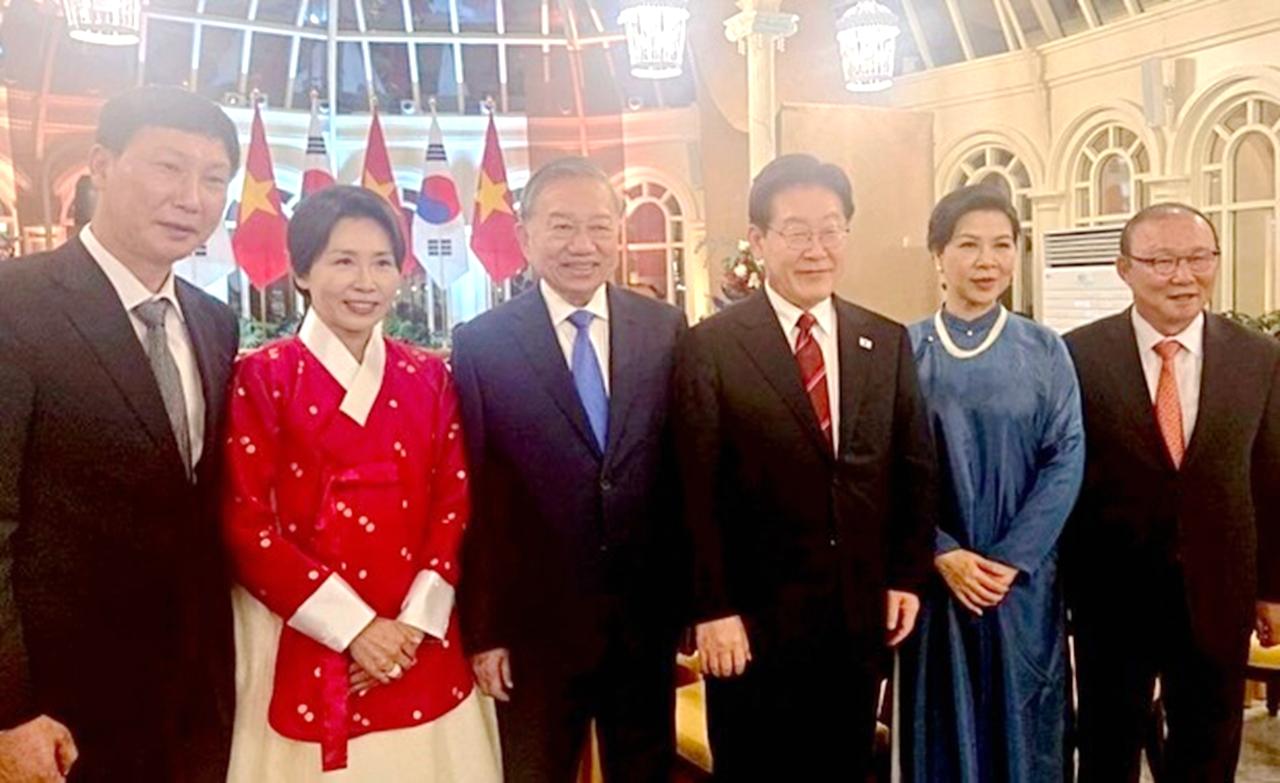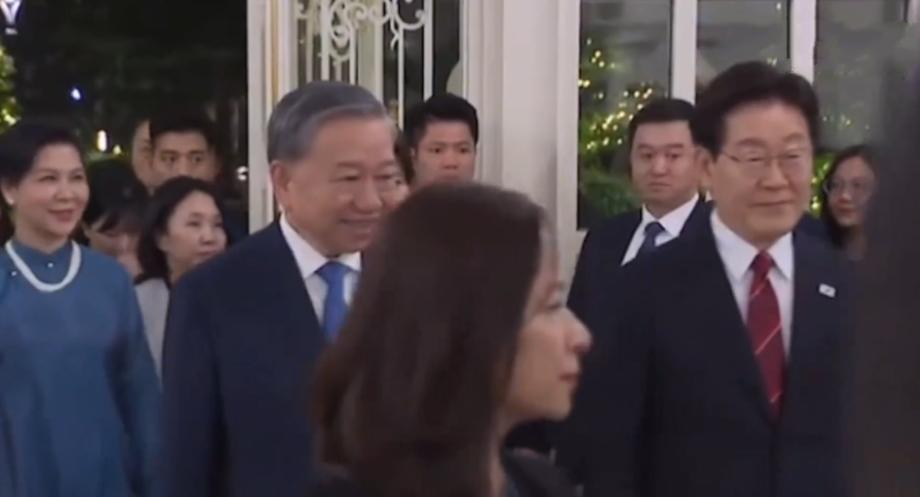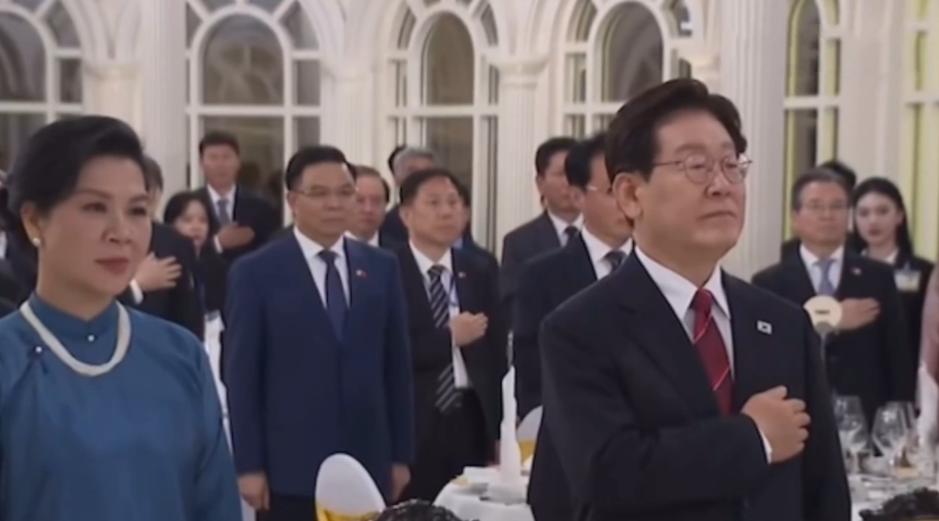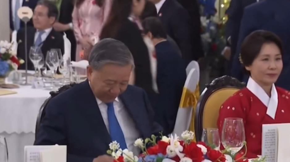 苏林为韩国总统李在明举行国宴,越南第一夫人穿雾霾蓝奥黛长裙超精致端庄! 4月22日,苏林为到访的李在明夫妇举行了高规格的欢迎仪式,同时还给李在明夫妇举行了隆重的国宴,在国宴上不仅韩国总统李在明夫妇过来了,很多韩国财阀们也来了,三星会长李在镕也跟着李在明访问越南了,记得李在明访问北京的时候,李在镕也过来了,当天李在镕在越南国宴上与众人聊天非常抢镜。 当然了韩国夫人金惠景穿红色韩服参加也成为国宴的焦点,红色搭配白色的韩服让金惠景的气质和优雅全部都展现出来了,尤其是她把东方女性温婉、大气、从容的韵味完全烘托出来,得体又惊艳时尚感极高。 虽然金惠景很有气质,不过和越南第一夫人吴芳璃比起来感觉就没有那么端庄了,从曝光的画面我们可以看出,当天越南第一夫人吴芳璃穿雾霾蓝的奥黛长裙亮相,和韩国第一夫人金惠景浓烈艳丽的色彩相比,越南第一夫人自带沉静、雅致、大气的高级质感,在暖光室内场景里,温柔又醒目视觉舒适度拉满,完美衬托东方女性温润端庄的气质。虽然颜色没有韩国夫人那么鲜艳,可是气质和魅力这方面显然是越南第一夫人更胜一筹。另外越南第一夫人还搭配了珍珠耳坠,温润的珍珠中和了蓝色的沉静冷感,瞬间提亮穿搭、增添贵气。 可以说这次越南第一夫人穿的不仅贵气端庄,还很符合自己的年龄,整体上一点也没有浮夸又兼顾舒适得体,真的是太绝了,不过苏林看起来有点没有精神,不知道是不是年龄大了,一天参加这么多活动,精力上应该不够用了。