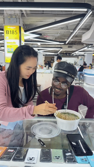 外国友人吃拉面不会用筷子? 旁边的小姐姐上前手把手的教他怎么用筷子吃面。 真是看起来太贴心了!