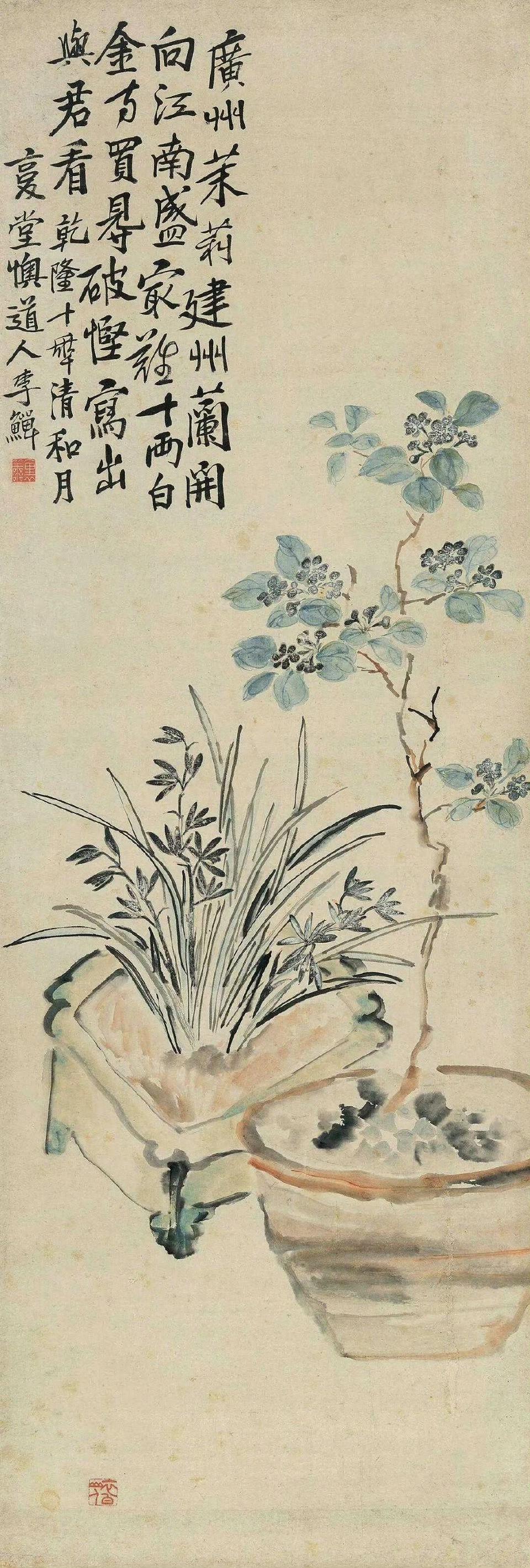 (清 )李鱓作品欣赏《盆花》。款识:广州茉莉建州兰,开向江南盛最难。十两白金方买得,破悭写出与君看。乾隆十年清和月,复堂懊道人李鱓。