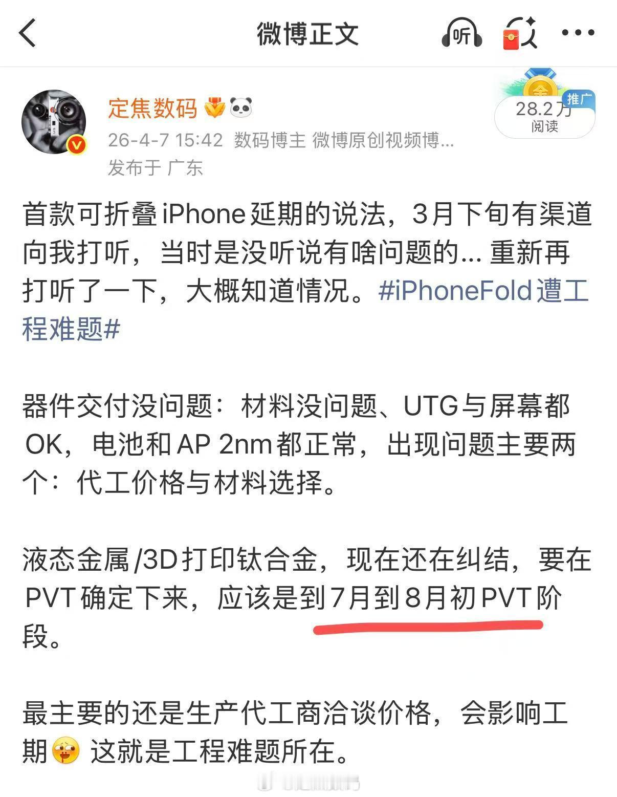 苹果的供应链能力 4月开工 9月足够铺开。这个月过EVT(工程验证),7~8月份过PVT(生产验证),能赶在Q3末-Q4初发布