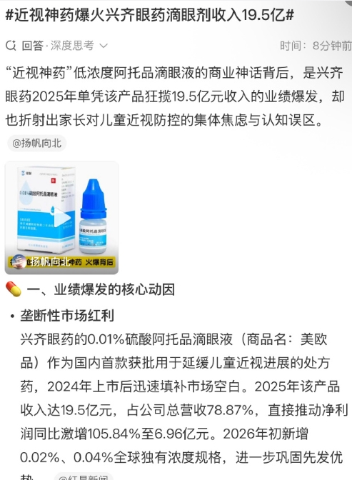 近视神药爆火兴齐眼药滴眼剂收入19.5亿 网友:想起了小时候的OO眼保仪,当时也是声称可以逆转近视,好多家庭都买了,在那年好几百块也不算便宜了,最后也销声匿迹,该近视的还是近视。